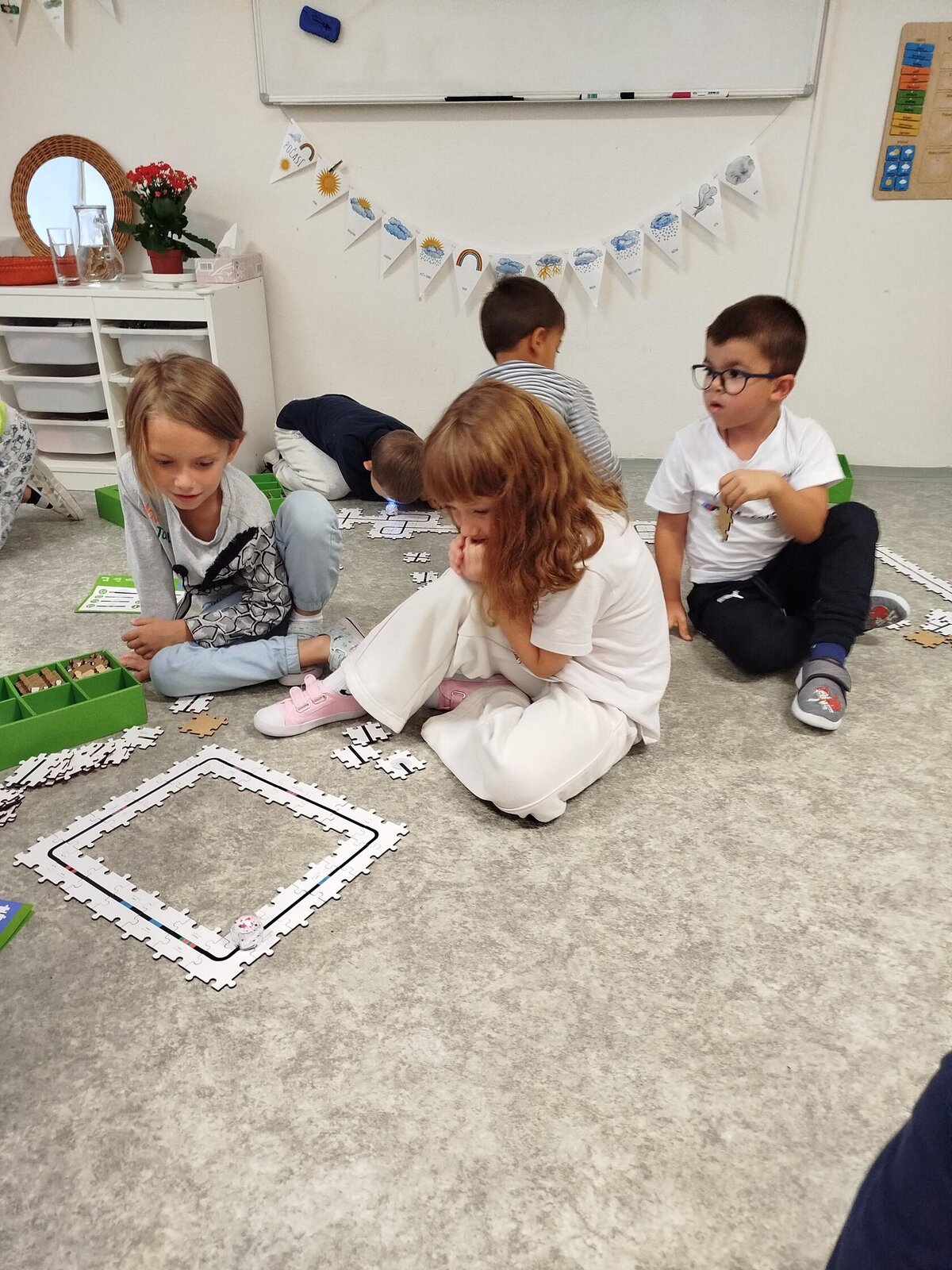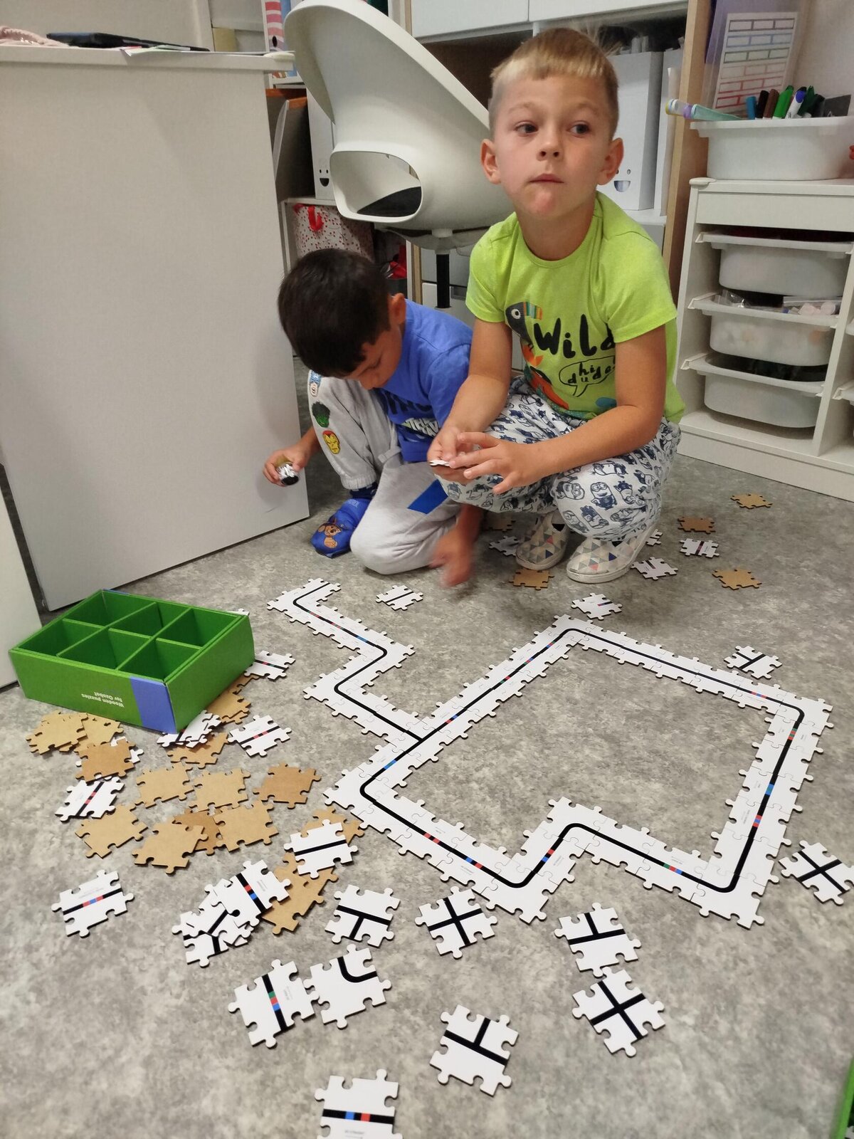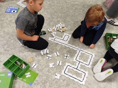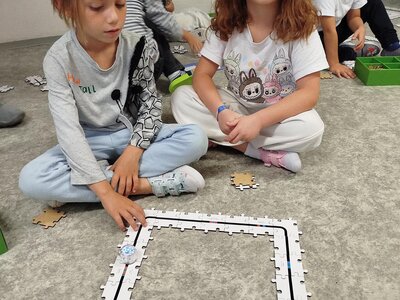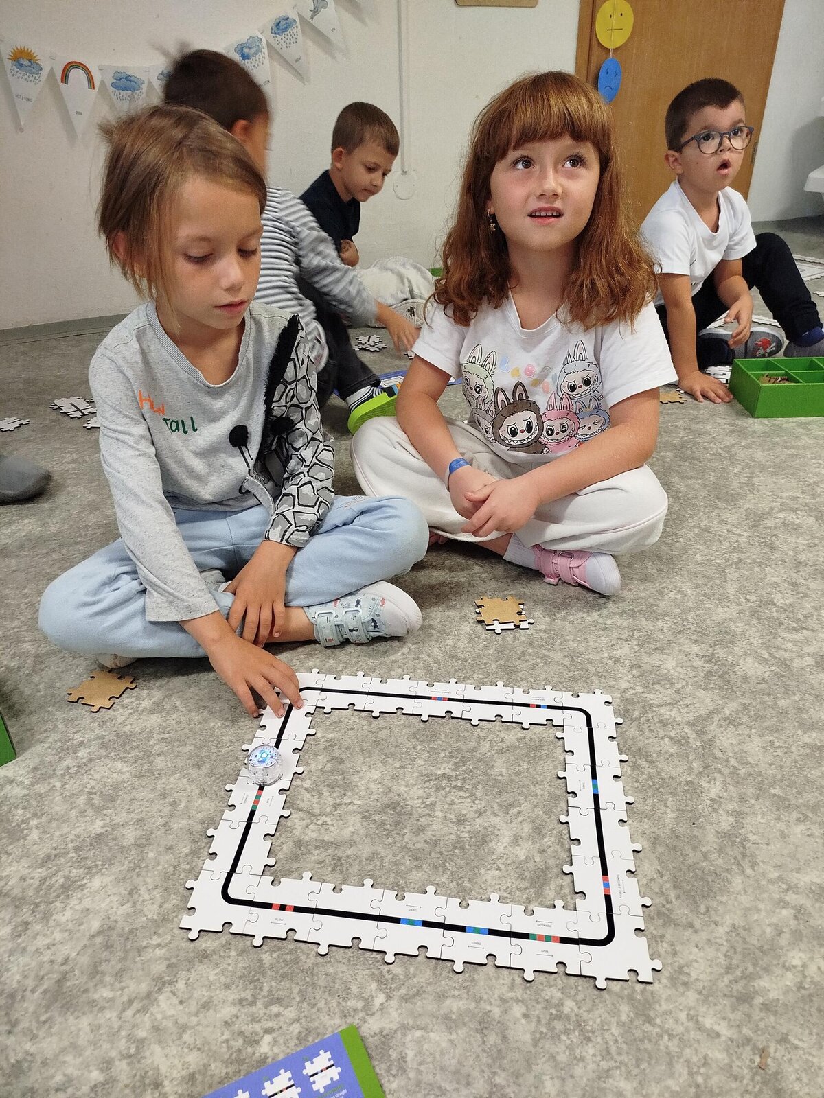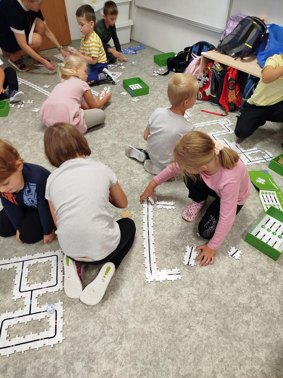 ROBOTIKA - ing. K.MACUROVÁ / ukázky programování robota na tabuli, skládání dráhy pro roboty z puzzlí/.