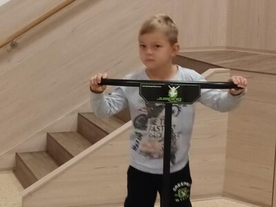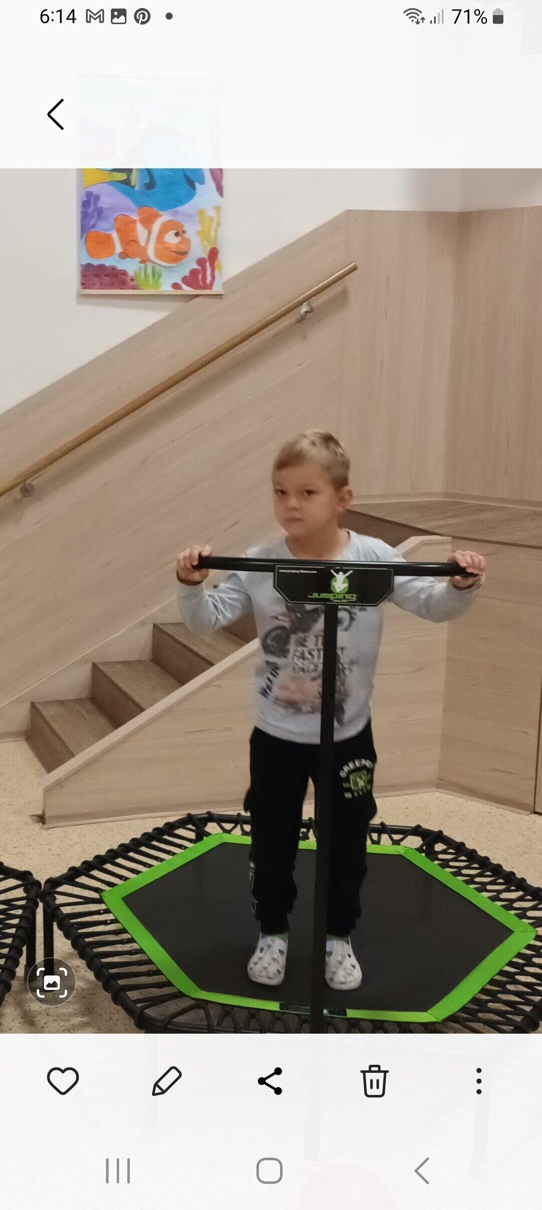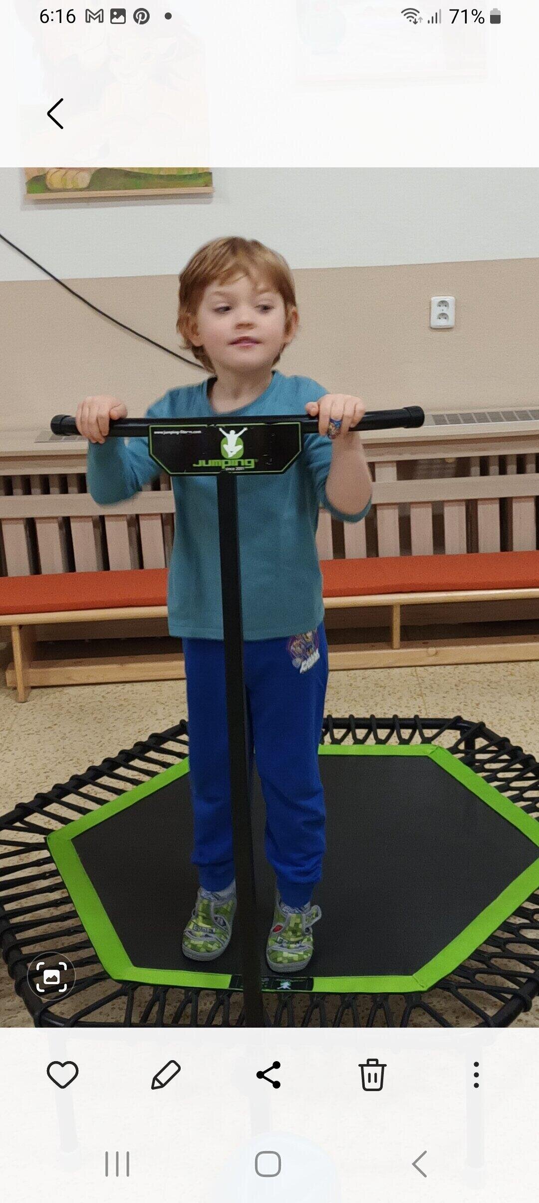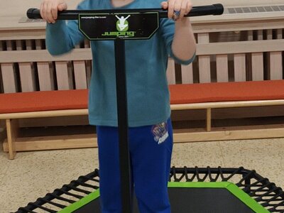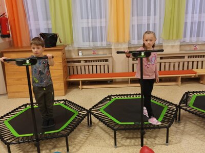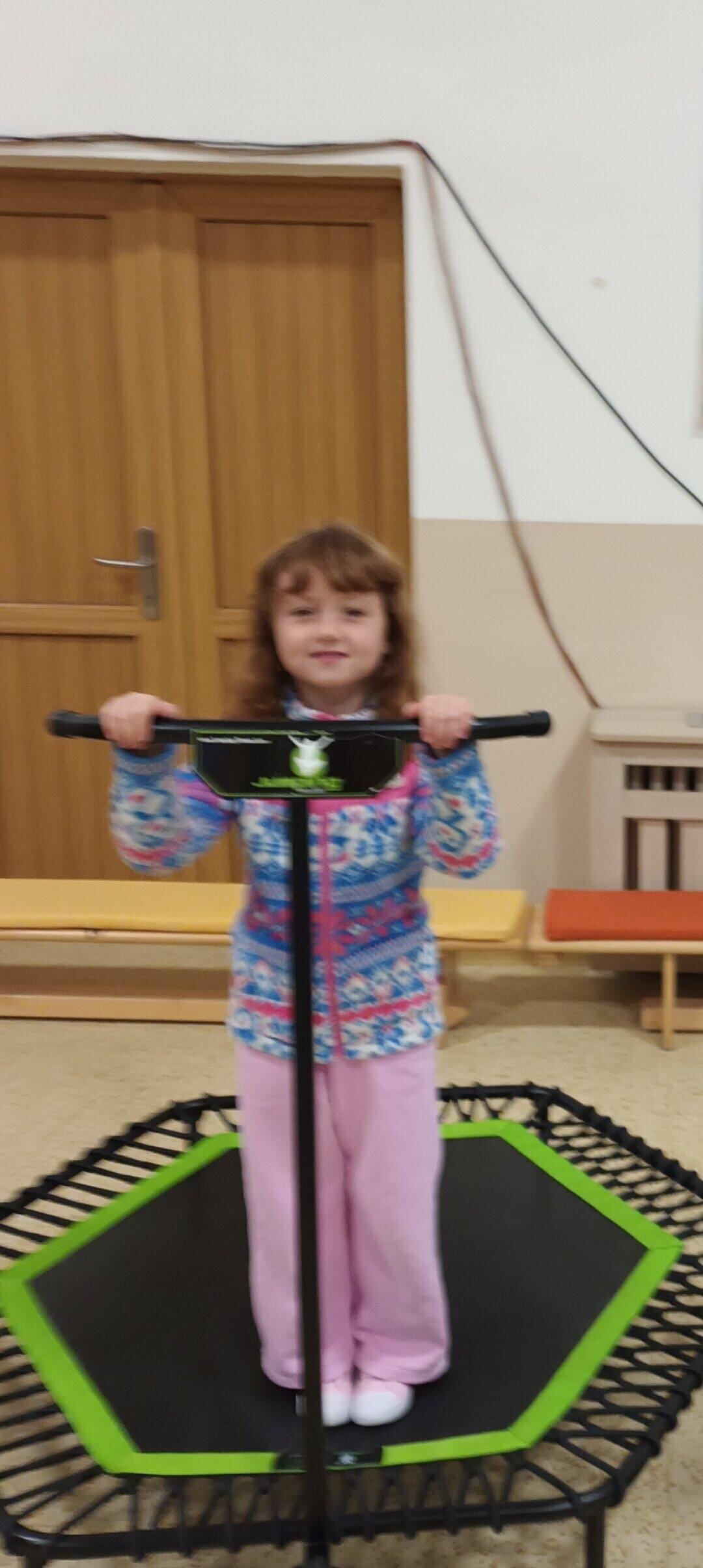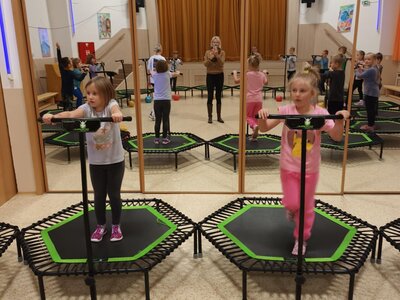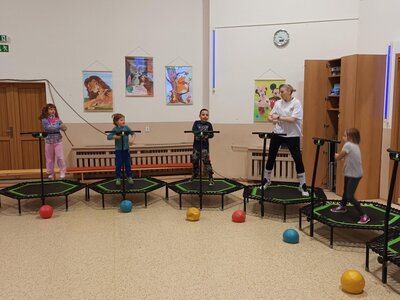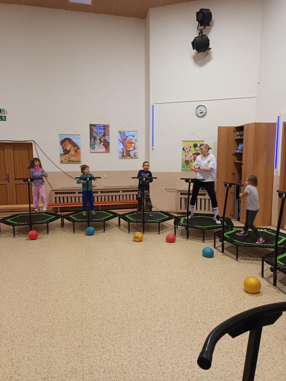 Všichni se moc těšili a hned od začátku panovala skvělá nálada. Nejprve p. lektorka ukázala dětem, jak správně a bezpečně nastoupit a skákat na trampolínkách. Děti si vyzkoušely různé druhy poskoků, cvičení na rovnováhu za doprovodu svižné hudby. Nechyběl smích, nadšení a radost z nové aktivity.