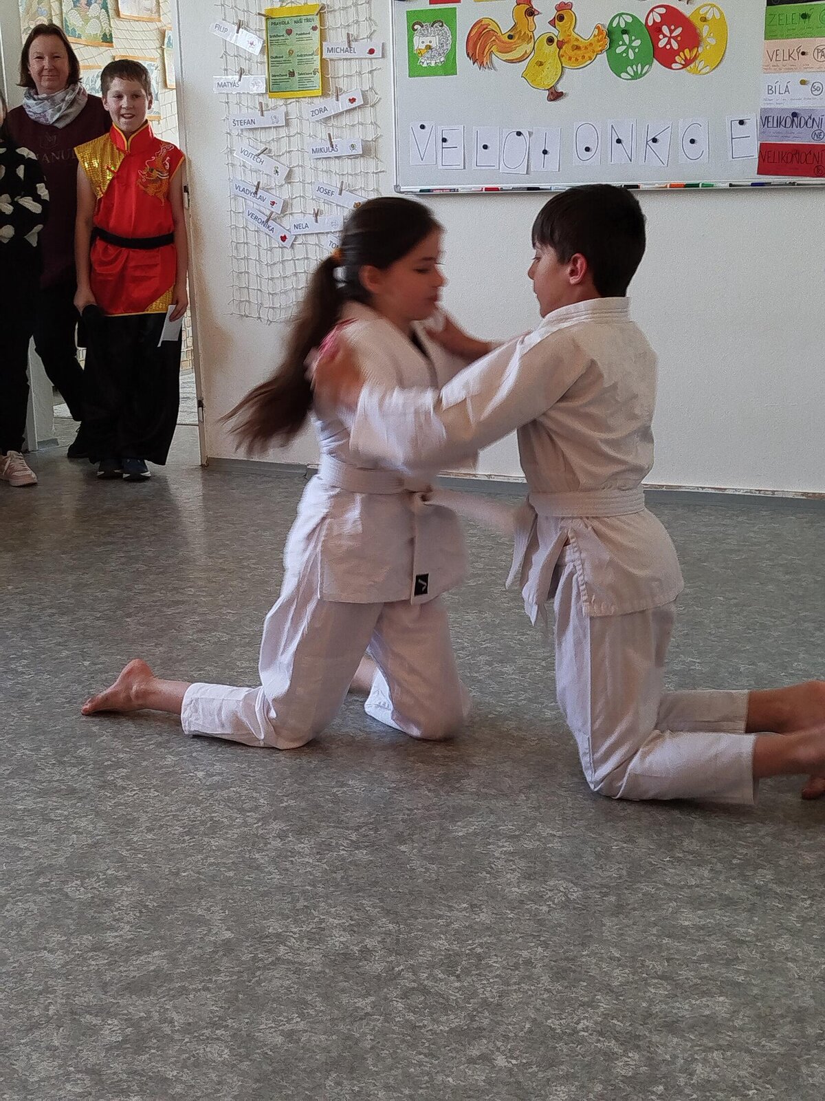 Děti zpívaly, recitovaly, tančily moderní tance. Měli jsme možnost vidět ukázky juda a kung fu. Na závěr si ještě děti z Přípravky procvičily hlavičky. Dostávali od žáků hádanky se sladkou odměnou. I naši předškoláci zazpívali školákům jarní písničky.
