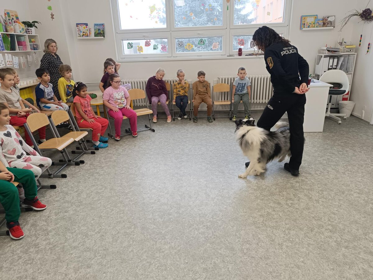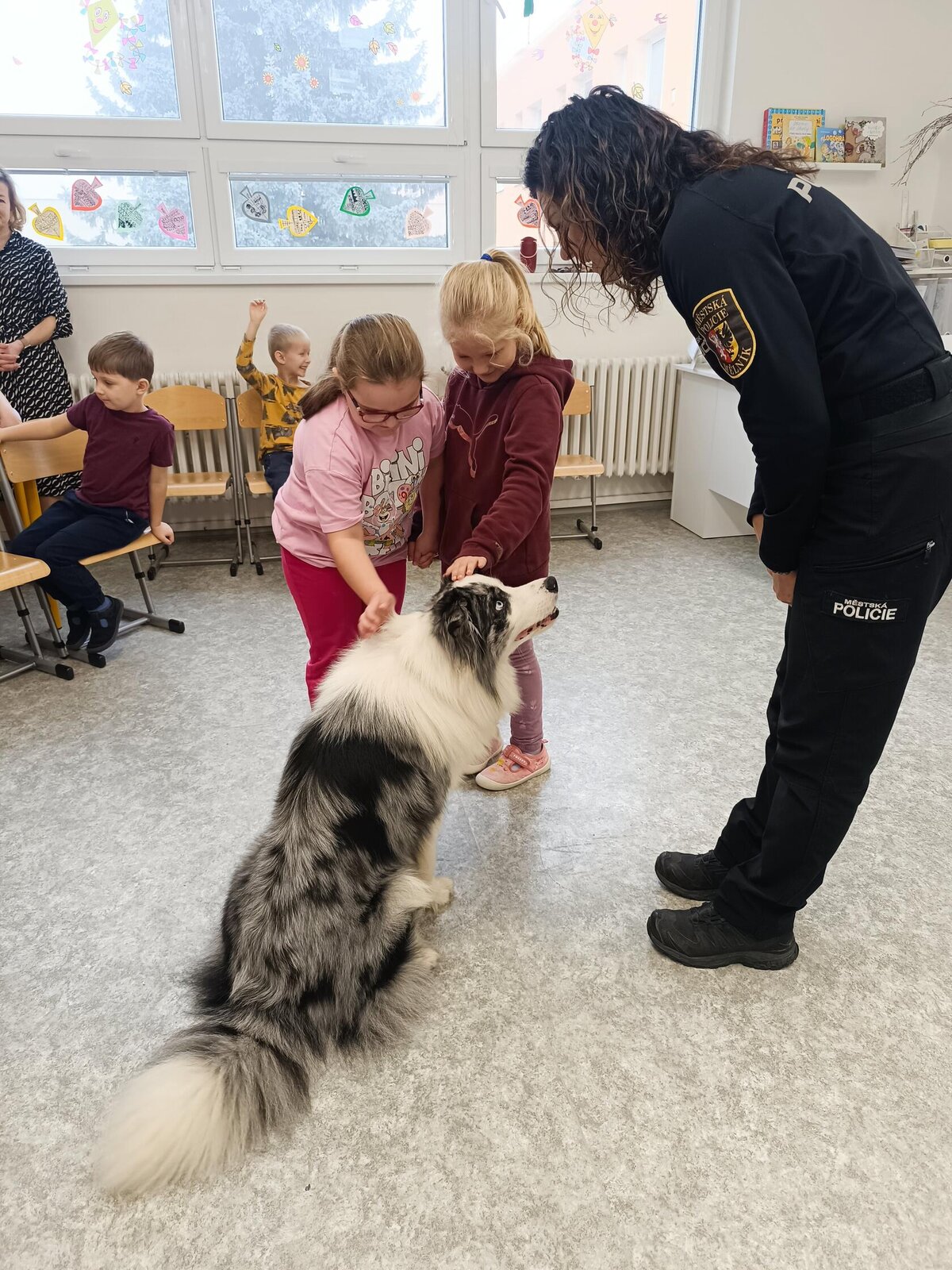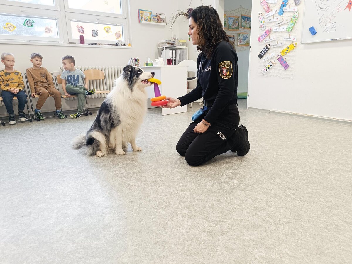 Paní policistka se svým mazlíčkem Mannym nám přišli ukázat, co vše vycvičený pejsem dovede. Předvedli nám taneček, Manny správně poskládal barevné kroužky, ale hlavně jsme se dozvěděli, jak se ke psům máme správně chovat tak, aby to bylo bezpečné.