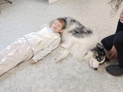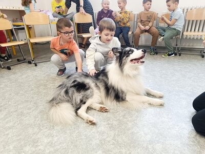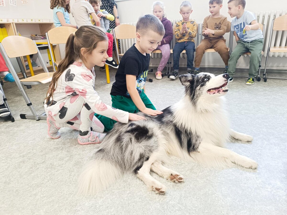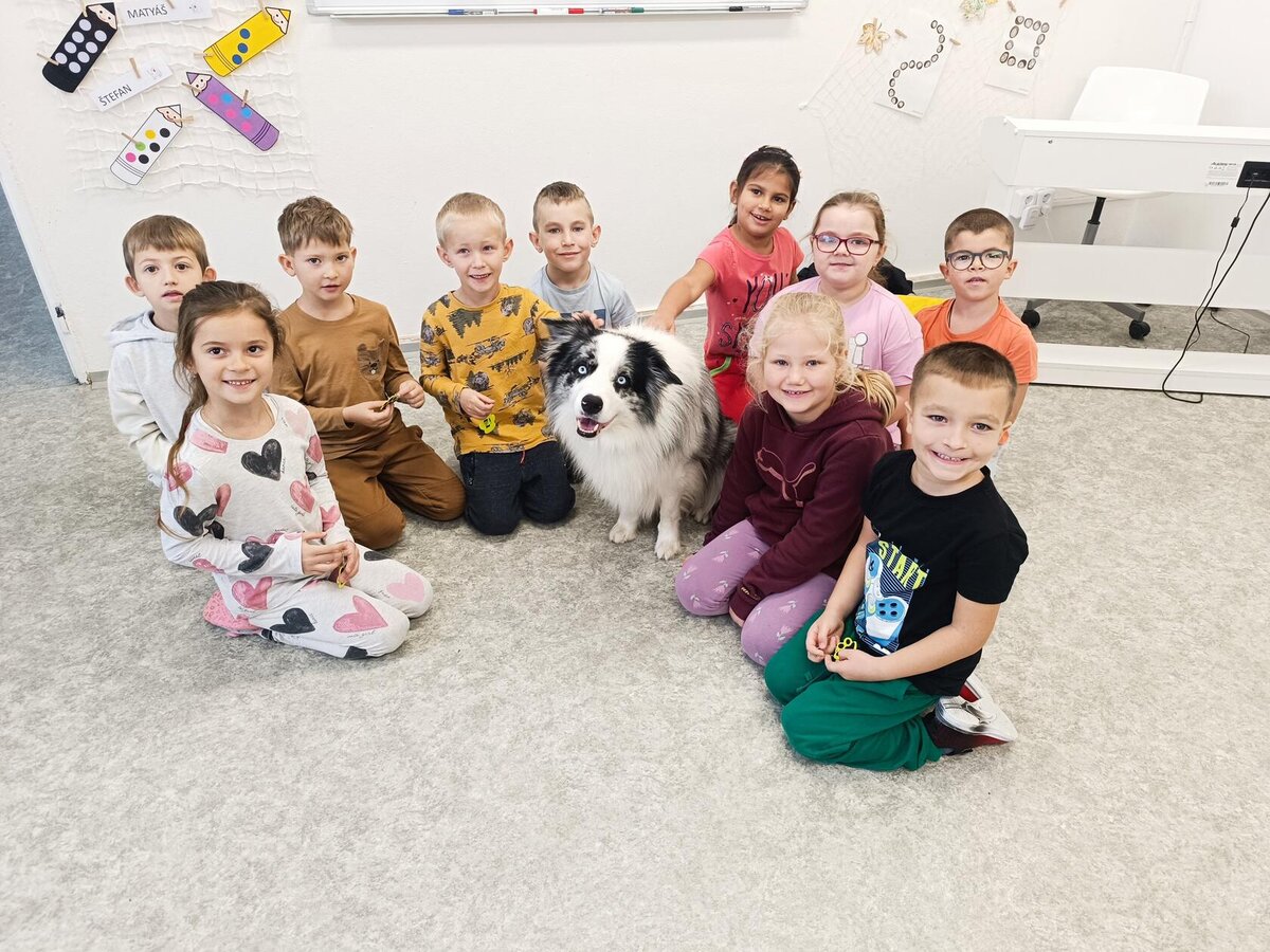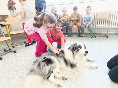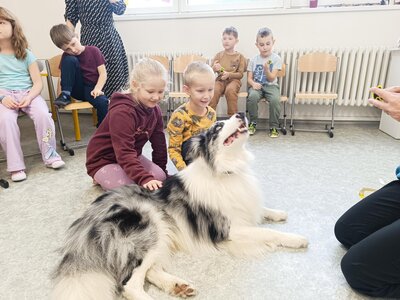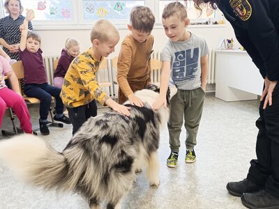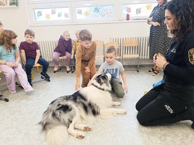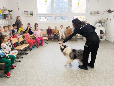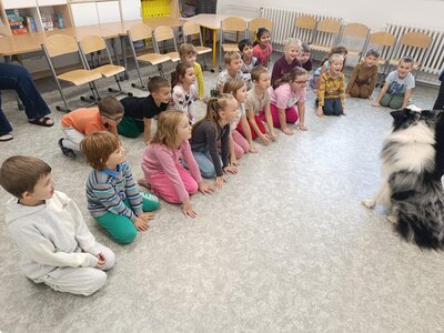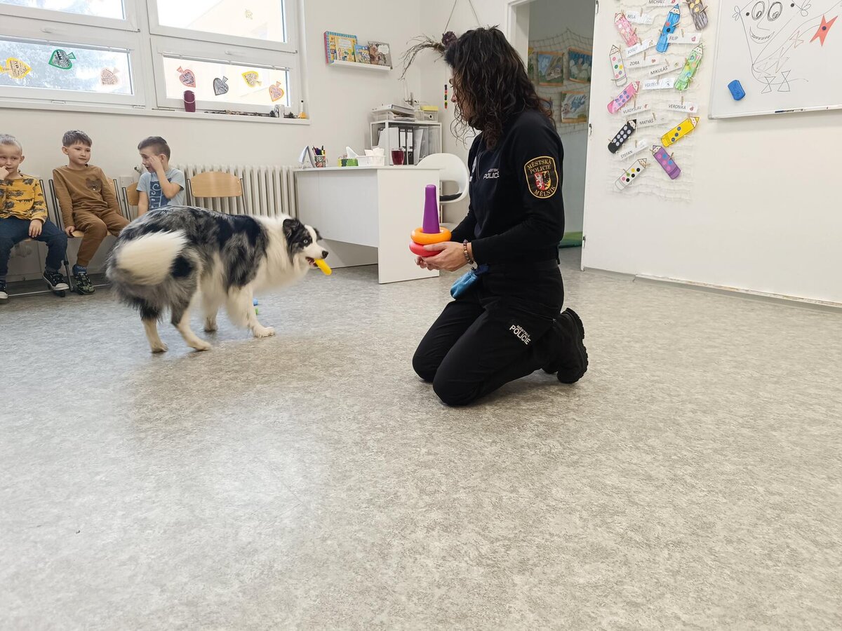 Paní policistka se svým mazlíčkem Mannym nám přišli ukázat, co vše vycvičený pejsem dovede. Předvedli nám taneček, Manny správně poskládal barevné kroužky, ale hlavně jsme se dozvěděli, jak se ke psům máme správně chovat tak, aby to bylo bezpečné.