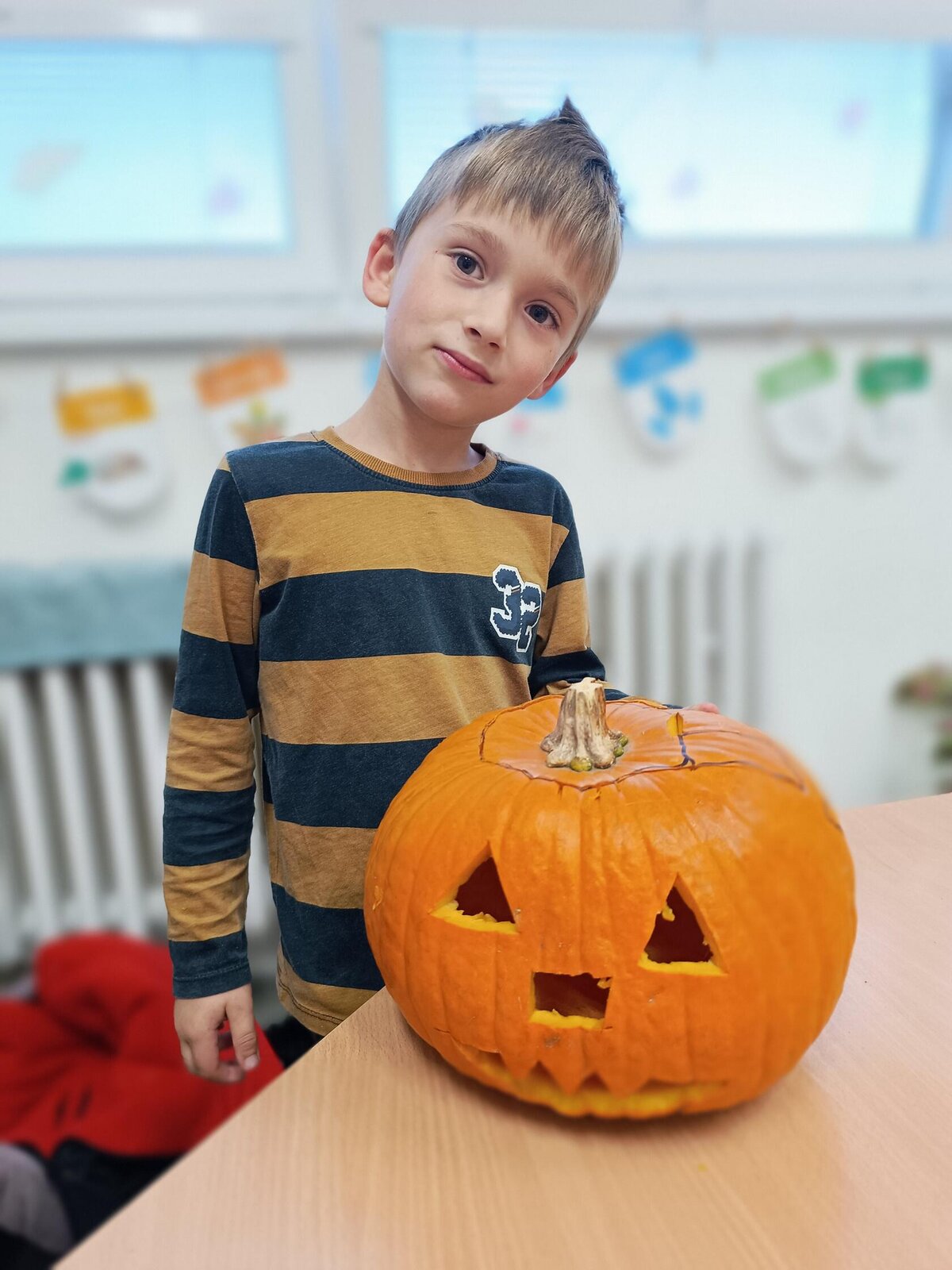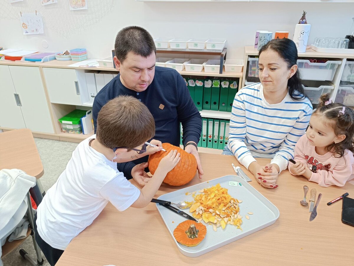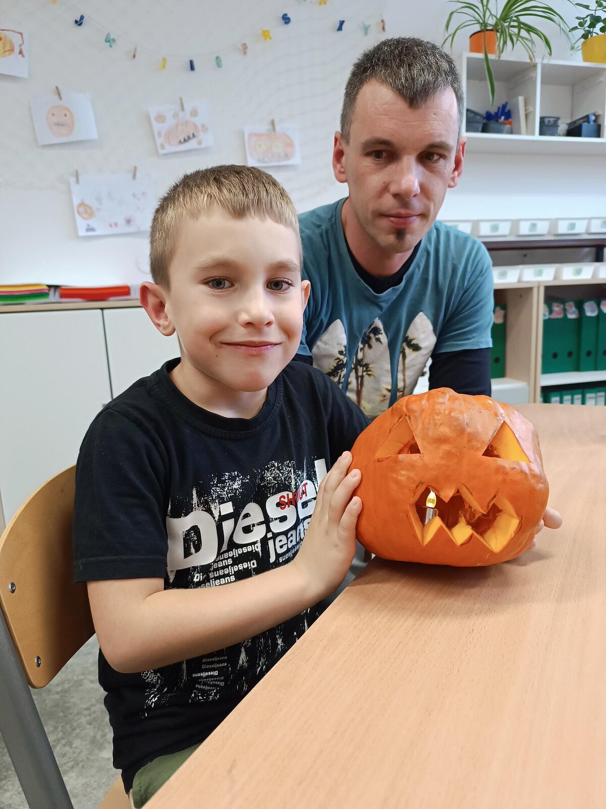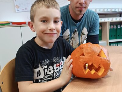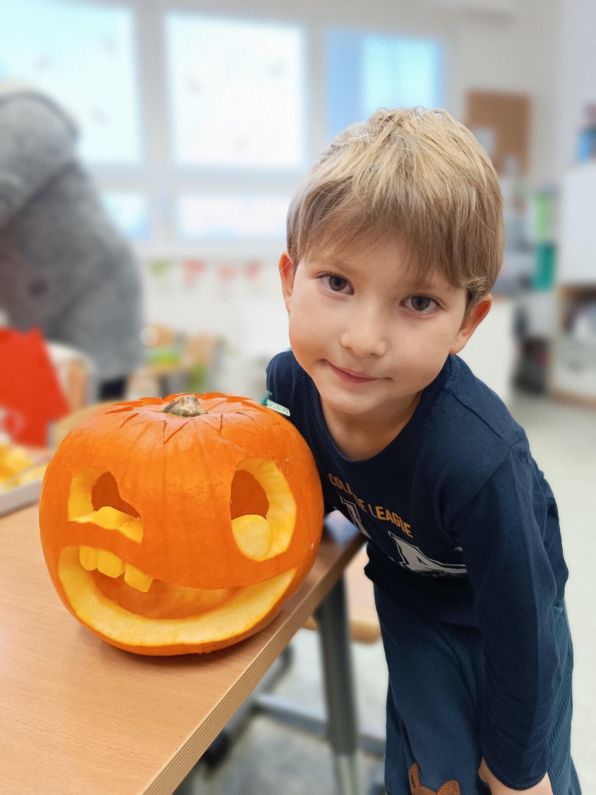 V rámci našeho podzimního týdne věnovaného dýním jsme si užili veselé odpoledne plné tvoření. Děti společně s rodiči vyřezávali originální dýňové bubáčky, kteří nám teď krásně zdobí školu.
