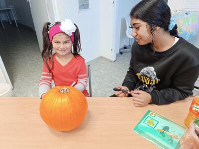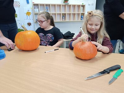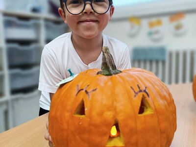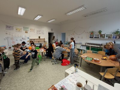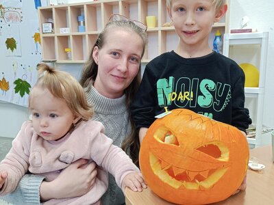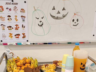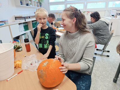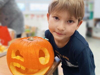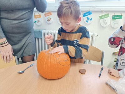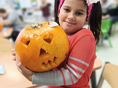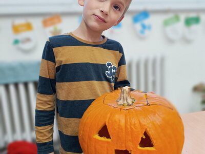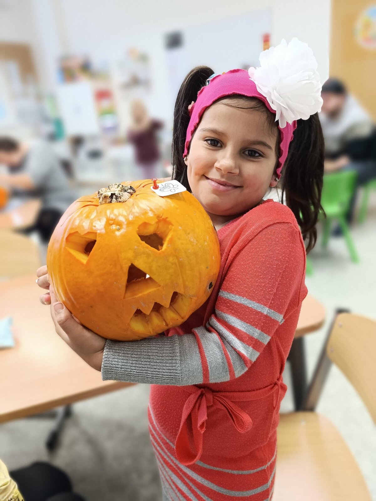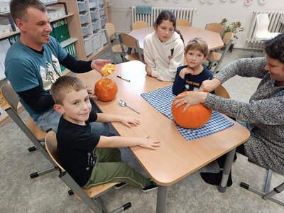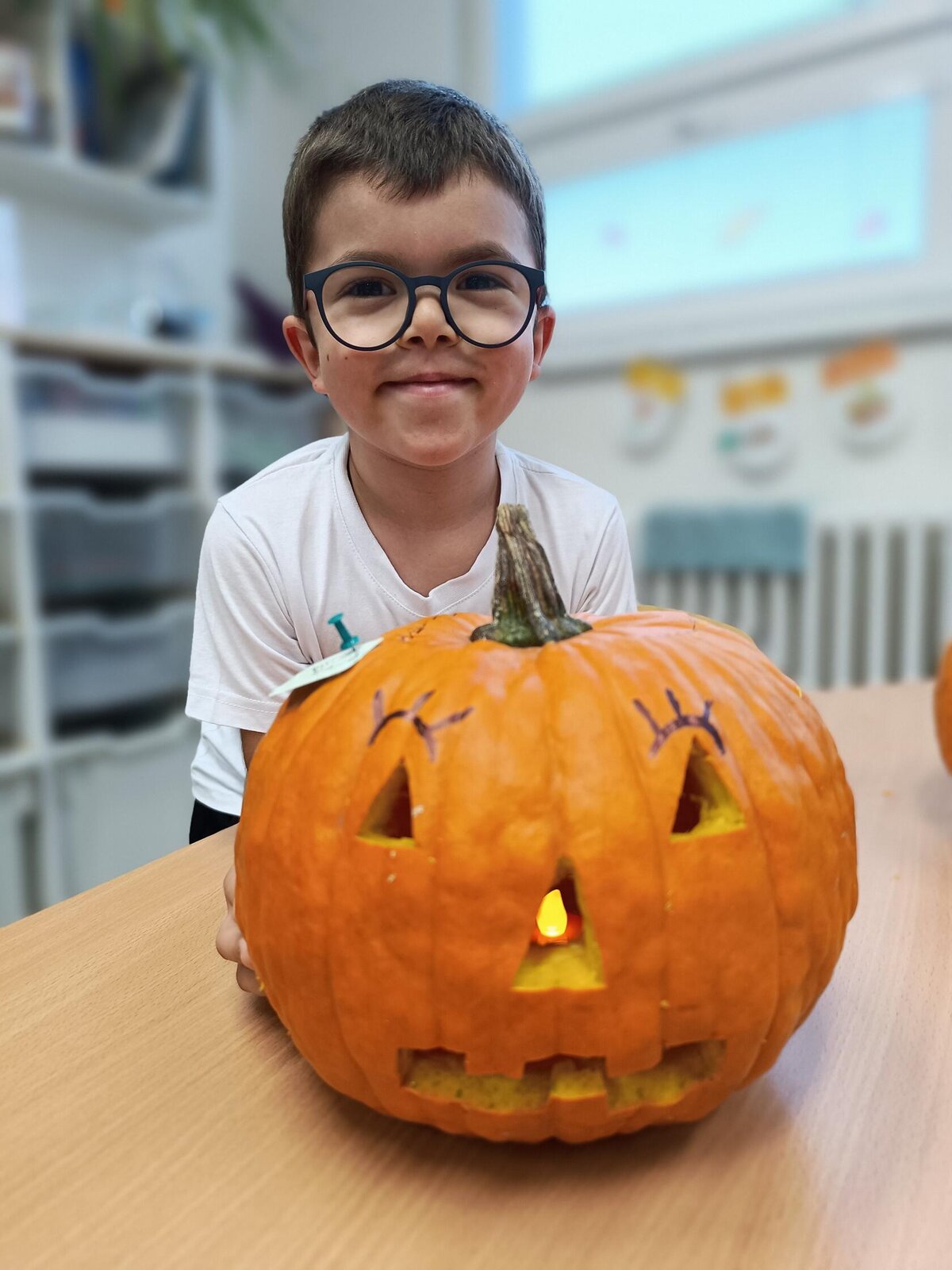 V rámci našeho podzimního týdne věnovaného dýním jsme si užili veselé odpoledne plné tvoření. Děti společně s rodiči vyřezávali originální dýňové bubáčky, kteří nám teď krásně zdobí školu.