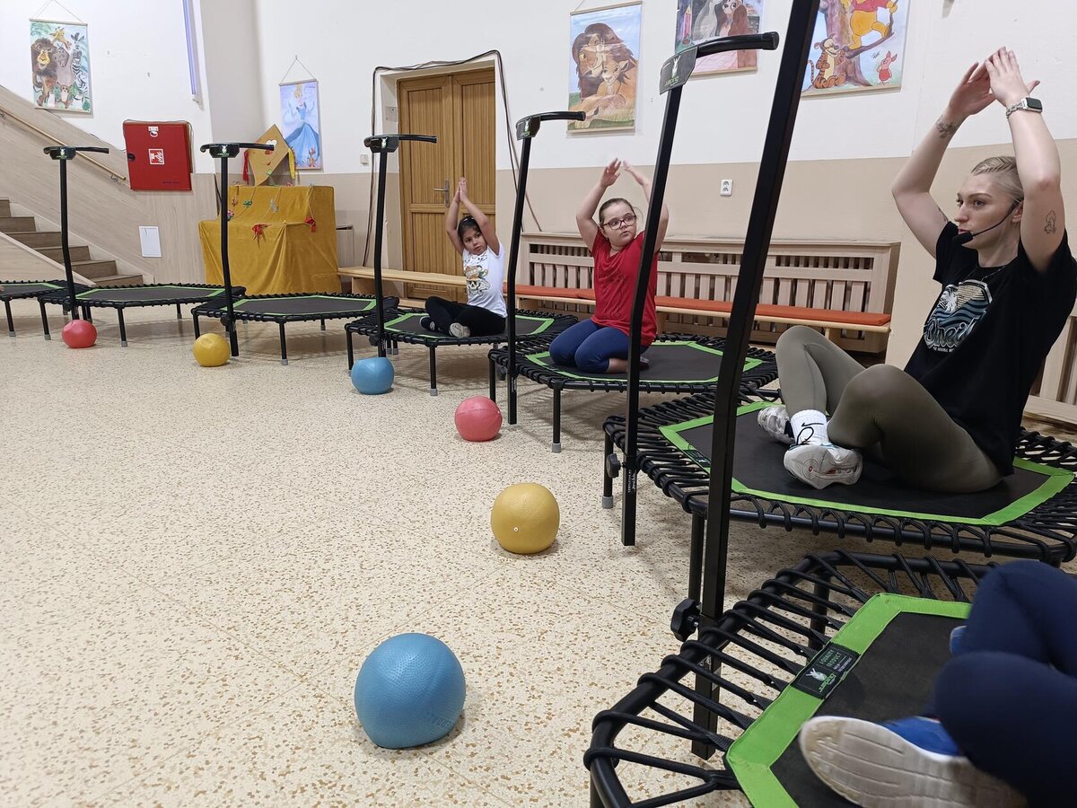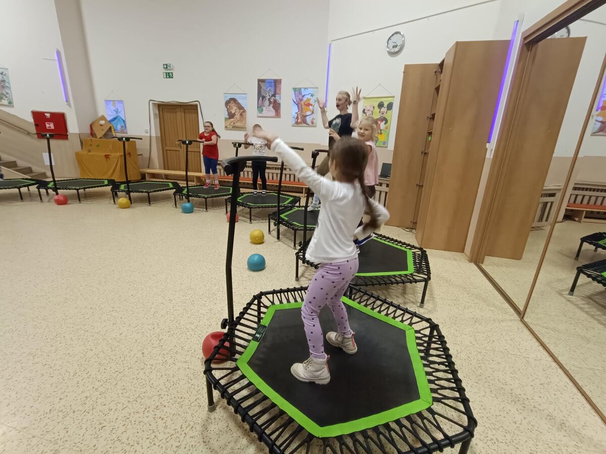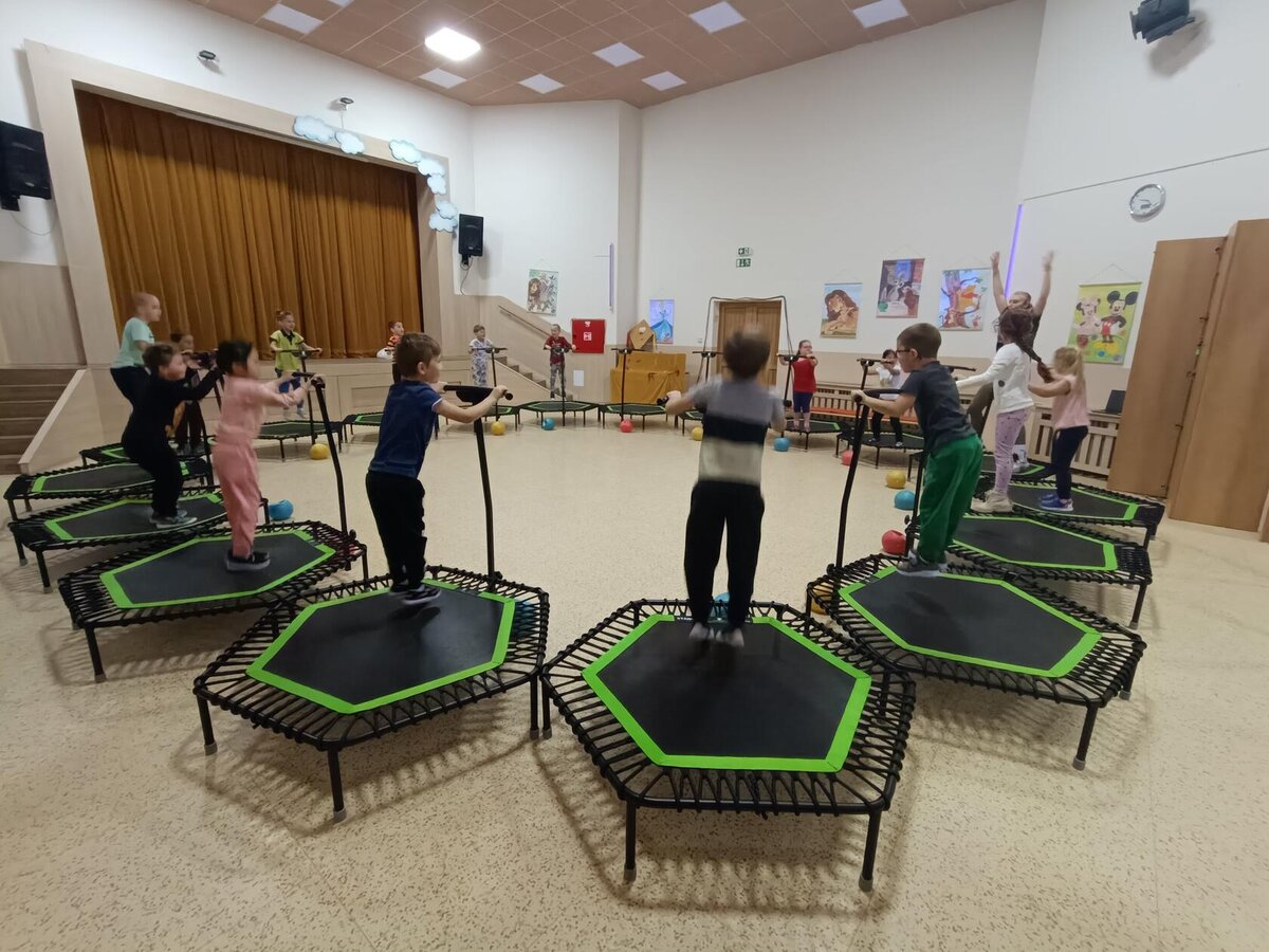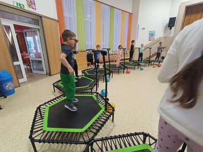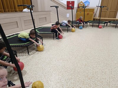 Máme za sebou první lekci trampolín v DDM. Děti si ji moc užily - bavilo je skákat do rytmu, hrát různé hry, přebíhat po trampolinách dokola a dokonce skákat skoro ve tmě - to na nich vše bílé pěkně svítilo.