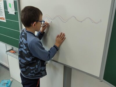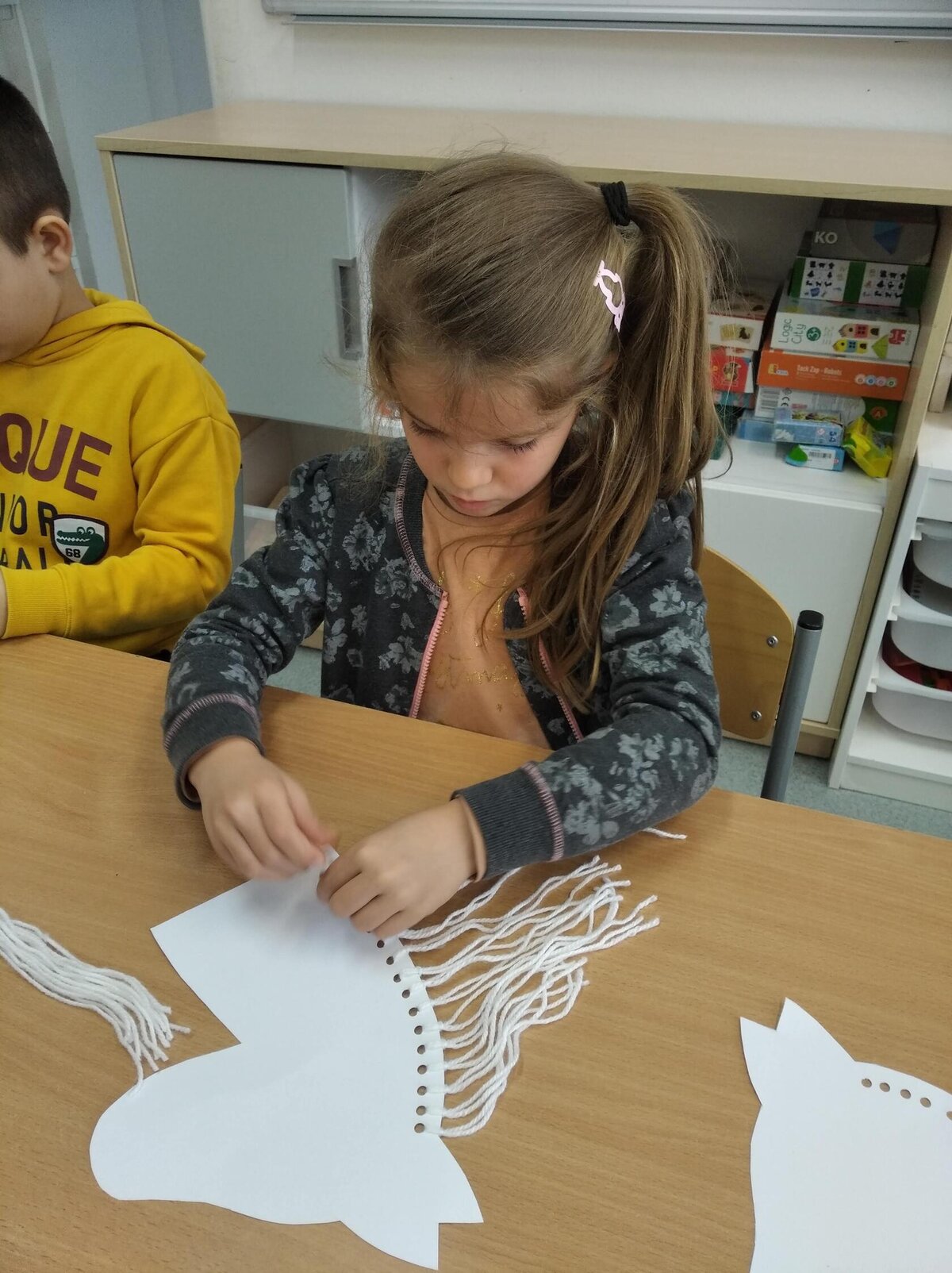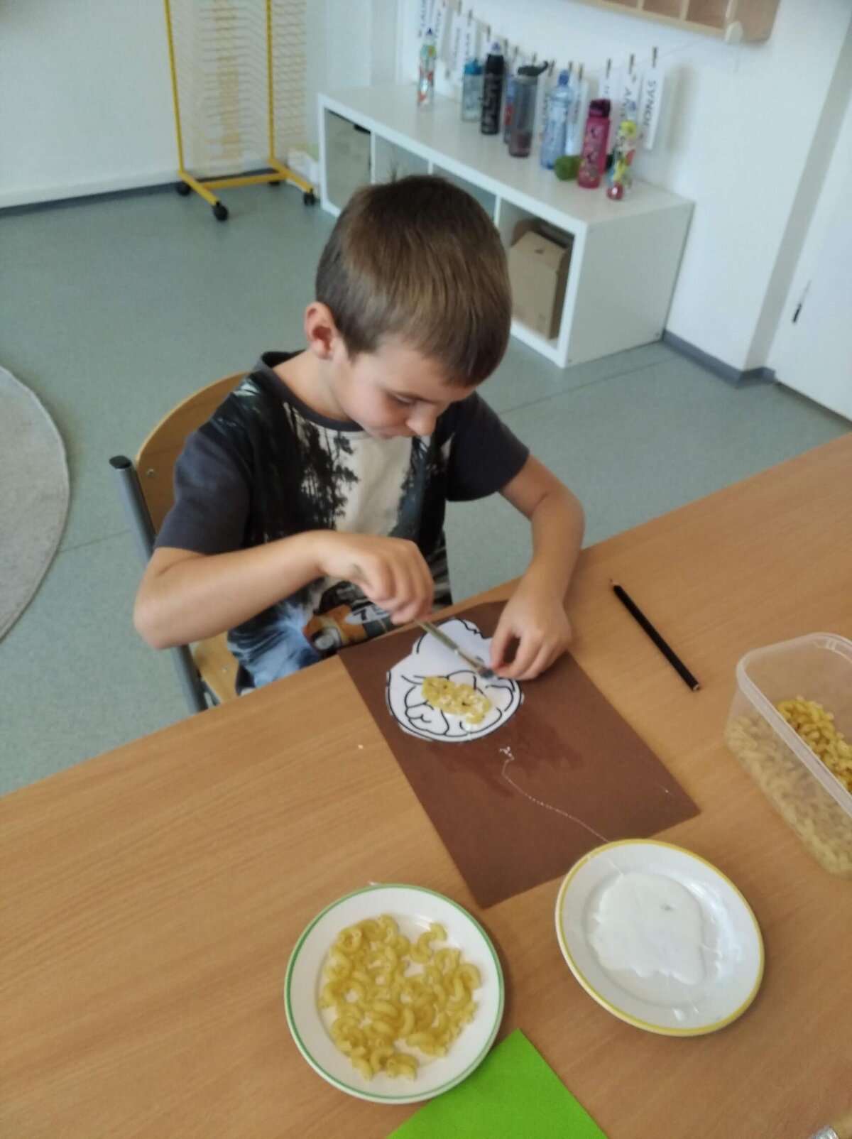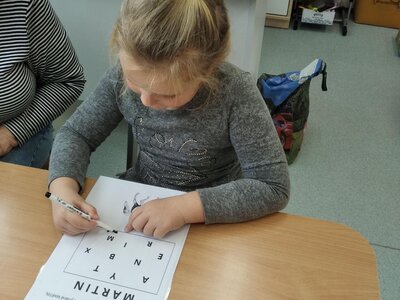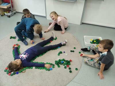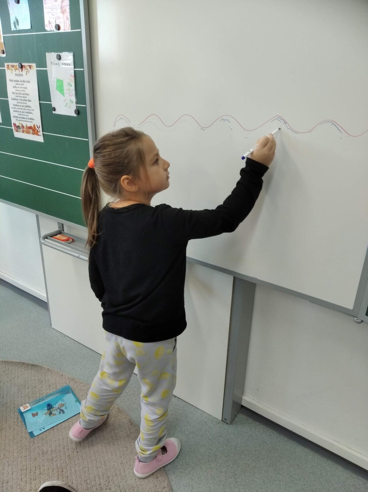 Věnovali jsme se matematickým pojmům, jako je kratší x delší a širší x užší. Také se děti mezi sebou řadily od nejmenšího po největšího. Rozvíjeli jsme řeč, učili se nadřazené a podřazené pojmy a procvičovali porozumění dějové posloupnosti. Zrakové vnímání jsme trénovali dokreslováním částí, které chybí a popisem nesmyslných obrázků. Ve sluchovém vnímání jsme trénovali slabiky, první hlásky a rozpoznávali rýmy. Grafomotoriku jsme procvičovali na velké tabuli, na stíracích tabulkách a na papírech. Nezapomněli jsme ani na prostorové vnímání - kde jsme se věnovali předložkovým vazbám a pojmům nahoře x dole a vlevo x vpravo.