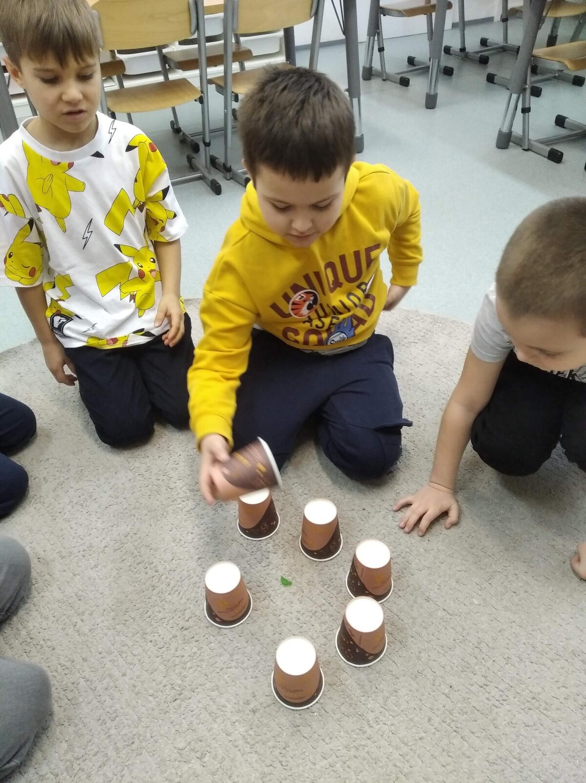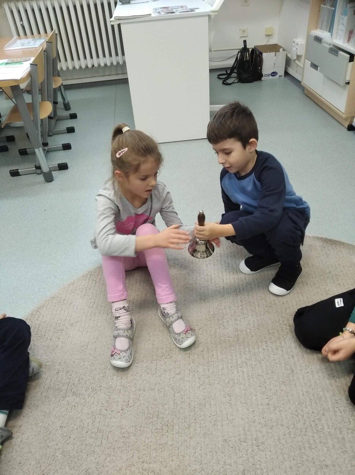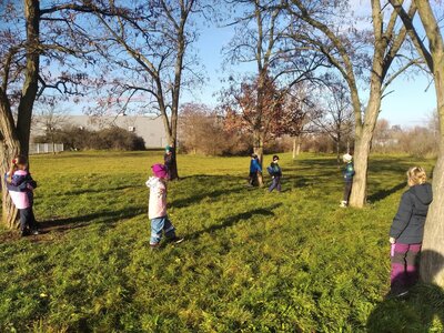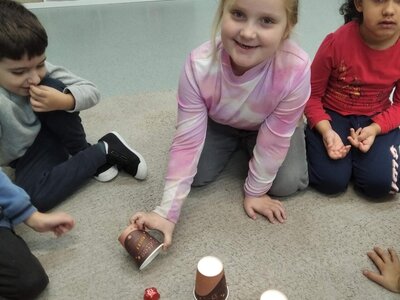 Nechyběl ani pohyb. Běhali jsme, skákali jsme a pilně trénovali na vánoční besídku. Při pohybových hrách jsme se proměňovali v čerty a chytali kamarádům „blešky“ ( kolíčky ) v kožichu nebo si naopak hráli na anděly a pinkali nafukovací míček. Hráli jsme také hry na trpělivost a opatrnost – děti chodily dokola se zvonečkem a nesměly zacinkat. Nebo zvoneček hledaly a ostatní napovídali slovy „samá voda“ nebo „přihořívá“. Venku jsme hráli škatulata batulata, což děti moc bavilo.
