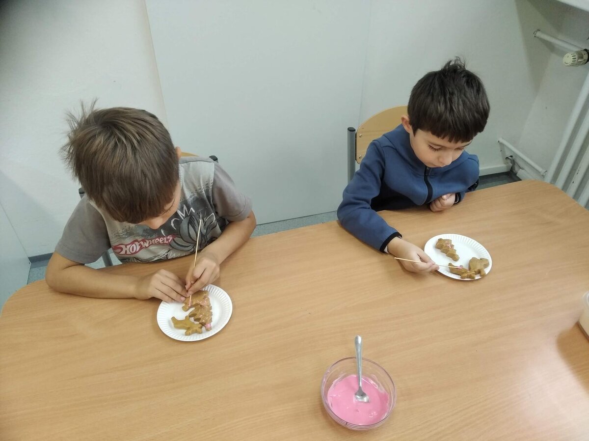 Nezaháleli jsme ani s učením. Ve zrakovém vnímání jsme trénovali barevné řady, hráli Kimovu hru, překreslovali čárky mezi body a dokreslovali chybějící části na obrázcích. Grafomotorické prvky jsme procvičovali na velké tabuli, na stíratelných tabulkách i na papíře. Zaměřili jsme se na čerty a anděly, jednotažky a horní oblouky. V oblasti matematického vnímání jsme počítali rozinky na cukroví, přiřazovali správně počty k puntíkům a počítali pomocí ořechů. Řečové dovednosti jsme rozvíjeli při práci s knížkou a průběžně procvičovali slabiky i počáteční hlásky. Vyzkoušeli si Orffovy hudební nástroje a poznali kouzlo zvonečků, kterému patří vždy jeden tón.
