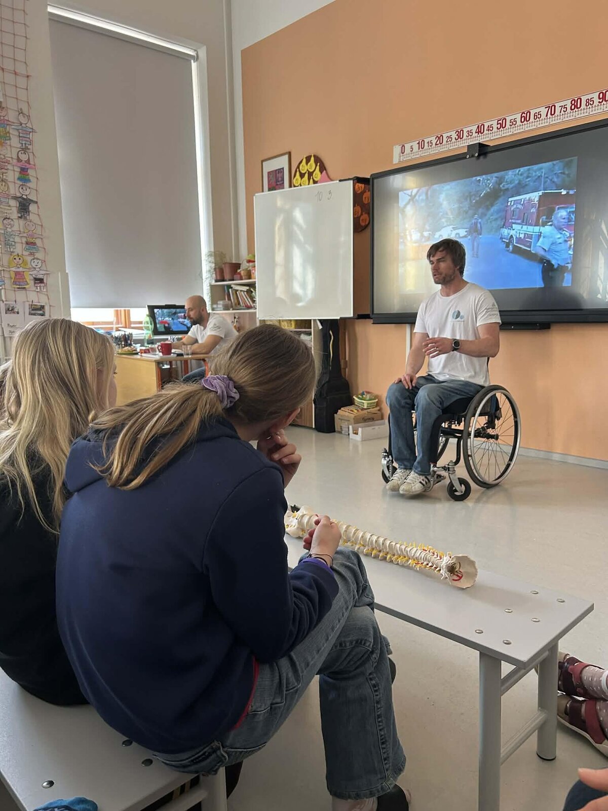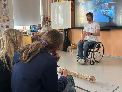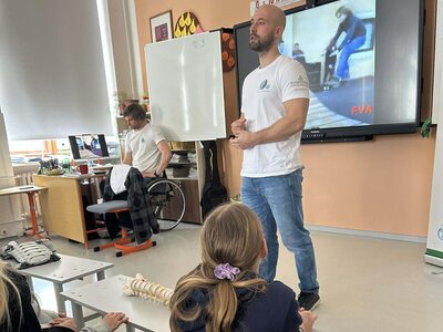 Ve škole jsme přivítali Martina, který žákům otevřeně sdílel svůj osobní příběh. Jeho vyprávění dětem přiblížilo, že život na vozíku není jen o omezené mobilitě, ale také o celé řadě dalších výzev, které si zdravý člověk často neuvědomuje.