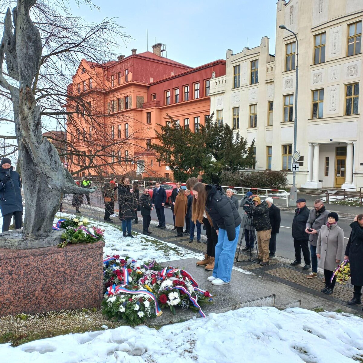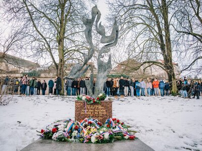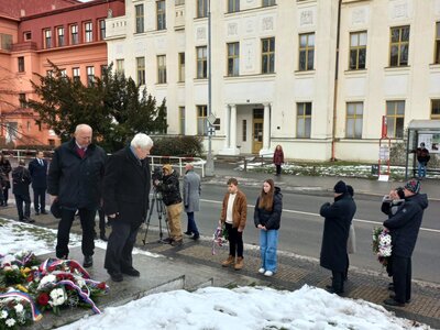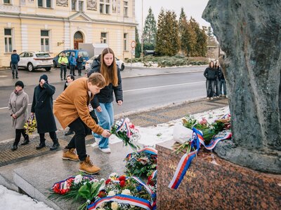 Po vzpomínkových projevech následovalo položení květin u památníku od sochaře Andráse Becka, který stojí před původní budovou mělnického gymnázia. Pokládání květin se zúčastnili také zástupci naší školy – žáci 9. tříd, kteří důstojně vzdali hold památce za všechny přítomné studenty a žáky.
