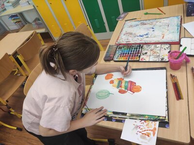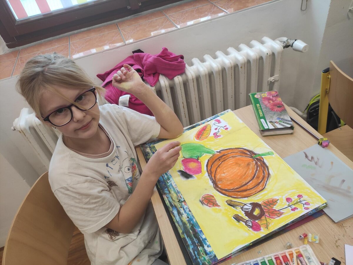 V listopadu žáci naší třídy tvořili krásná zátiší s dýněmi pomocí suchého pastelu. Volili převážně teplé odstíny oranžové a hnědé. Symbolicky tak oslavili Halloween.