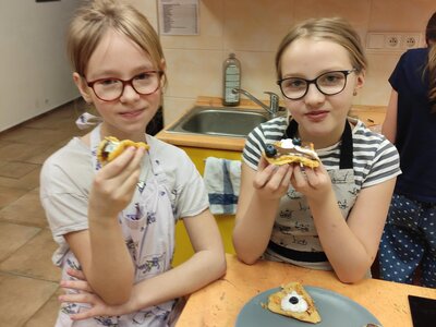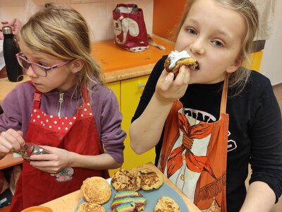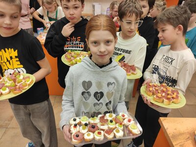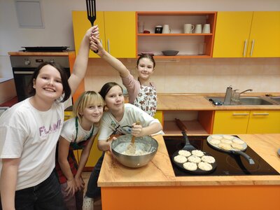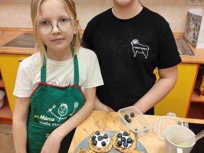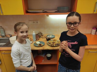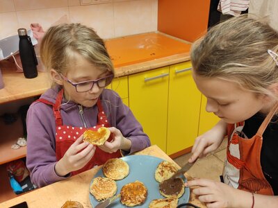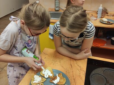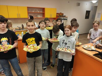 I v únoru se věnujeme vaření ve školní kuchyňce. Skupina dívek smaží jablkové lívance a kluci nám chystají ovocné špízy a zeleninové jednohubky.