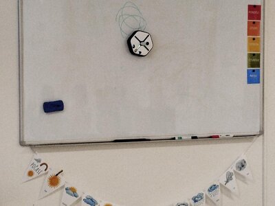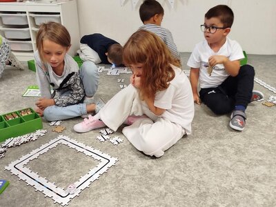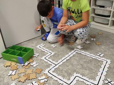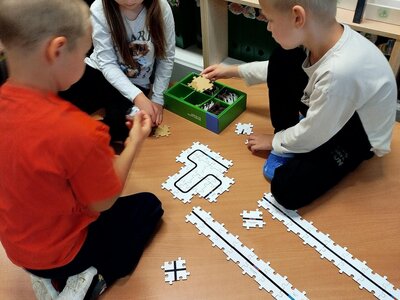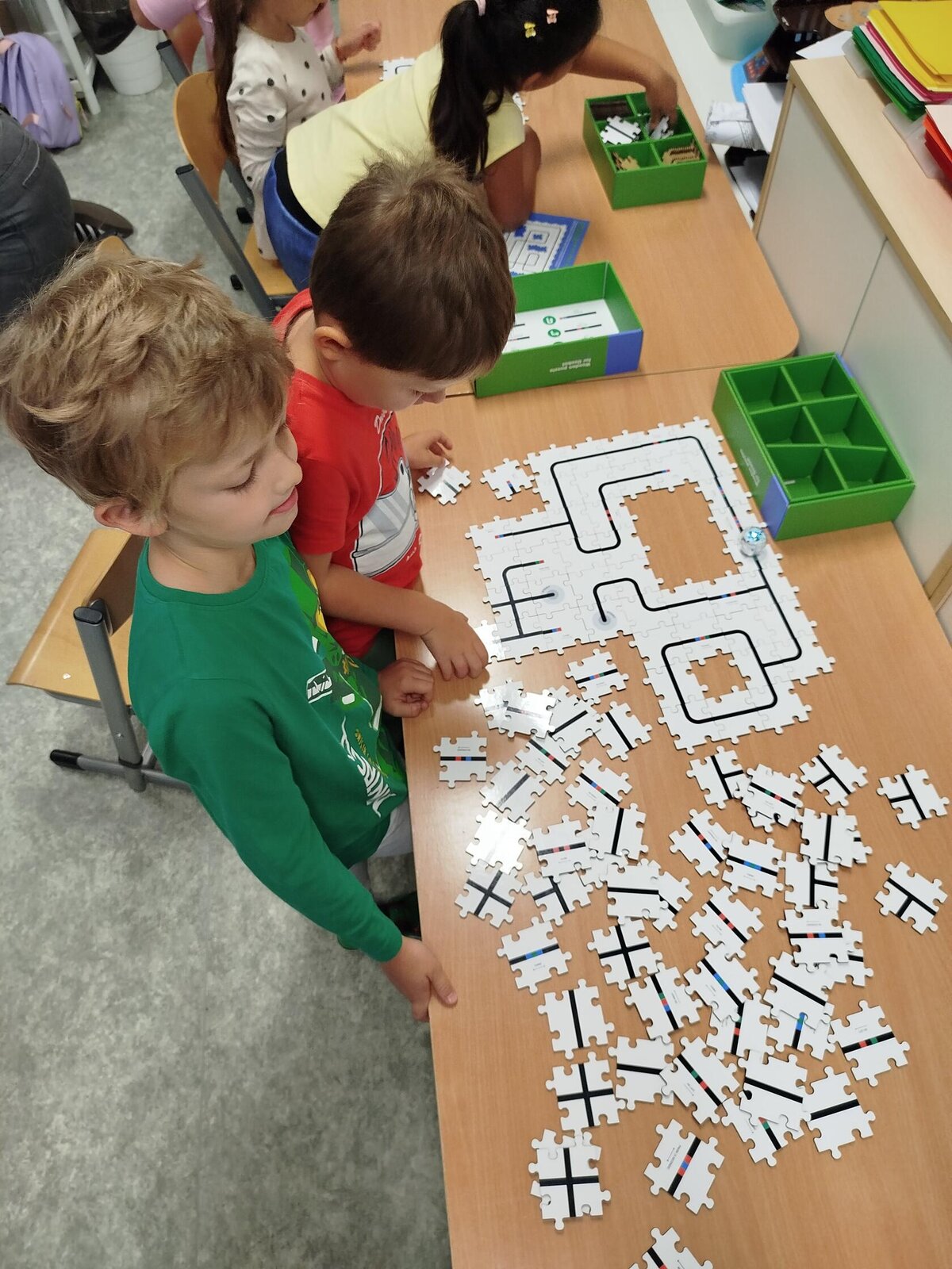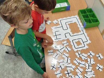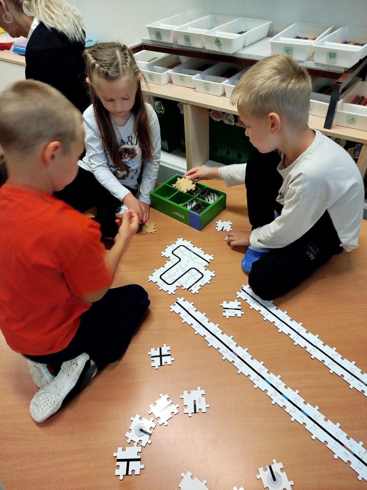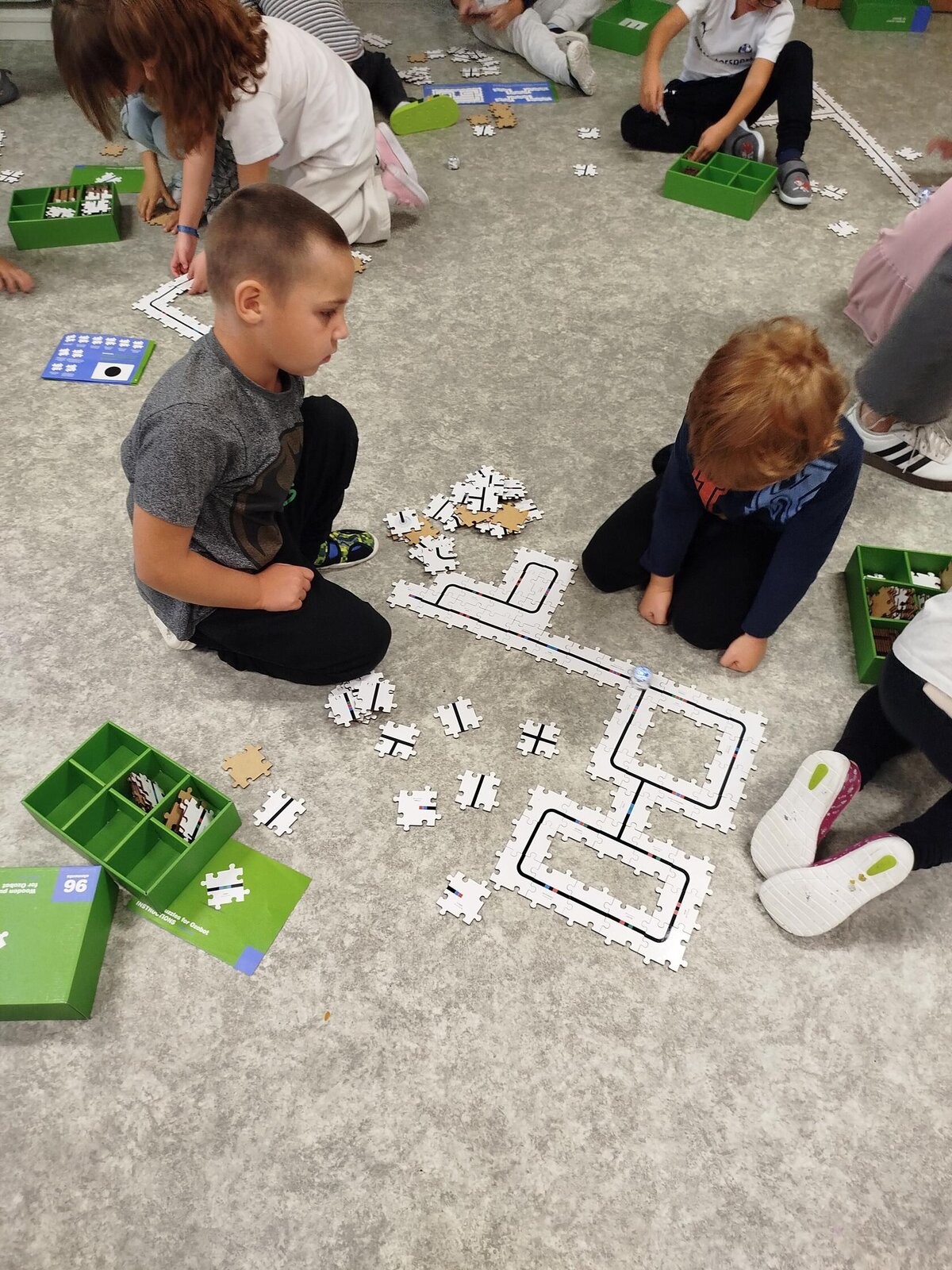 ROBOTIKA - ing. K.MACUROVÁ / ukázky programování robota na tabuli, skládání dráhy pro roboty z puzzlí/.