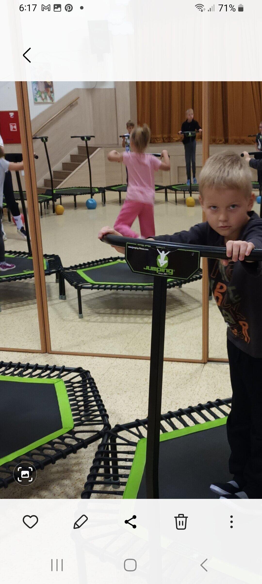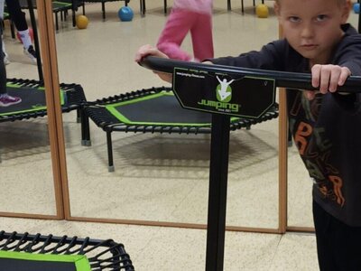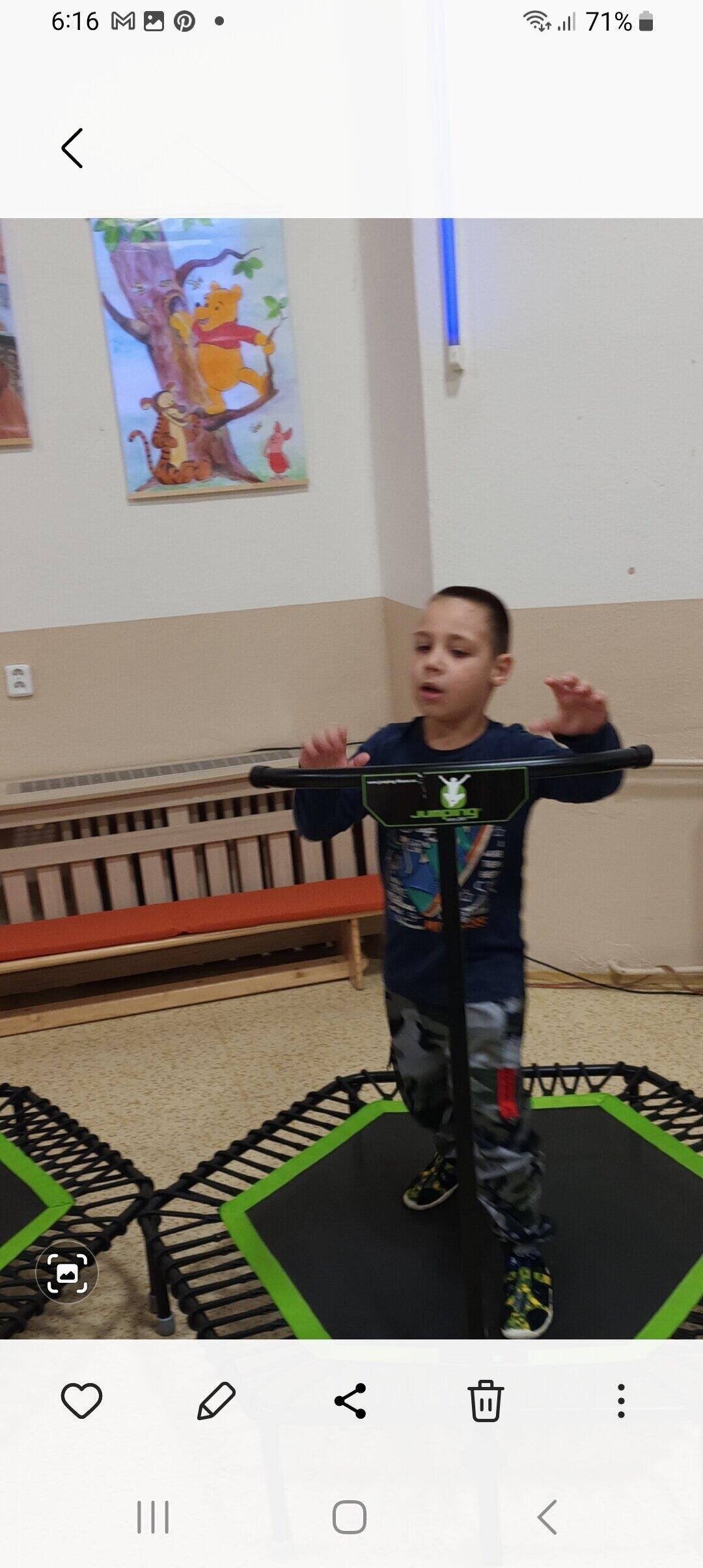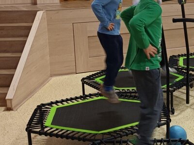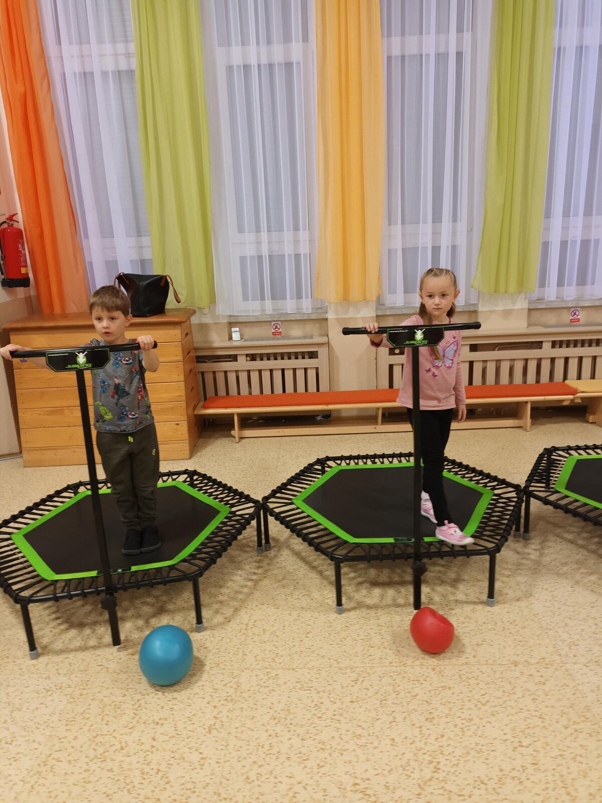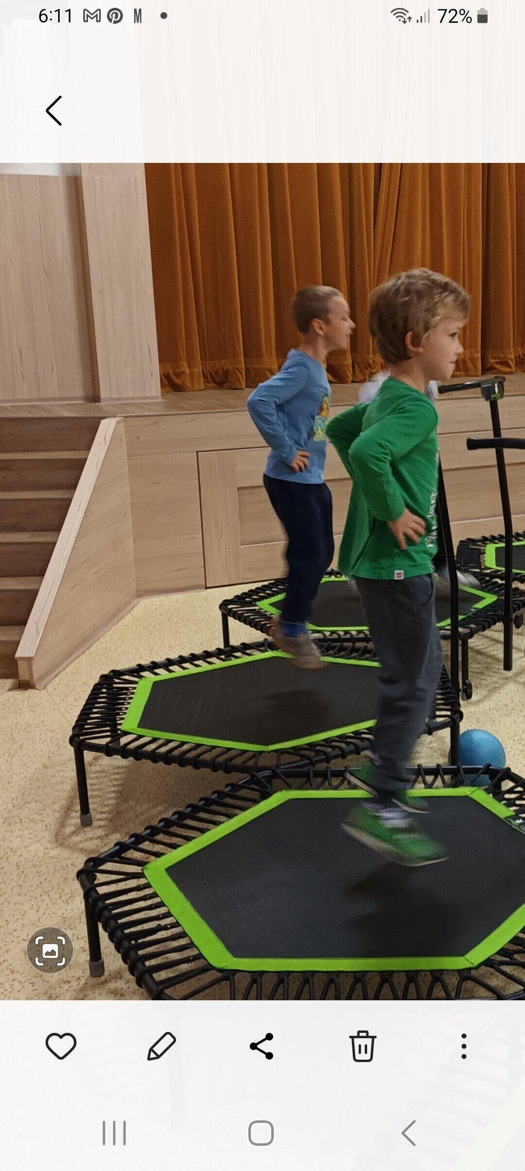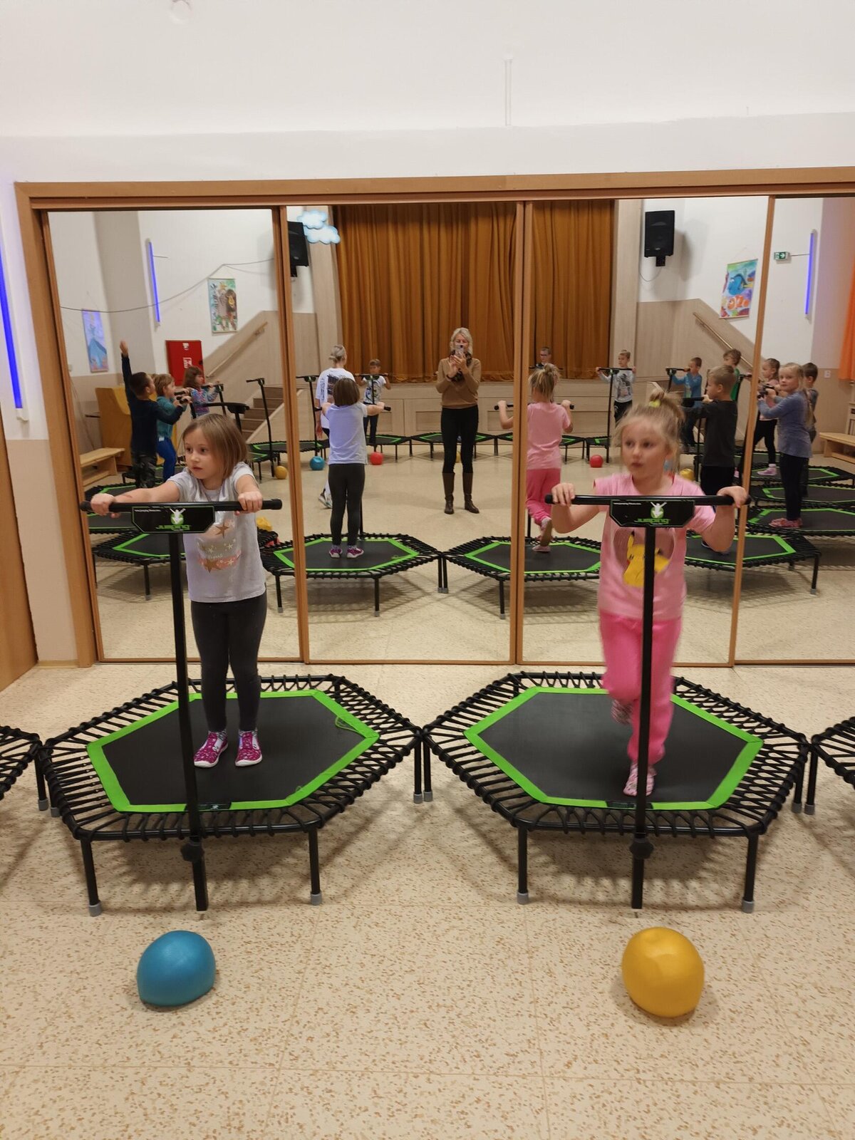 Všichni se moc těšili a hned od začátku panovala skvělá nálada. Nejprve p. lektorka ukázala dětem, jak správně a bezpečně nastoupit a skákat na trampolínkách. Děti si vyzkoušely různé druhy poskoků, cvičení na rovnováhu za doprovodu svižné hudby. Nechyběl smích, nadšení a radost z nové aktivity.