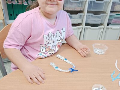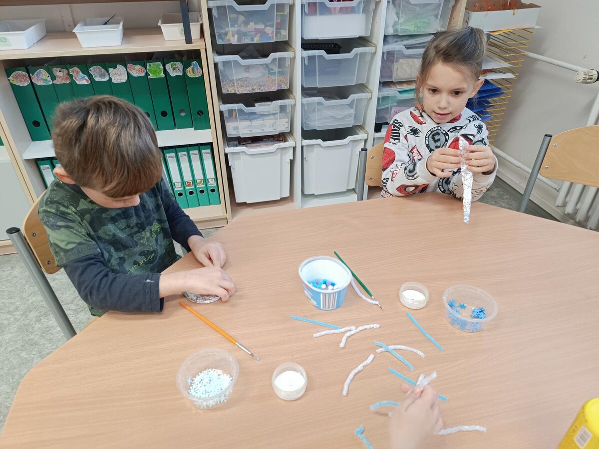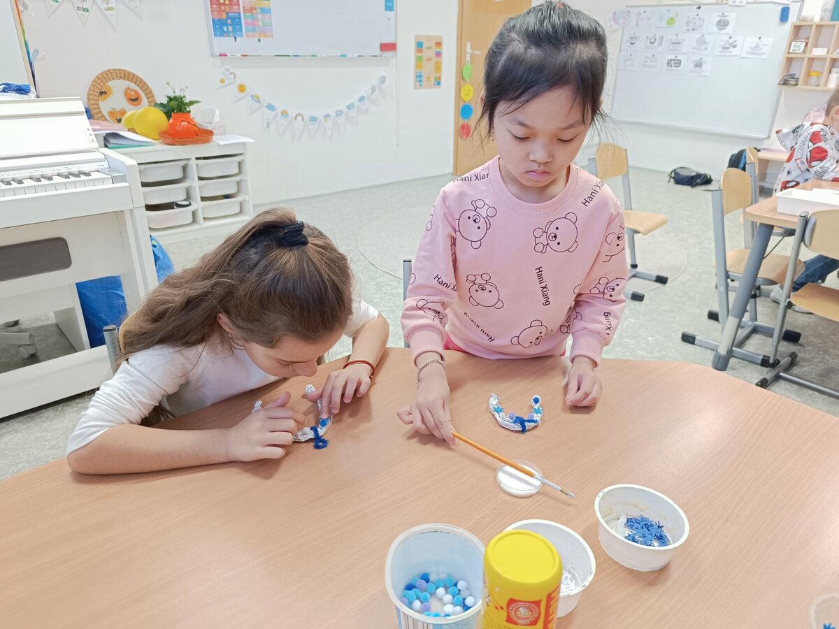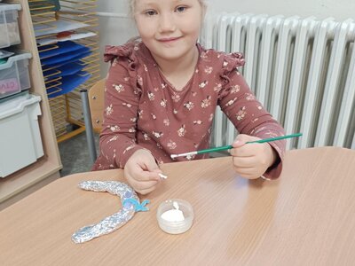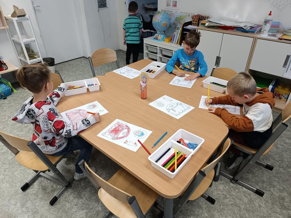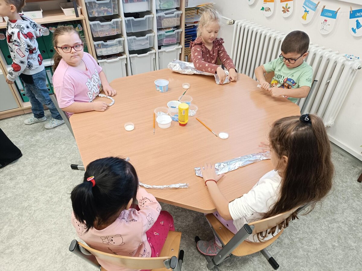 Na druhém "stanovišti" jsme tvořili a zdobili podkovu pro štěstí a u dalších stolečků nás čekalo kreslení, stříhání a lepení postavičky Martina s husou.