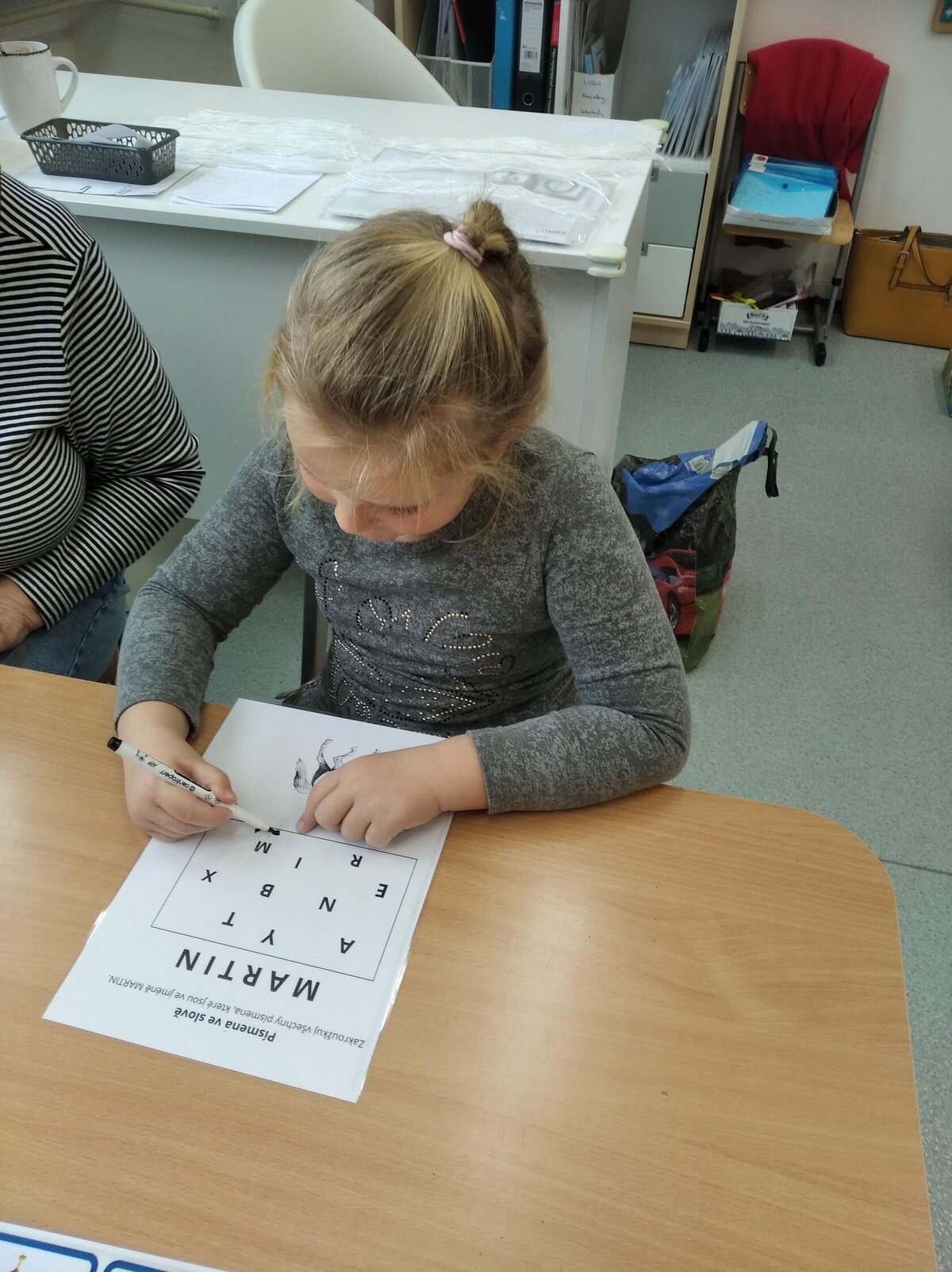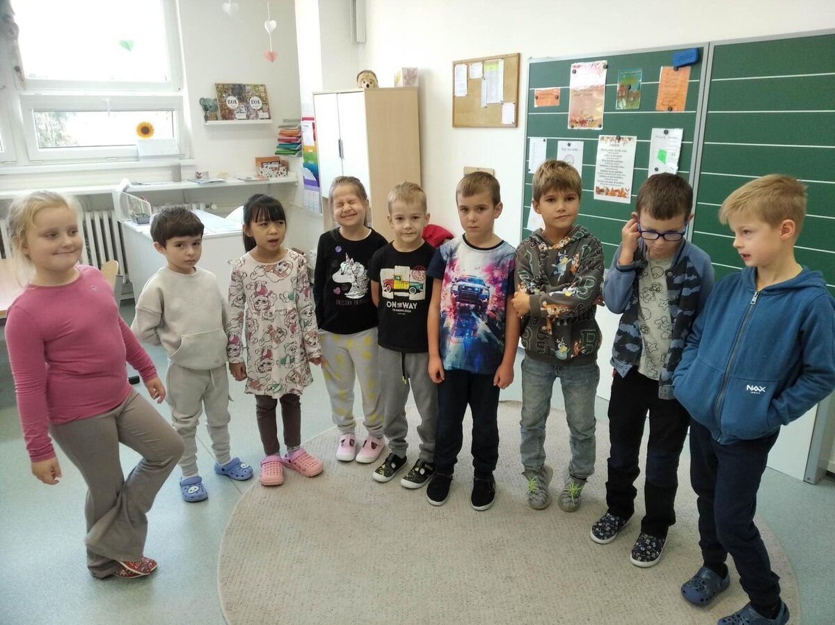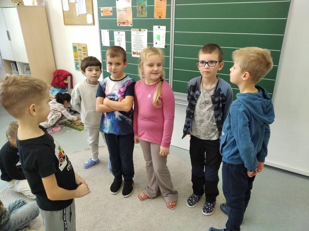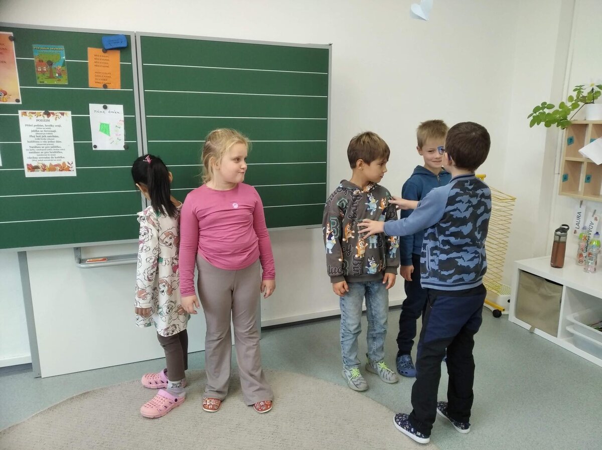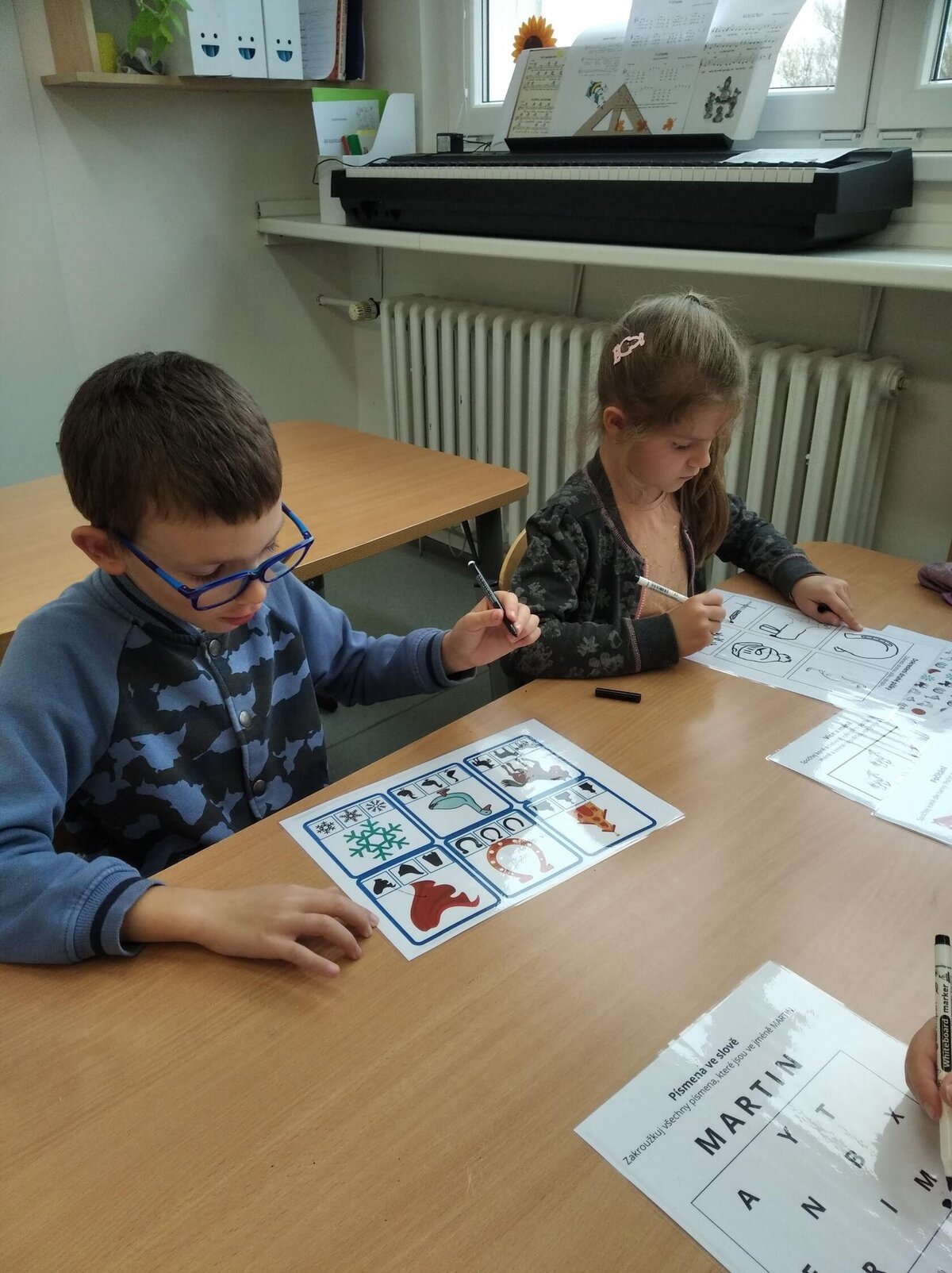 Věnovali jsme se matematickým pojmům, jako je kratší x delší a širší x užší. Také se děti mezi sebou řadily od nejmenšího po největšího. Rozvíjeli jsme řeč, učili se nadřazené a podřazené pojmy a procvičovali porozumění dějové posloupnosti. Zrakové vnímání jsme trénovali dokreslováním částí, které chybí a popisem nesmyslných obrázků. Ve sluchovém vnímání jsme trénovali slabiky, první hlásky a rozpoznávali rýmy. Grafomotoriku jsme procvičovali na velké tabuli, na stíracích tabulkách a na papírech. Nezapomněli jsme ani na prostorové vnímání - kde jsme se věnovali předložkovým vazbám a pojmům nahoře x dole a vlevo x vpravo.