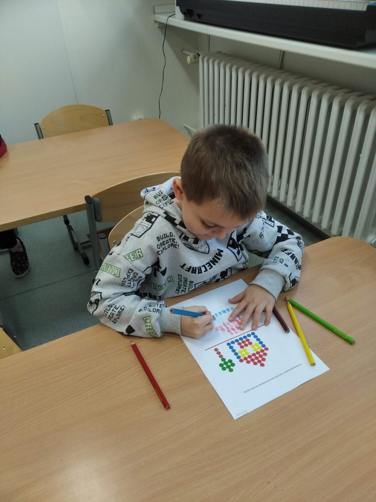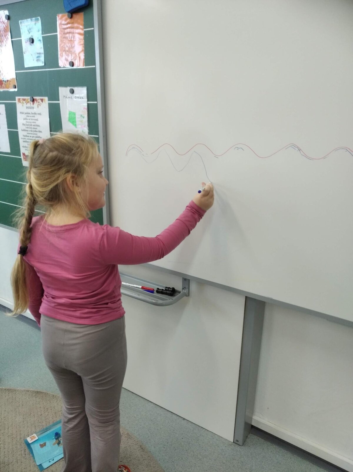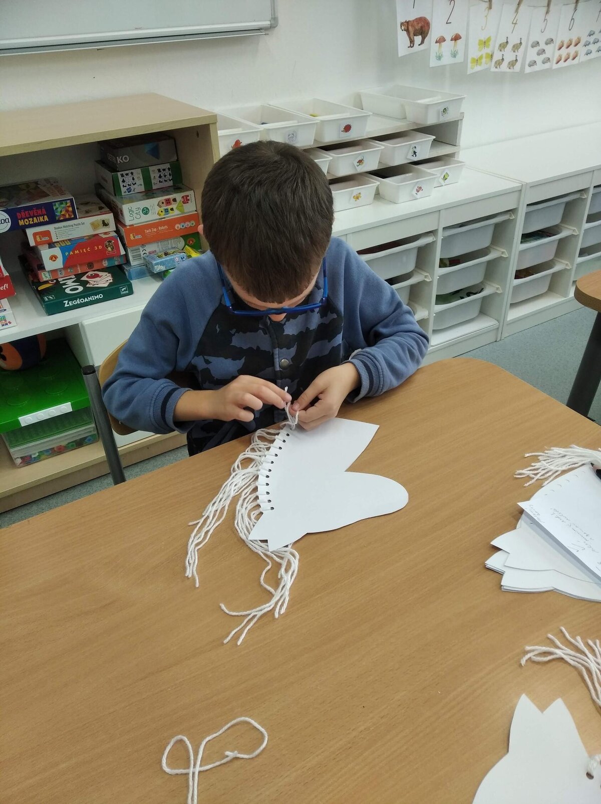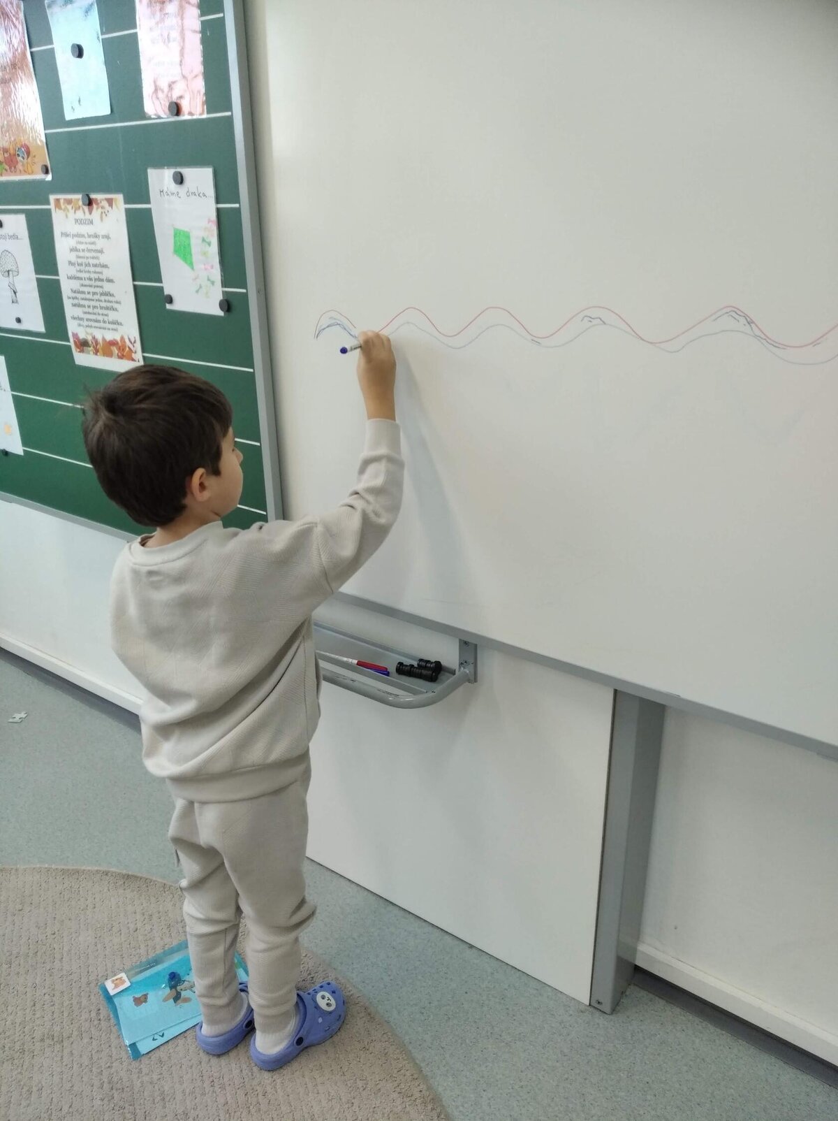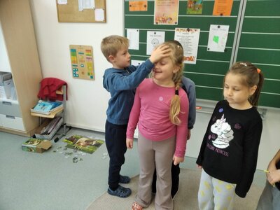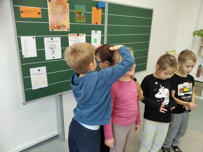 Věnovali jsme se matematickým pojmům, jako je kratší x delší a širší x užší. Také se děti mezi sebou řadily od nejmenšího po největšího. Rozvíjeli jsme řeč, učili se nadřazené a podřazené pojmy a procvičovali porozumění dějové posloupnosti. Zrakové vnímání jsme trénovali dokreslováním částí, které chybí a popisem nesmyslných obrázků. Ve sluchovém vnímání jsme trénovali slabiky, první hlásky a rozpoznávali rýmy. Grafomotoriku jsme procvičovali na velké tabuli, na stíracích tabulkách a na papírech. Nezapomněli jsme ani na prostorové vnímání - kde jsme se věnovali předložkovým vazbám a pojmům nahoře x dole a vlevo x vpravo.