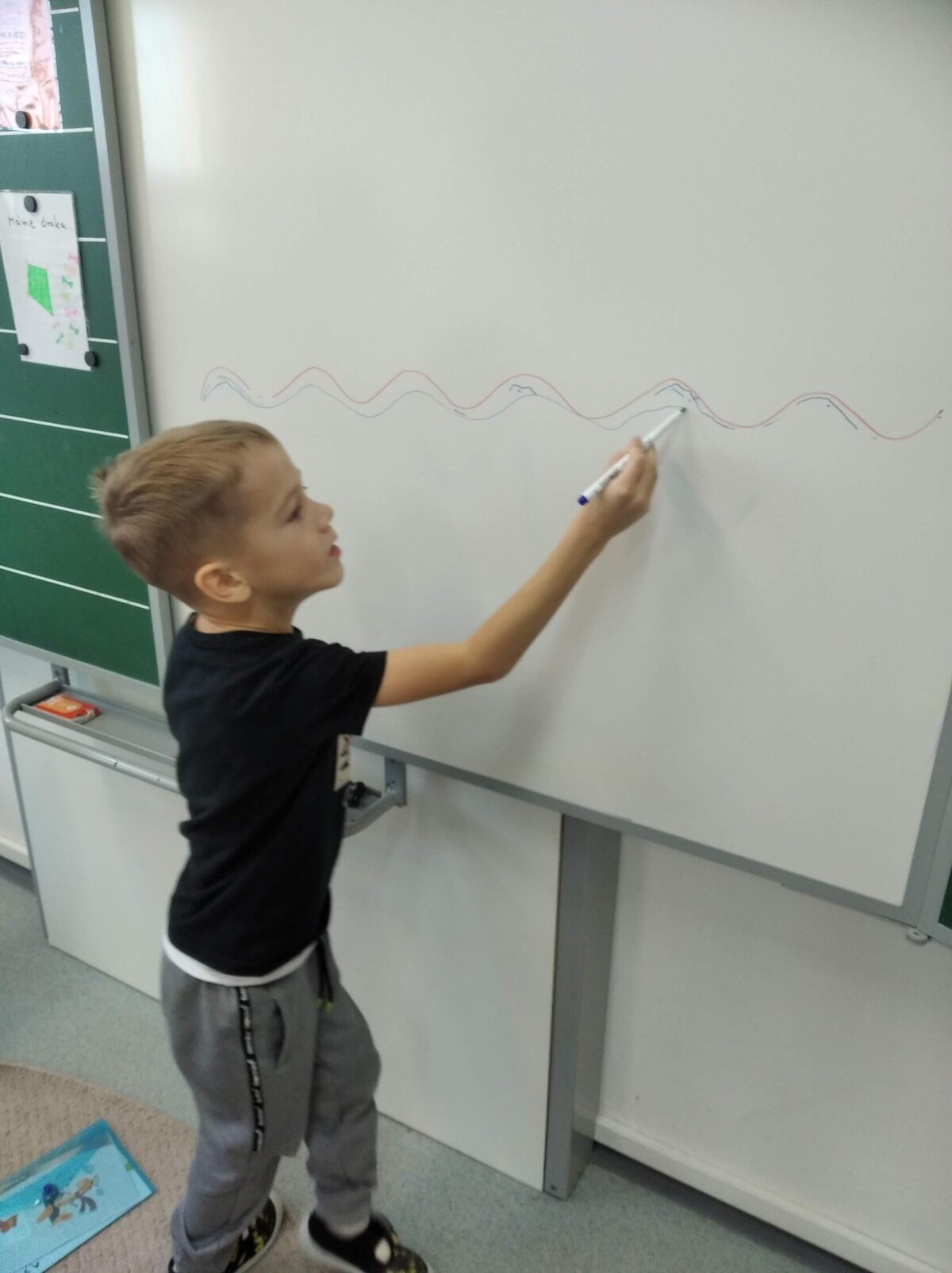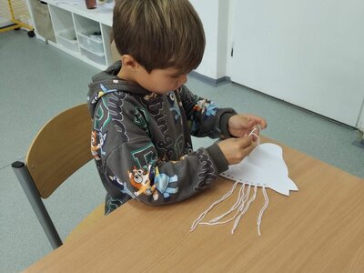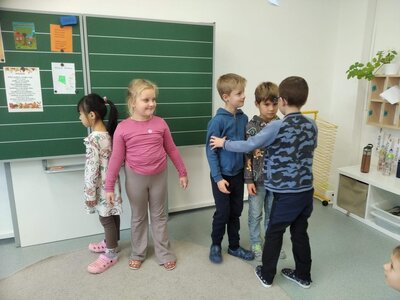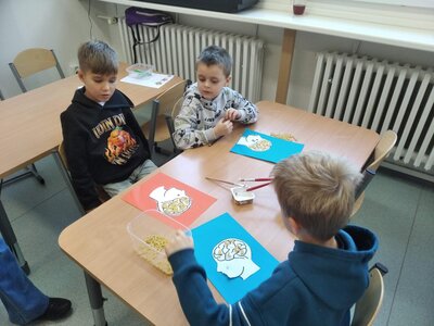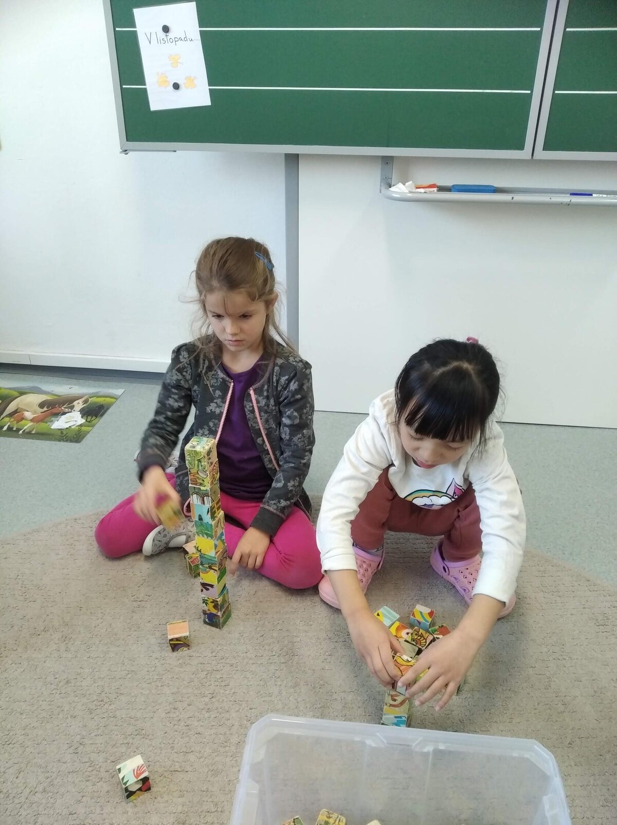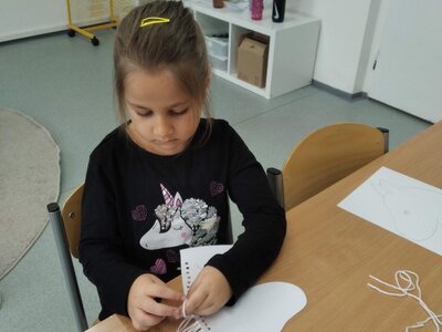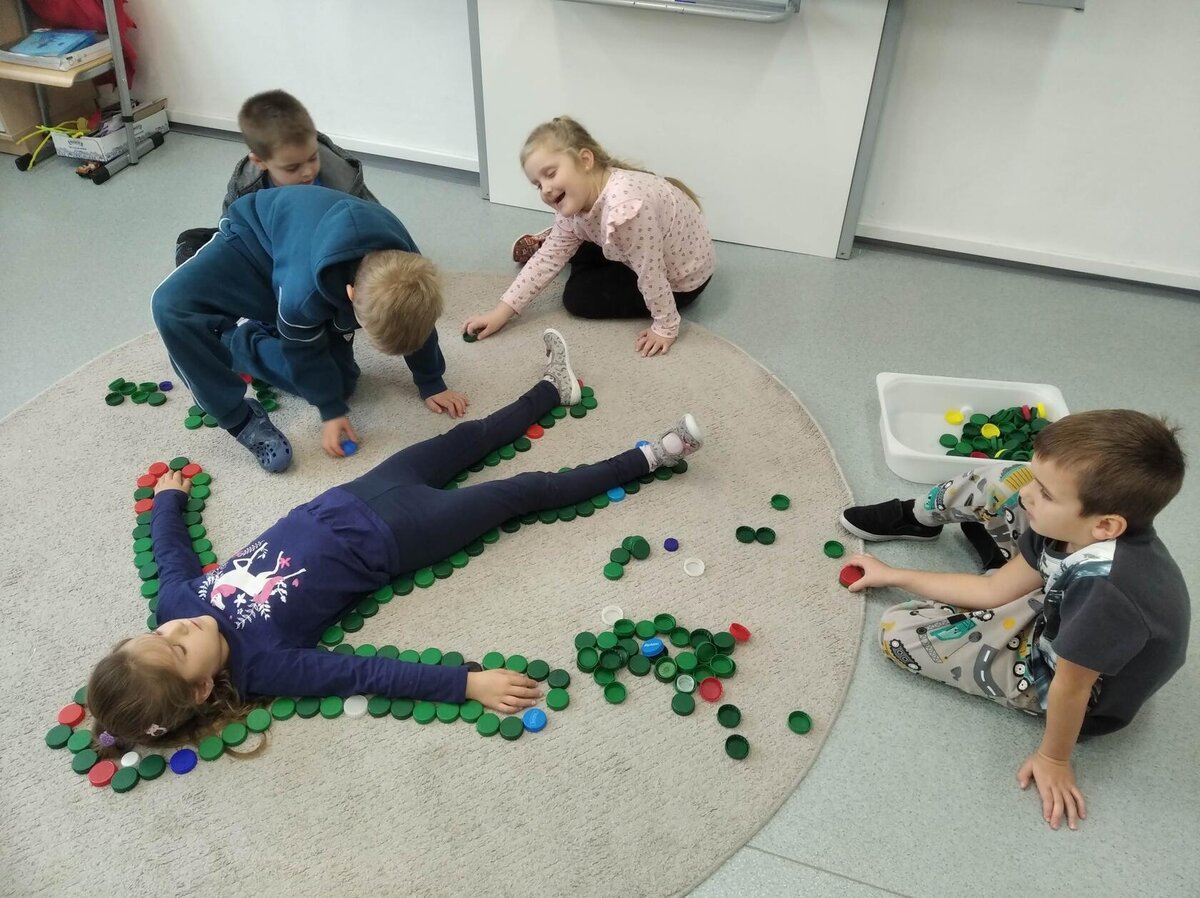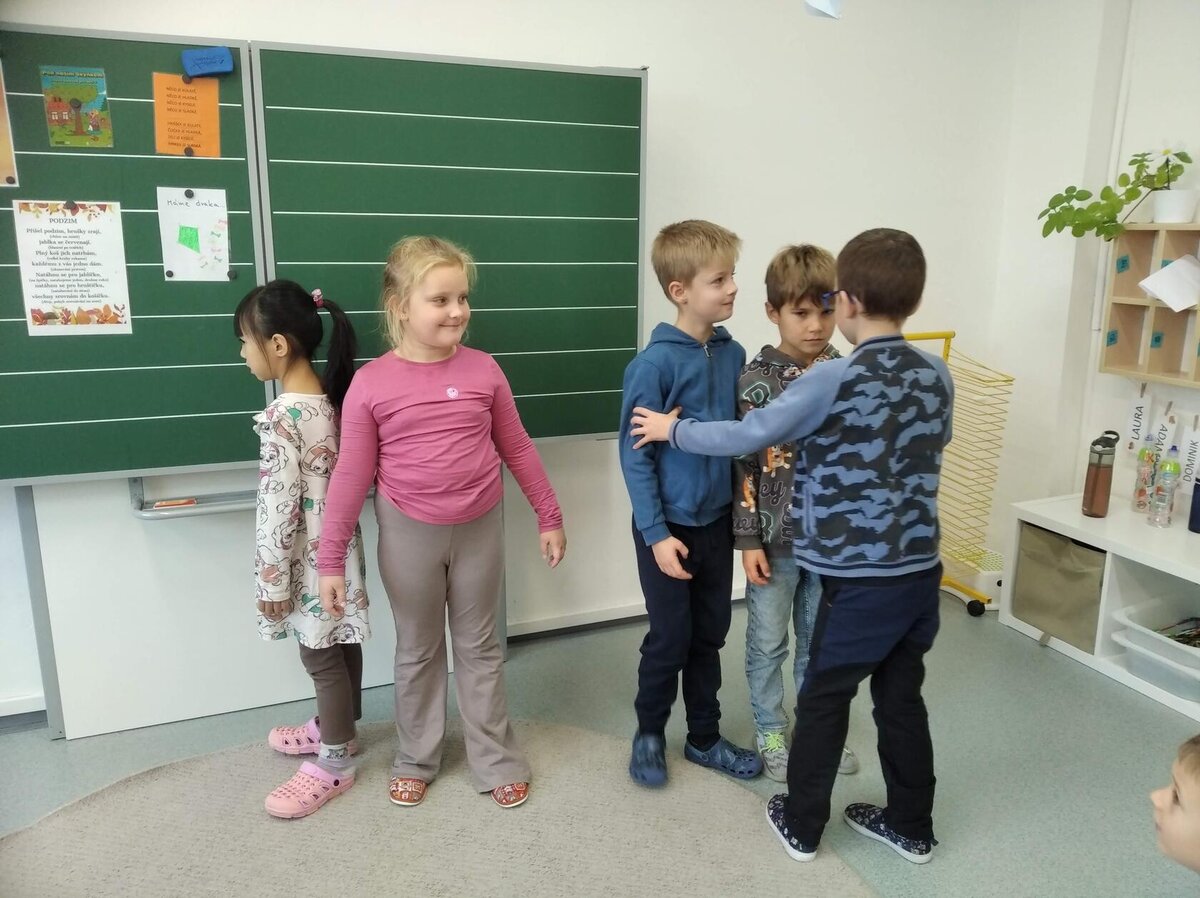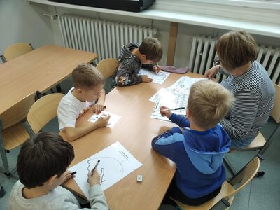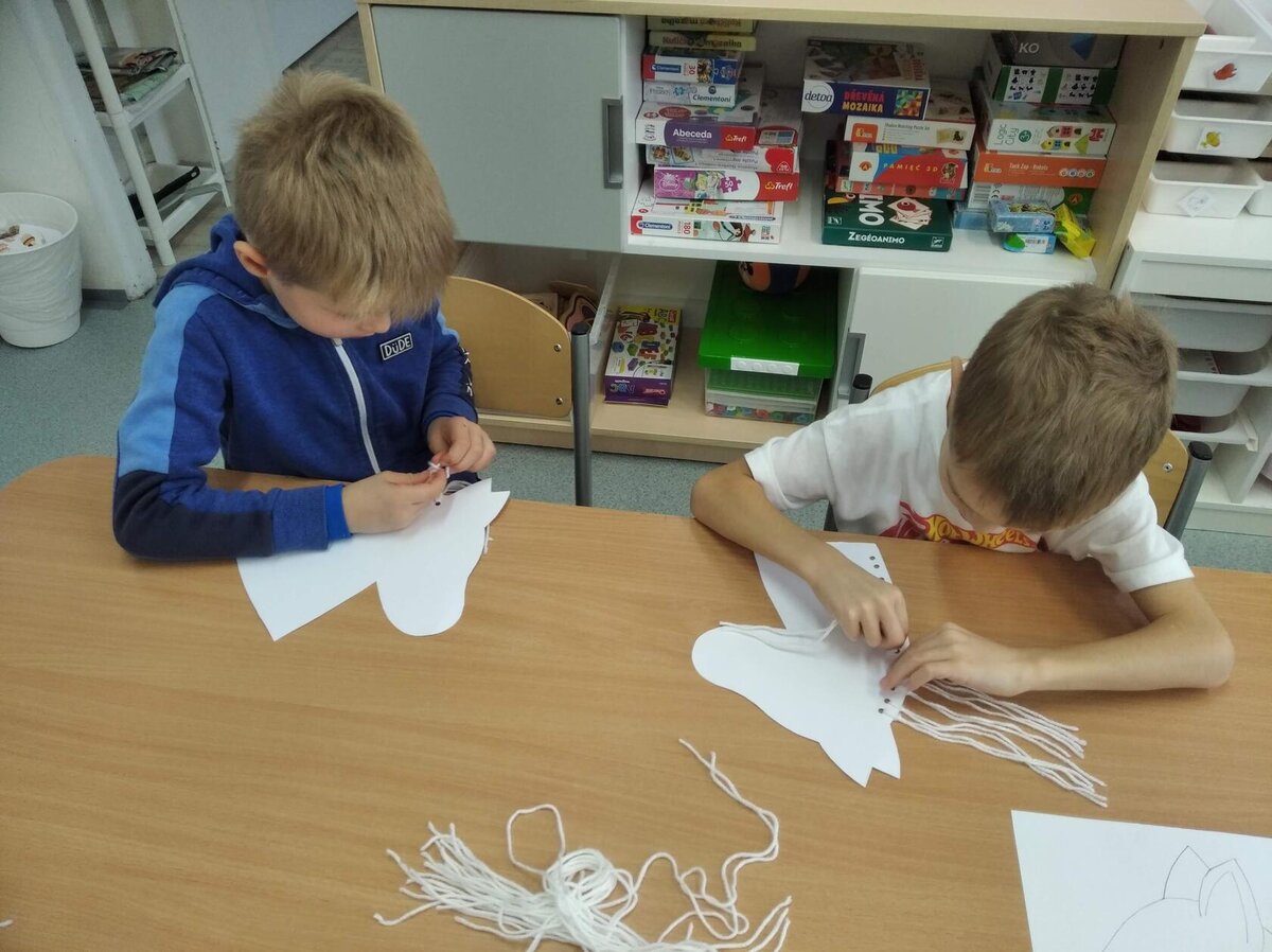 Věnovali jsme se matematickým pojmům, jako je kratší x delší a širší x užší. Také se děti mezi sebou řadily od nejmenšího po největšího. Rozvíjeli jsme řeč, učili se nadřazené a podřazené pojmy a procvičovali porozumění dějové posloupnosti. Zrakové vnímání jsme trénovali dokreslováním částí, které chybí a popisem nesmyslných obrázků. Ve sluchovém vnímání jsme trénovali slabiky, první hlásky a rozpoznávali rýmy. Grafomotoriku jsme procvičovali na velké tabuli, na stíracích tabulkách a na papírech. Nezapomněli jsme ani na prostorové vnímání - kde jsme se věnovali předložkovým vazbám a pojmům nahoře x dole a vlevo x vpravo.