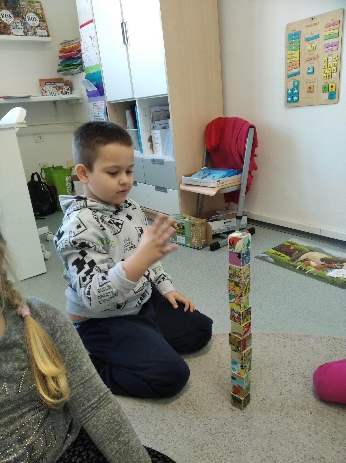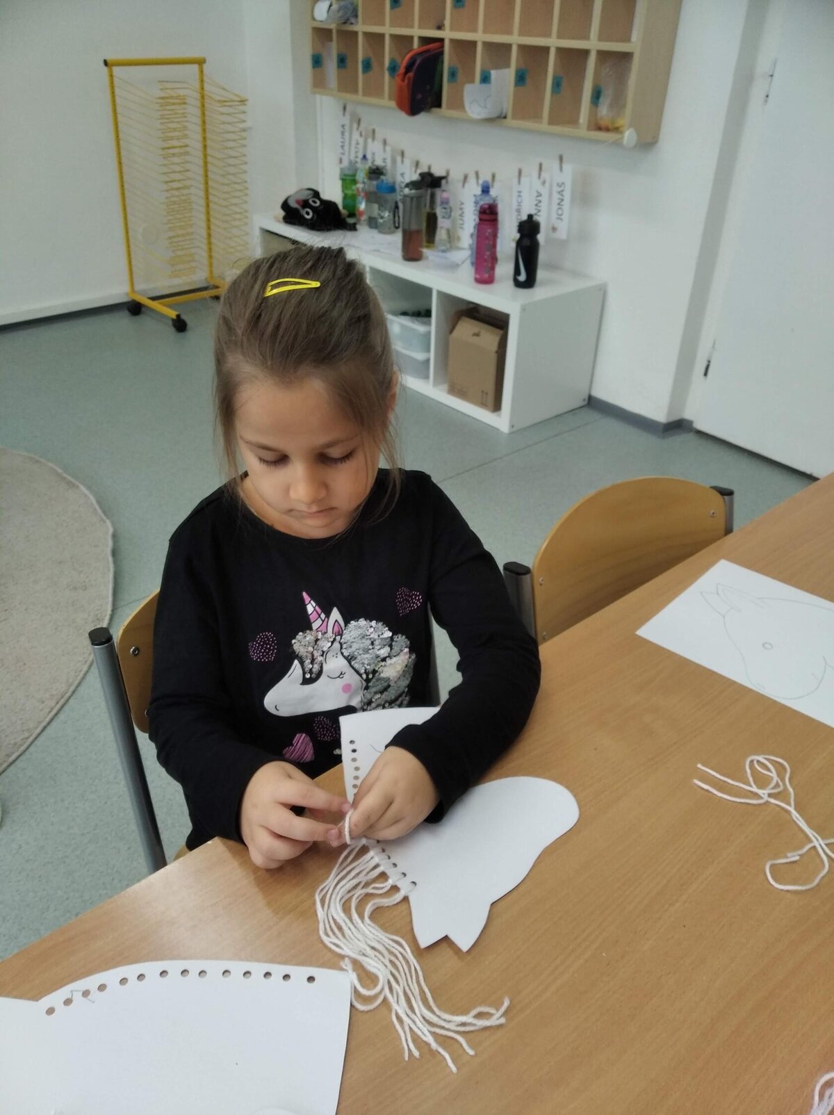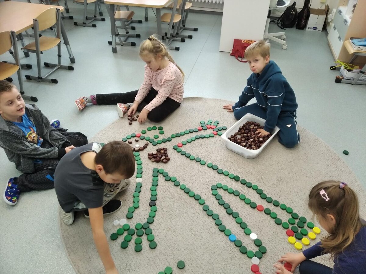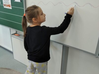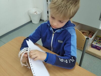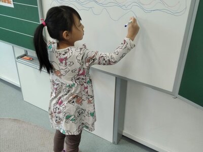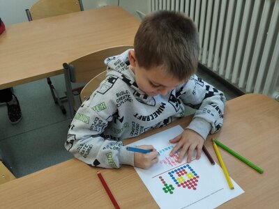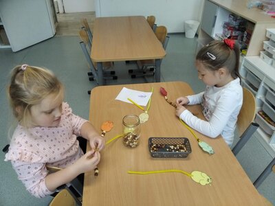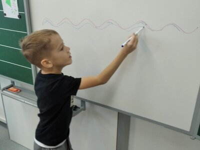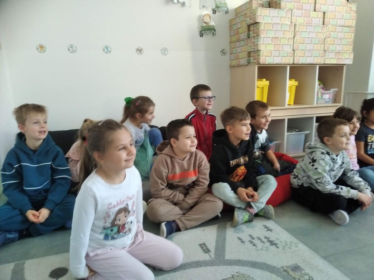 Věnovali jsme se matematickým pojmům, jako je kratší x delší a širší x užší. Také se děti mezi sebou řadily od nejmenšího po největšího. Rozvíjeli jsme řeč, učili se nadřazené a podřazené pojmy a procvičovali porozumění dějové posloupnosti. Zrakové vnímání jsme trénovali dokreslováním částí, které chybí a popisem nesmyslných obrázků. Ve sluchovém vnímání jsme trénovali slabiky, první hlásky a rozpoznávali rýmy. Grafomotoriku jsme procvičovali na velké tabuli, na stíracích tabulkách a na papírech. Nezapomněli jsme ani na prostorové vnímání - kde jsme se věnovali předložkovým vazbám a pojmům nahoře x dole a vlevo x vpravo.