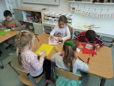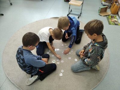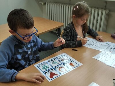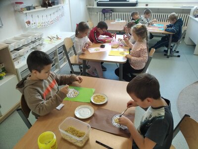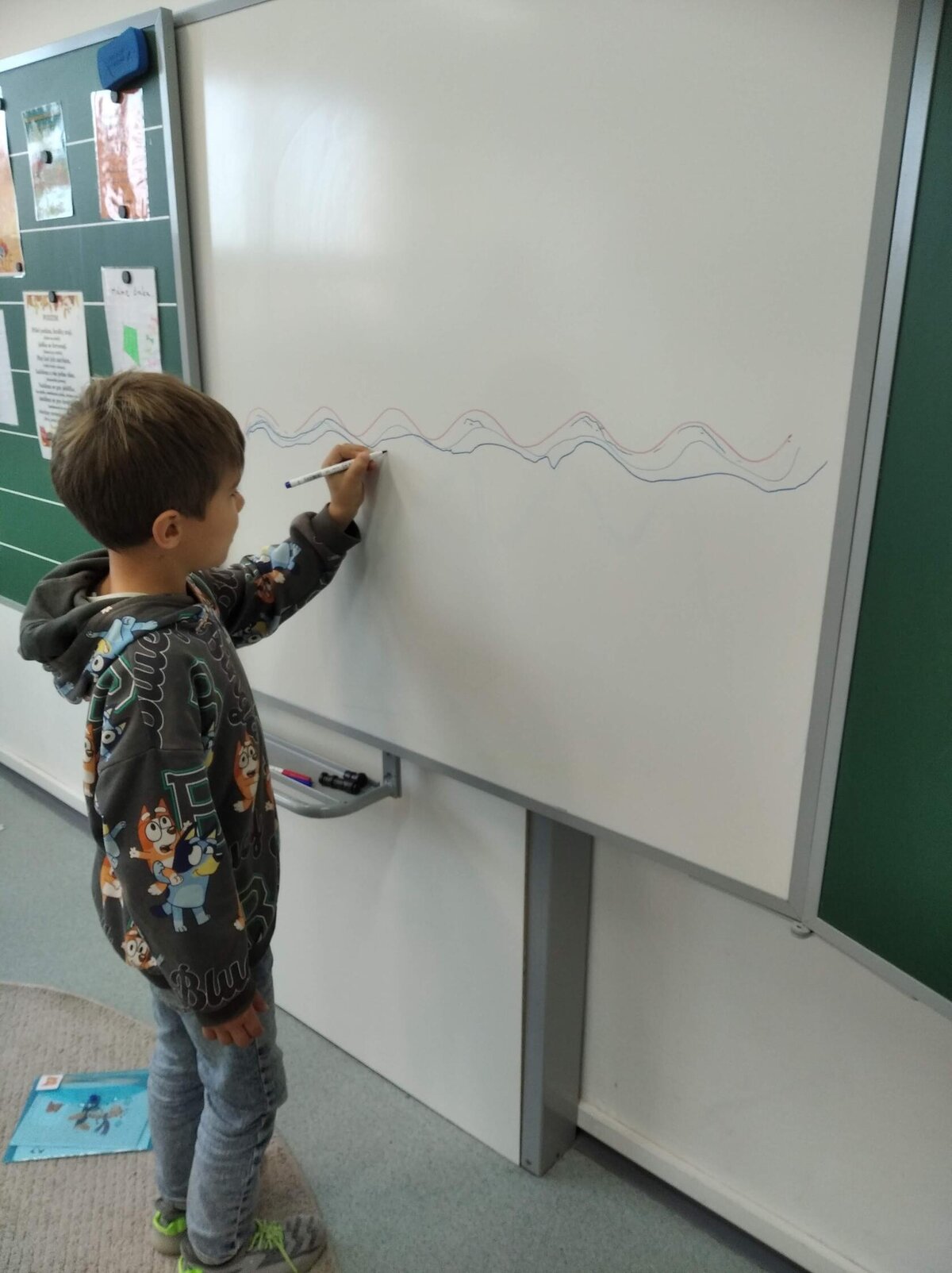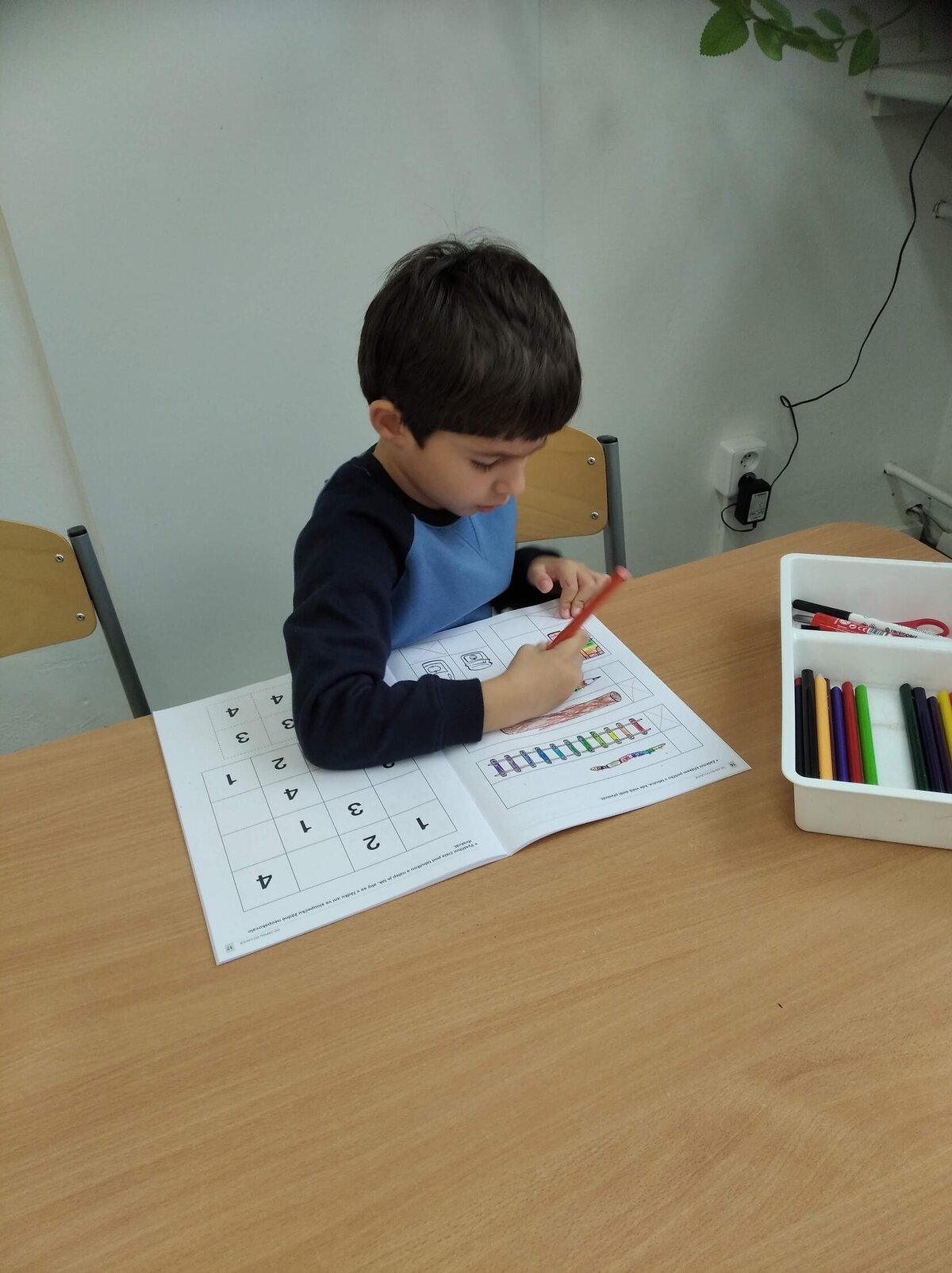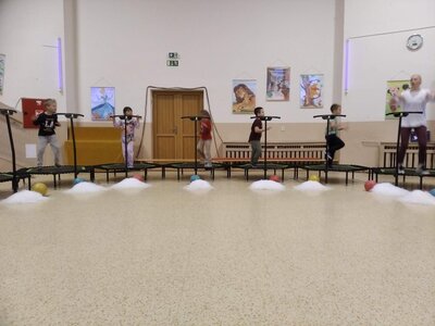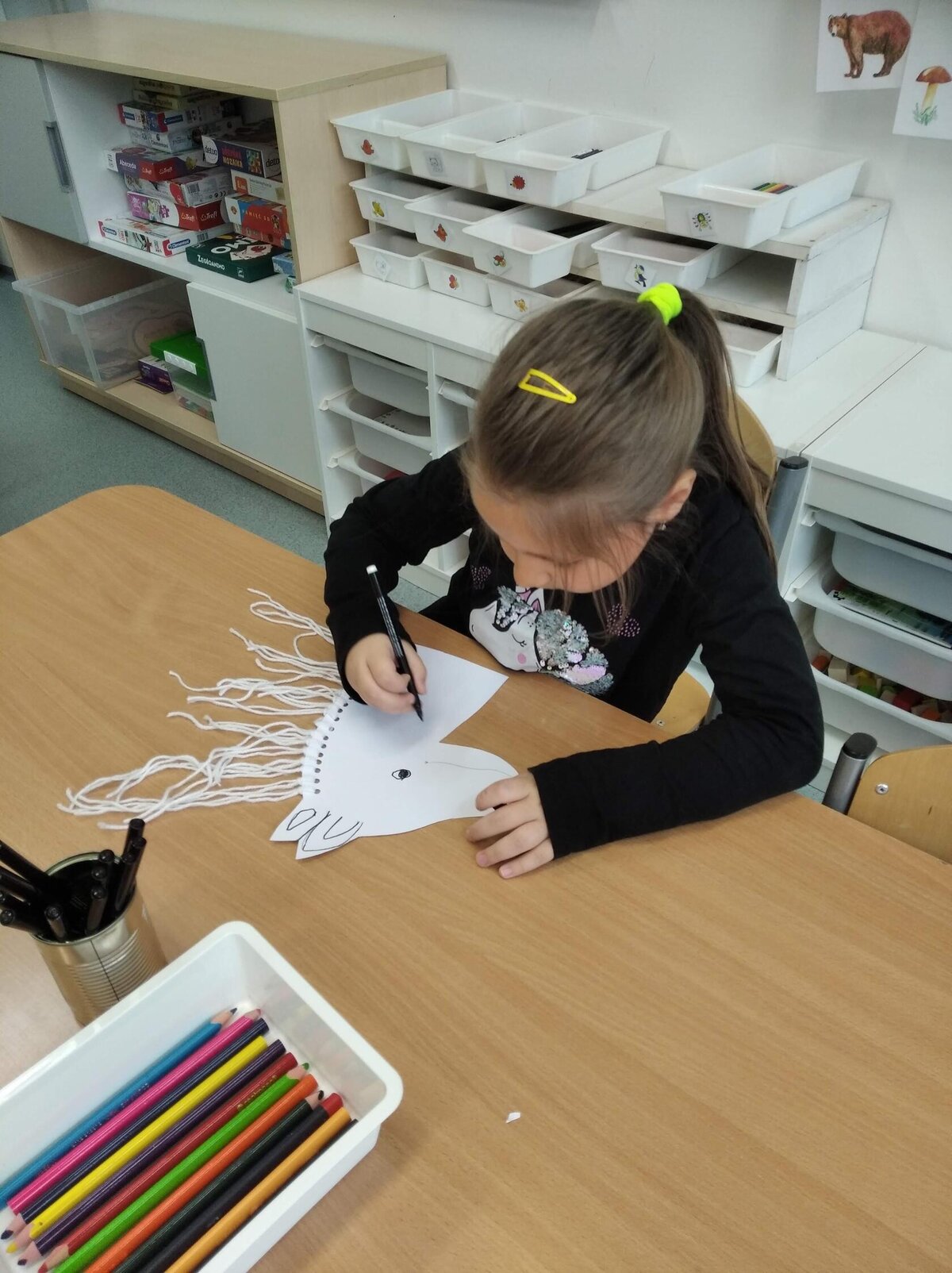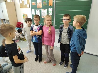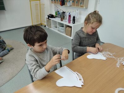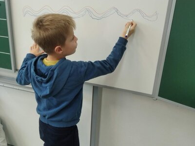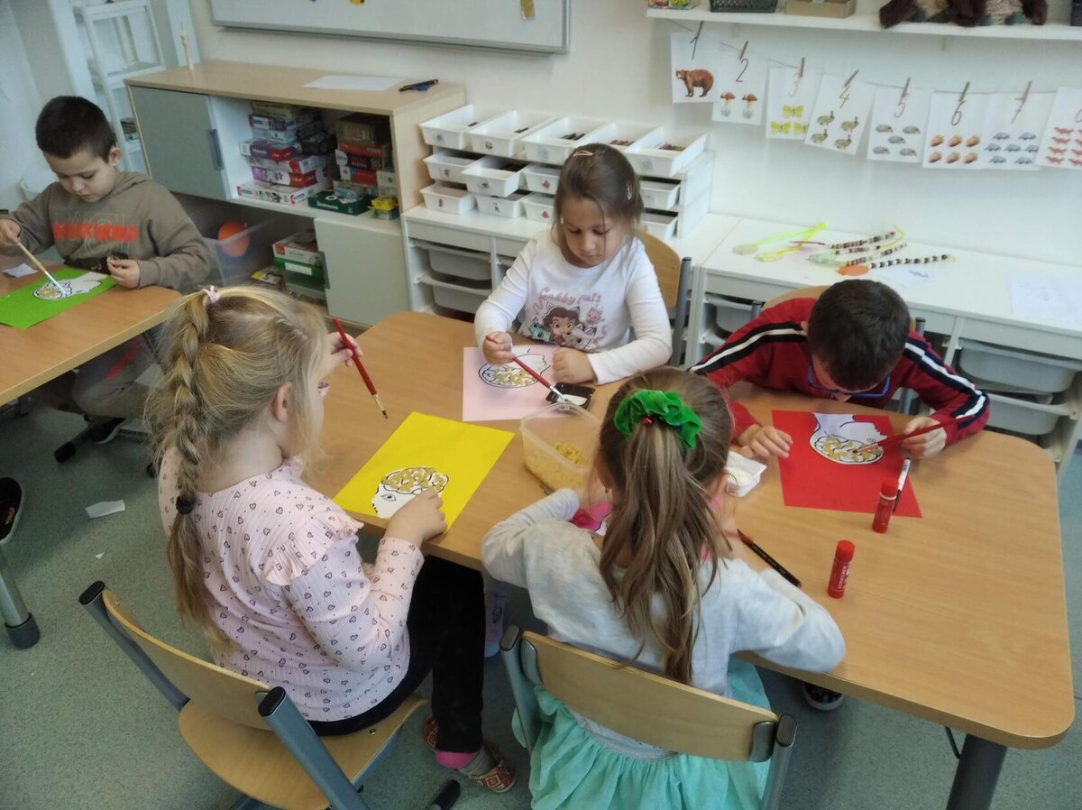 Věnovali jsme se matematickým pojmům, jako je kratší x delší a širší x užší. Také se děti mezi sebou řadily od nejmenšího po největšího. Rozvíjeli jsme řeč, učili se nadřazené a podřazené pojmy a procvičovali porozumění dějové posloupnosti. Zrakové vnímání jsme trénovali dokreslováním částí, které chybí a popisem nesmyslných obrázků. Ve sluchovém vnímání jsme trénovali slabiky, první hlásky a rozpoznávali rýmy. Grafomotoriku jsme procvičovali na velké tabuli, na stíracích tabulkách a na papírech. Nezapomněli jsme ani na prostorové vnímání - kde jsme se věnovali předložkovým vazbám a pojmům nahoře x dole a vlevo x vpravo.