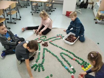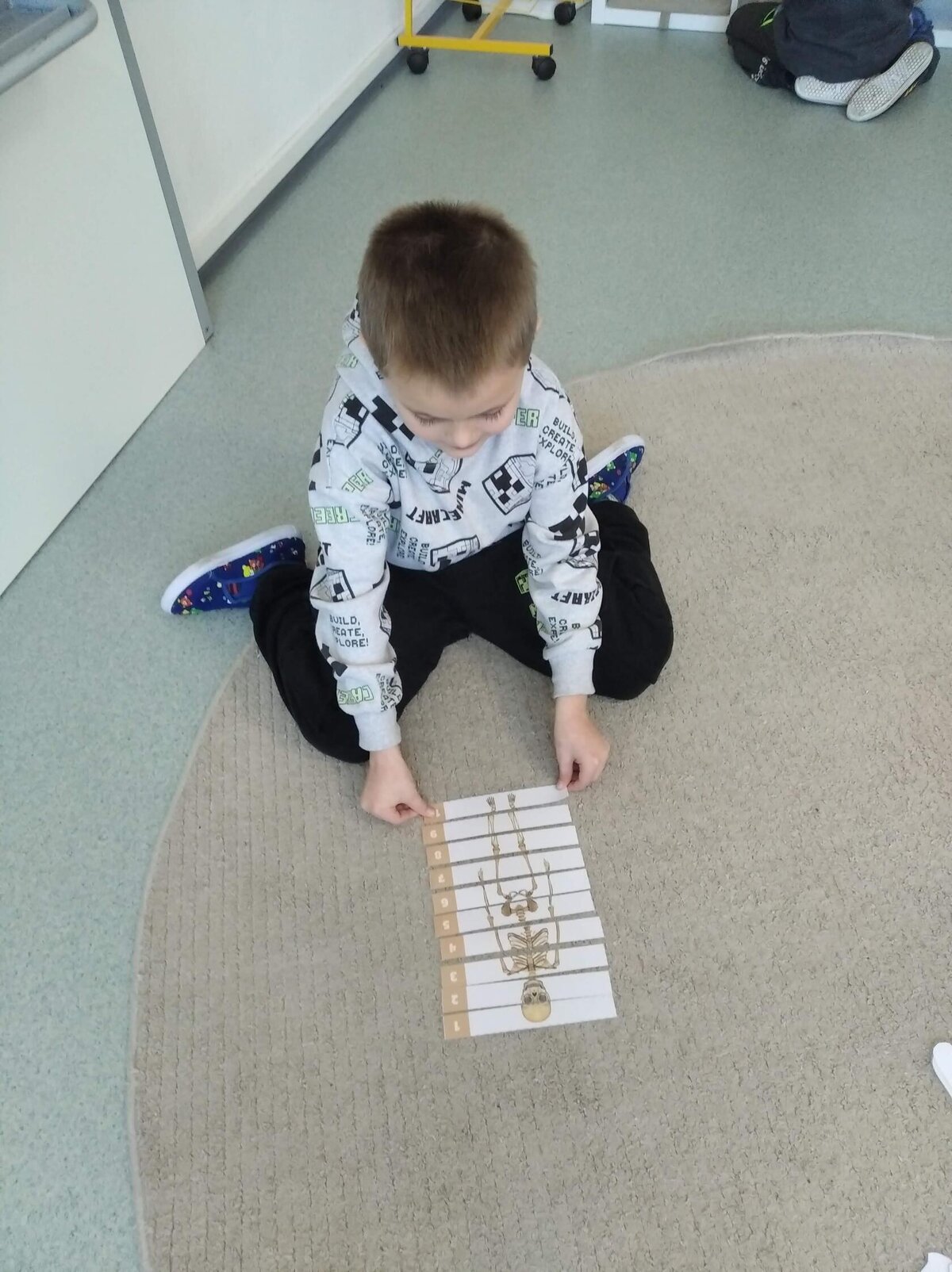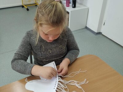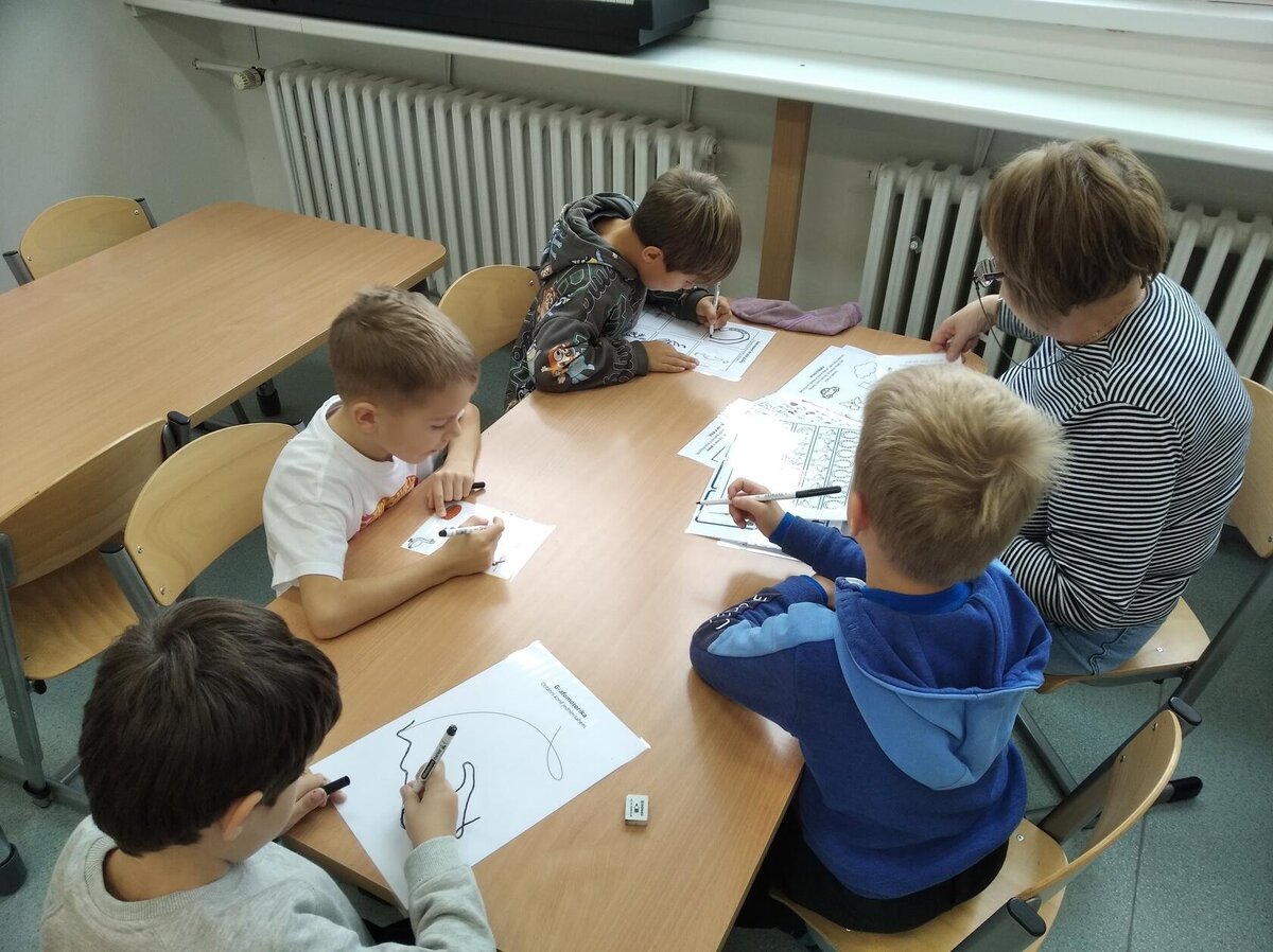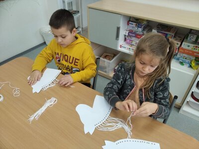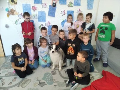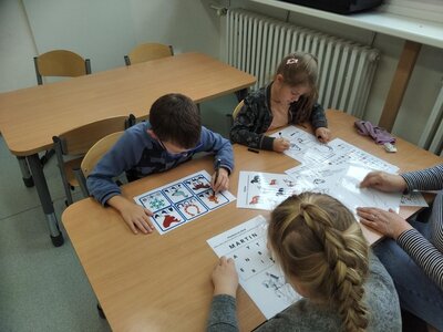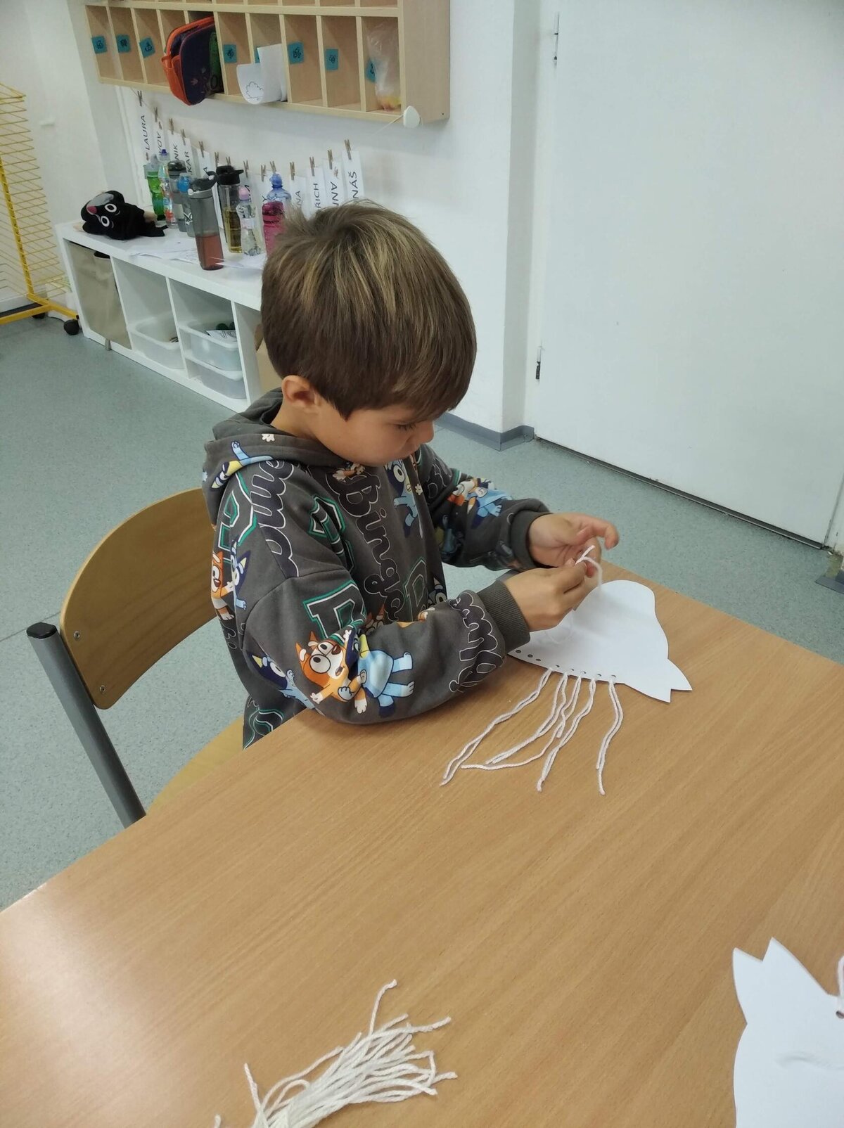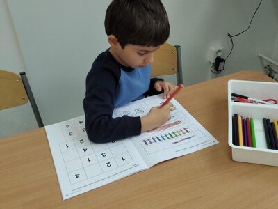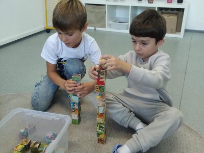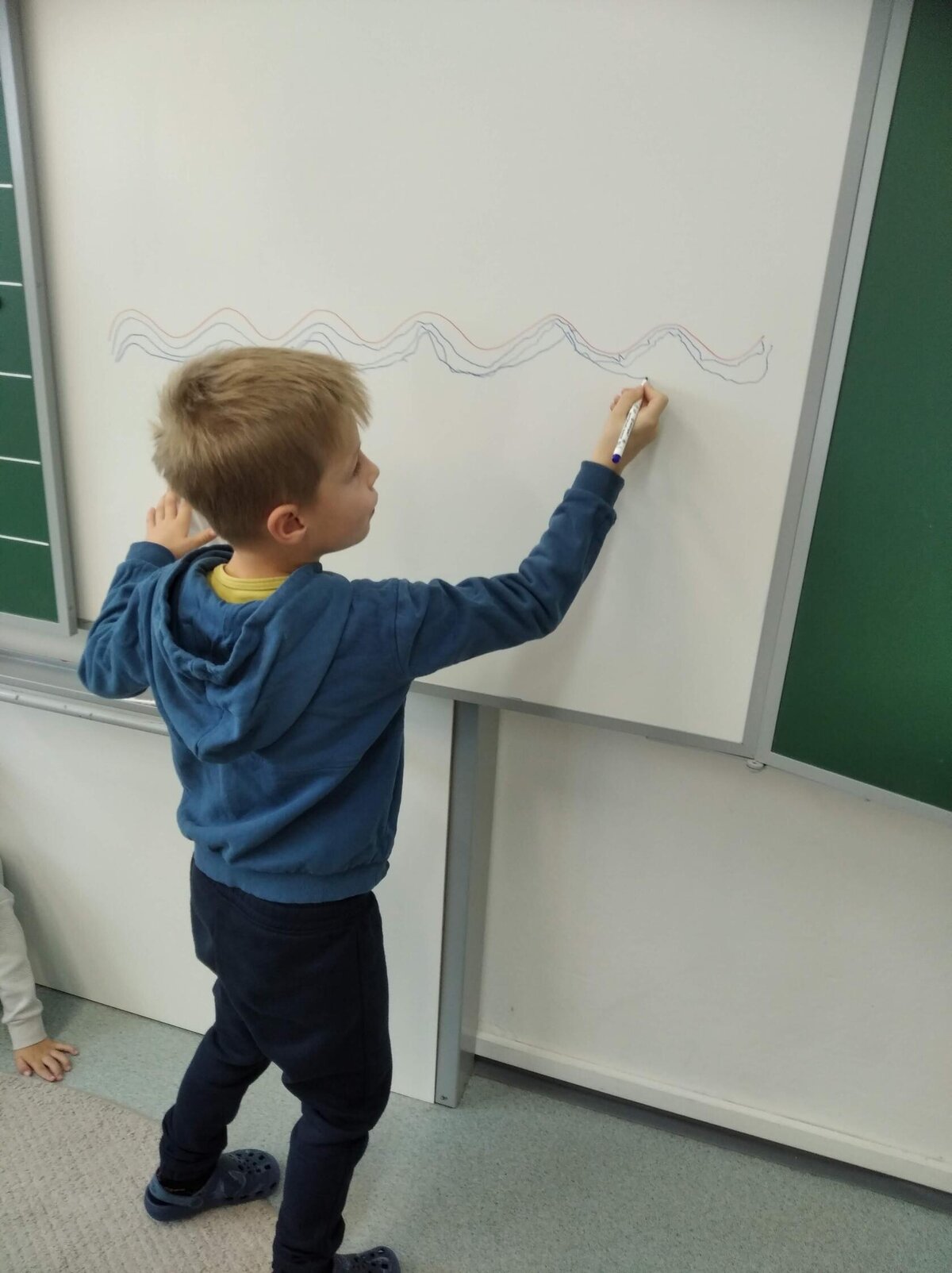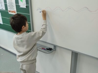Věnovali jsme se matematickým pojmům, jako je kratší x delší a širší x užší. Také se děti mezi sebou řadily od nejmenšího po největšího. Rozvíjeli jsme řeč, učili se nadřazené a podřazené pojmy a procvičovali porozumění dějové posloupnosti. Zrakové vnímání jsme trénovali dokreslováním částí, které chybí a popisem nesmyslných obrázků. Ve sluchovém vnímání jsme trénovali slabiky, první hlásky a rozpoznávali rýmy. Grafomotoriku jsme procvičovali na velké tabuli, na stíracích tabulkách a na papírech. Nezapomněli jsme ani na prostorové vnímání - kde jsme se věnovali předložkovým vazbám a pojmům nahoře x dole a vlevo x vpravo.