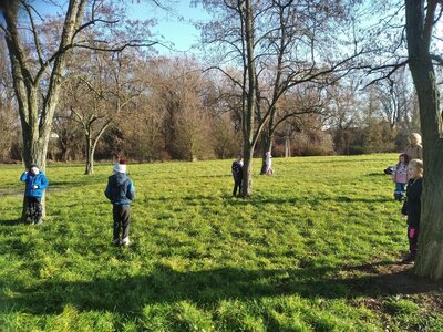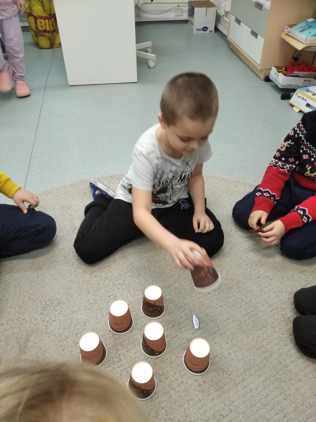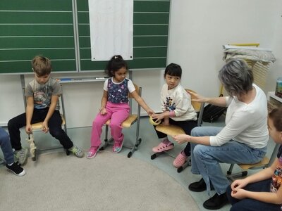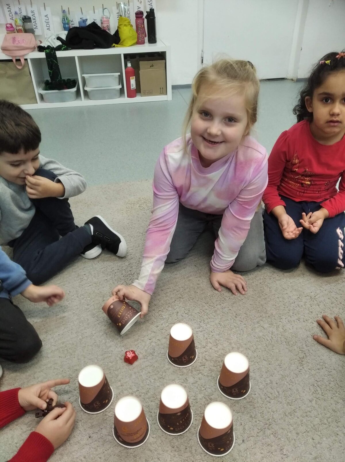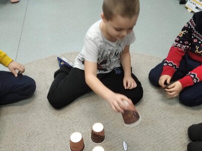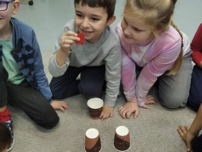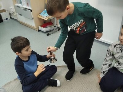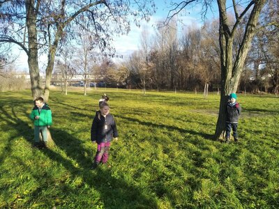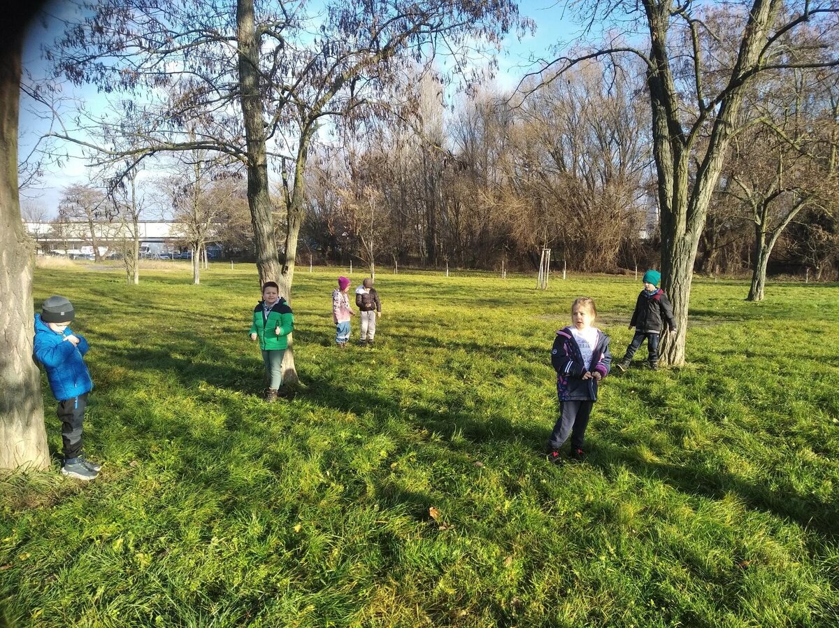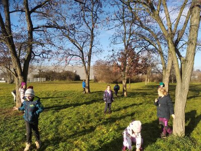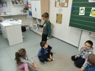 Nechyběl ani pohyb. Běhali jsme, skákali jsme a pilně trénovali na vánoční besídku. Při pohybových hrách jsme se proměňovali v čerty a chytali kamarádům „blešky“ ( kolíčky ) v kožichu nebo si naopak hráli na anděly a pinkali nafukovací míček. Hráli jsme také hry na trpělivost a opatrnost – děti chodily dokola se zvonečkem a nesměly zacinkat. Nebo zvoneček hledaly a ostatní napovídali slovy „samá voda“ nebo „přihořívá“. Venku jsme hráli škatulata batulata, což děti moc bavilo.