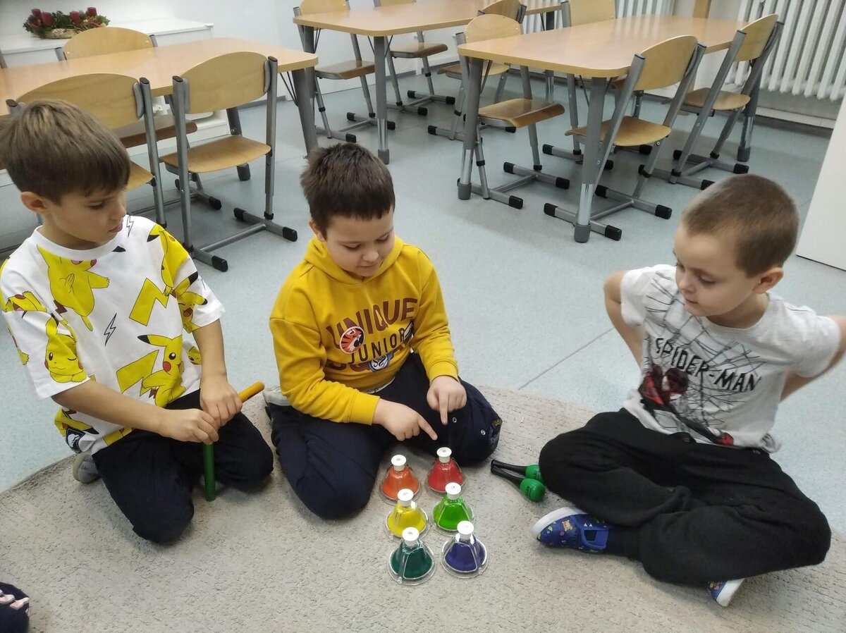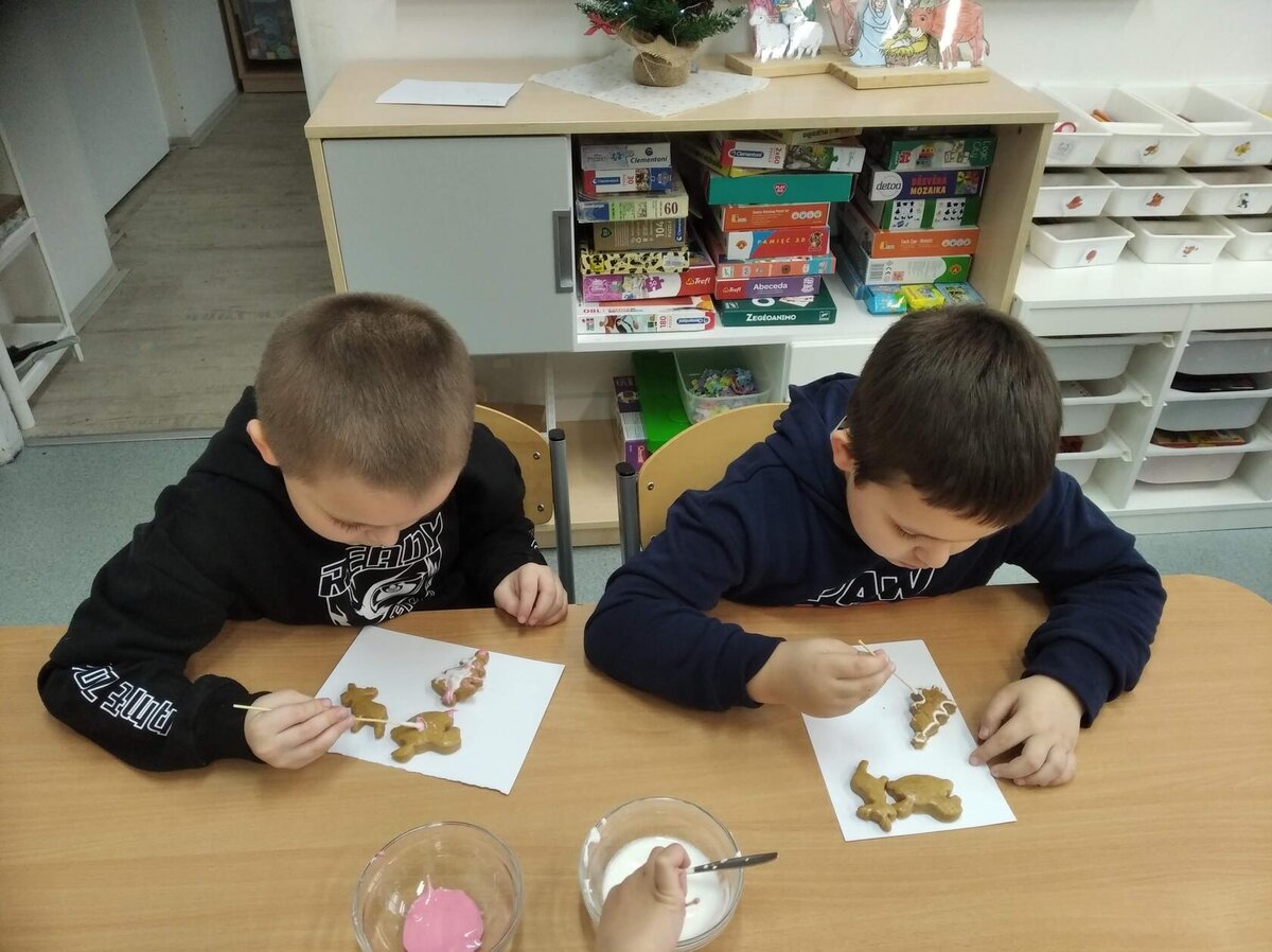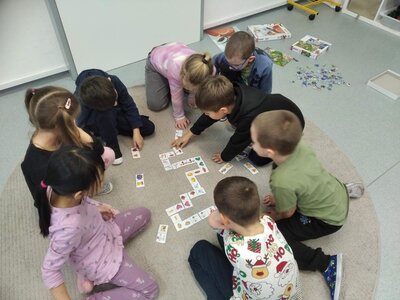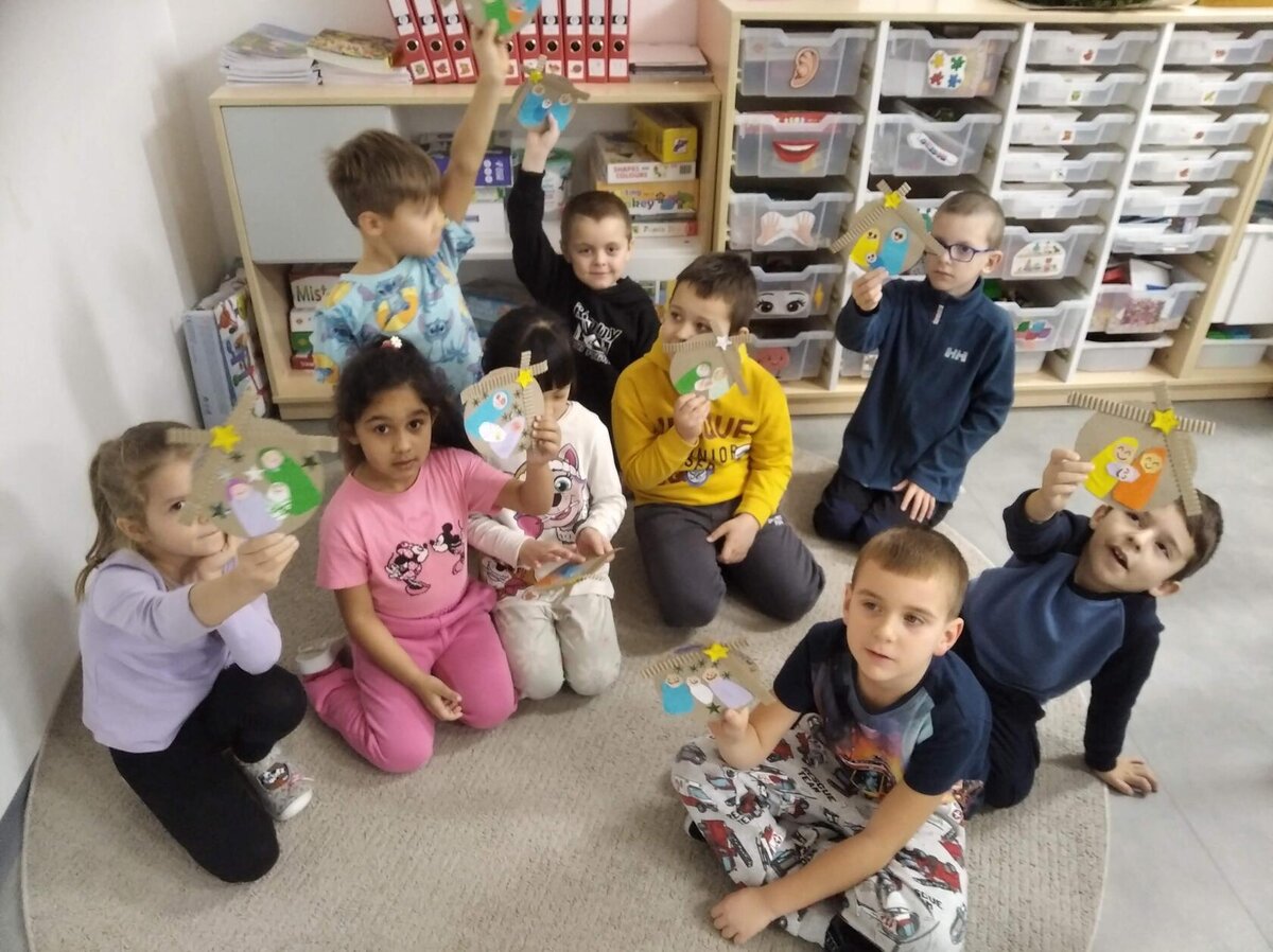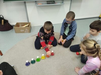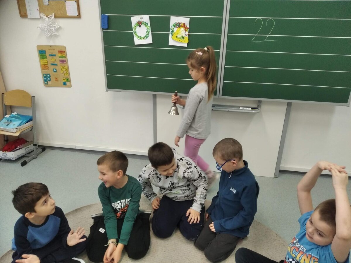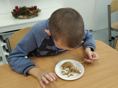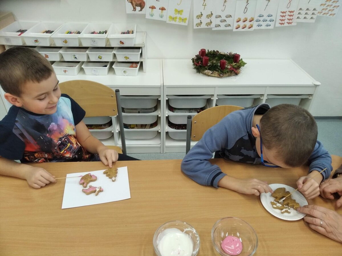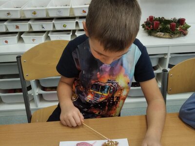 Nezaháleli jsme ani s učením. Ve zrakovém vnímání jsme trénovali barevné řady, hráli Kimovu hru, překreslovali čárky mezi body a dokreslovali chybějící části na obrázcích. Grafomotorické prvky jsme procvičovali na velké tabuli, na stíratelných tabulkách i na papíře. Zaměřili jsme se na čerty a anděly, jednotažky a horní oblouky. V oblasti matematického vnímání jsme počítali rozinky na cukroví, přiřazovali správně počty k puntíkům a počítali pomocí ořechů. Řečové dovednosti jsme rozvíjeli při práci s knížkou a průběžně procvičovali slabiky i počáteční hlásky. Vyzkoušeli si Orffovy hudební nástroje a poznali kouzlo zvonečků, kterému patří vždy jeden tón.