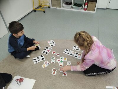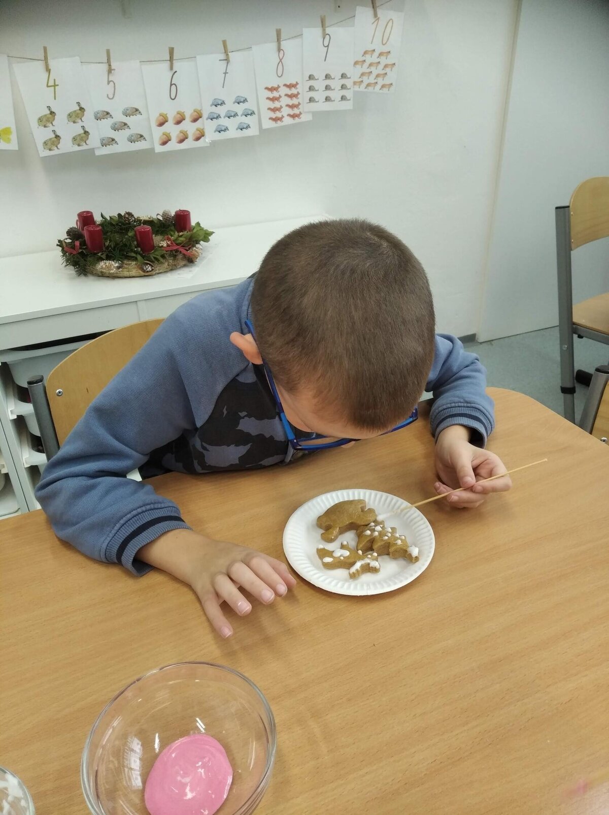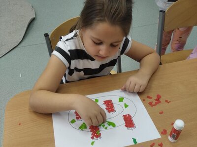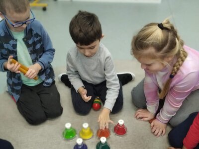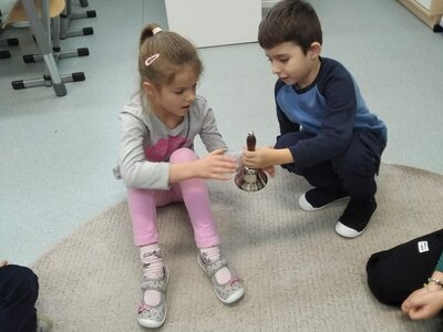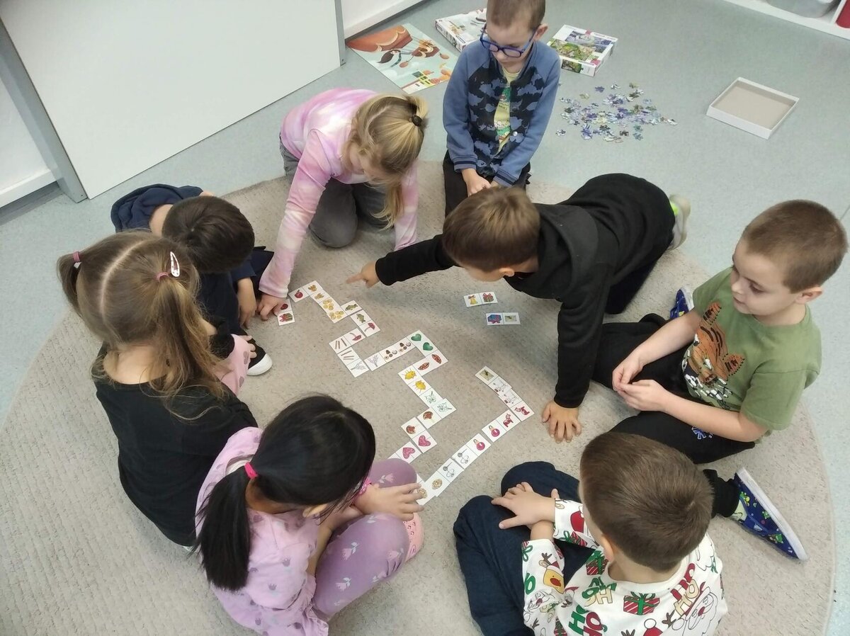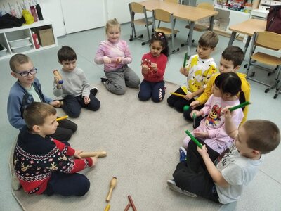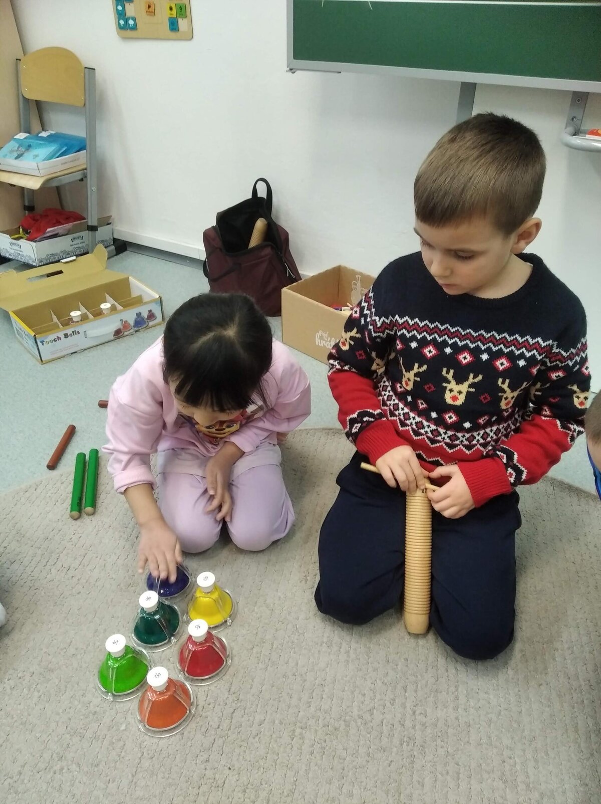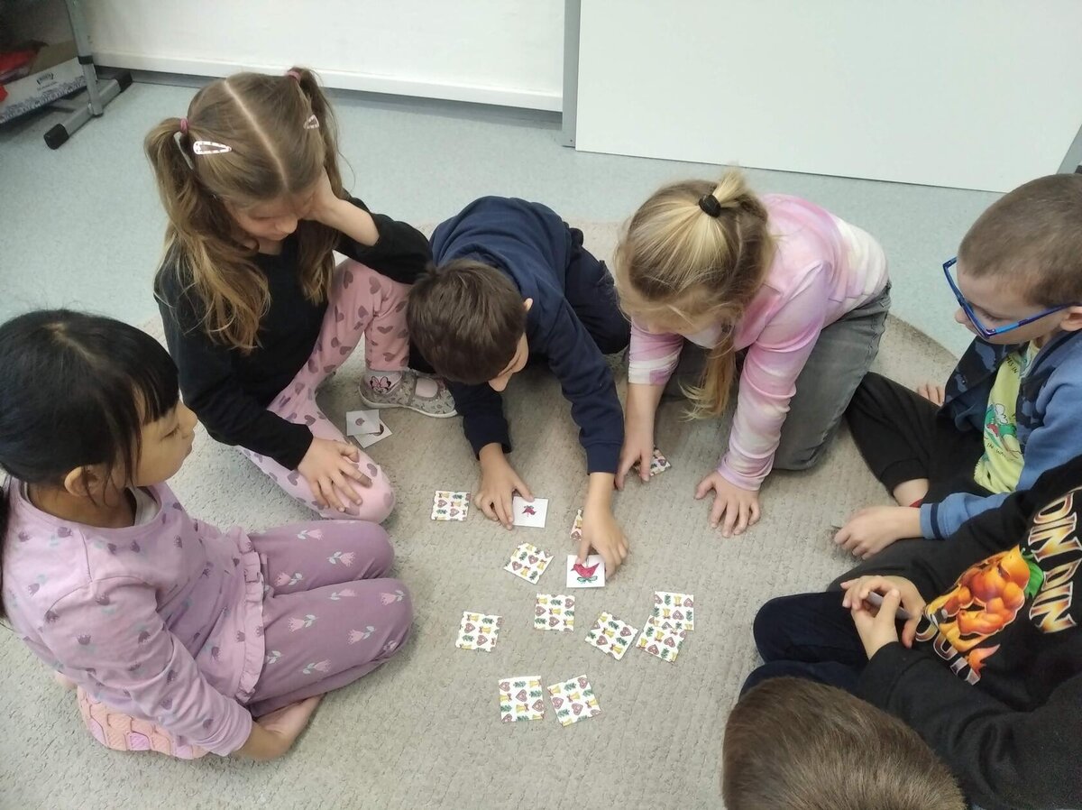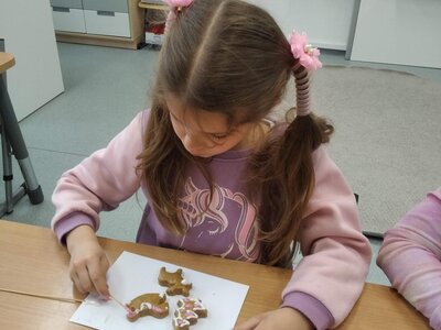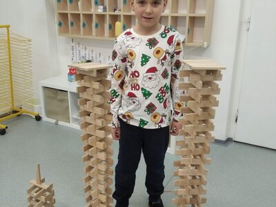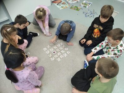 Nezaháleli jsme ani s učením. Ve zrakovém vnímání jsme trénovali barevné řady, hráli Kimovu hru, překreslovali čárky mezi body a dokreslovali chybějící části na obrázcích. Grafomotorické prvky jsme procvičovali na velké tabuli, na stíratelných tabulkách i na papíře. Zaměřili jsme se na čerty a anděly, jednotažky a horní oblouky. V oblasti matematického vnímání jsme počítali rozinky na cukroví, přiřazovali správně počty k puntíkům a počítali pomocí ořechů. Řečové dovednosti jsme rozvíjeli při práci s knížkou a průběžně procvičovali slabiky i počáteční hlásky. Vyzkoušeli si Orffovy hudební nástroje a poznali kouzlo zvonečků, kterému patří vždy jeden tón.