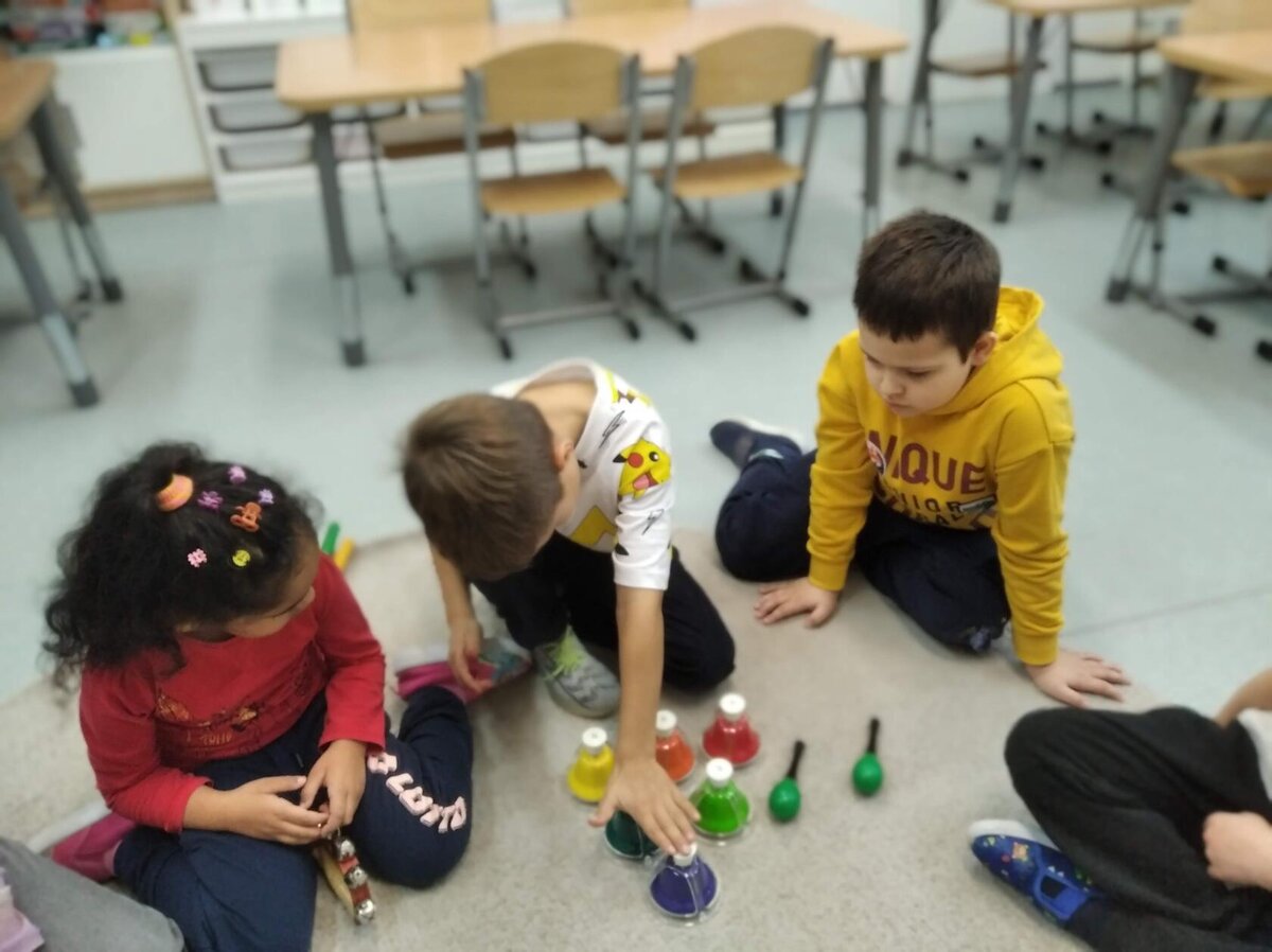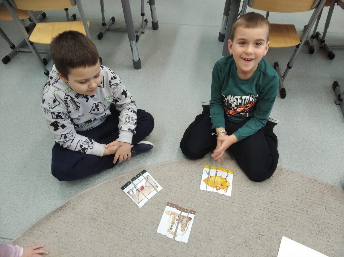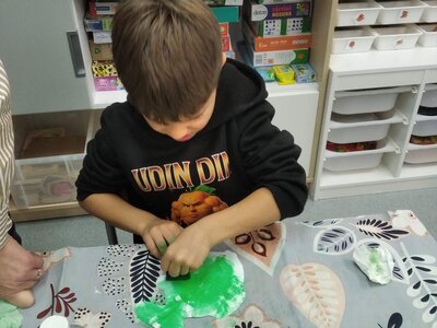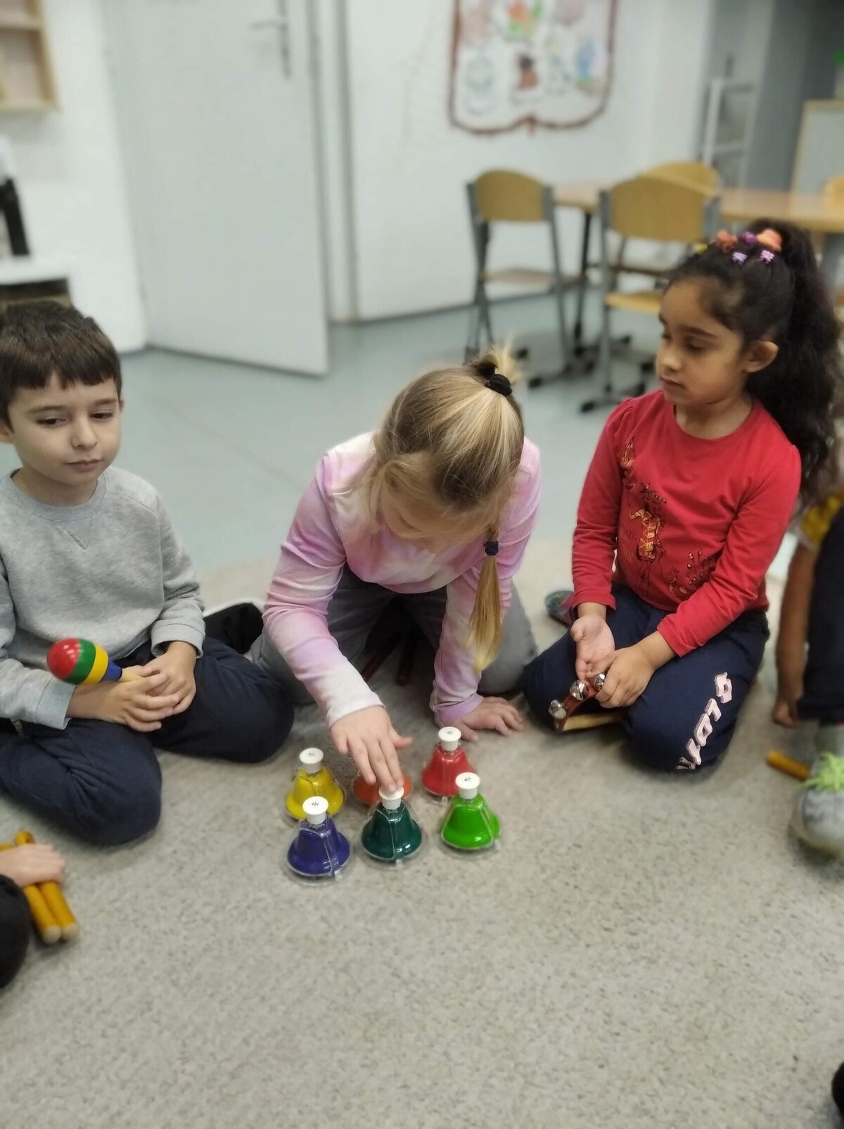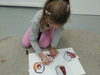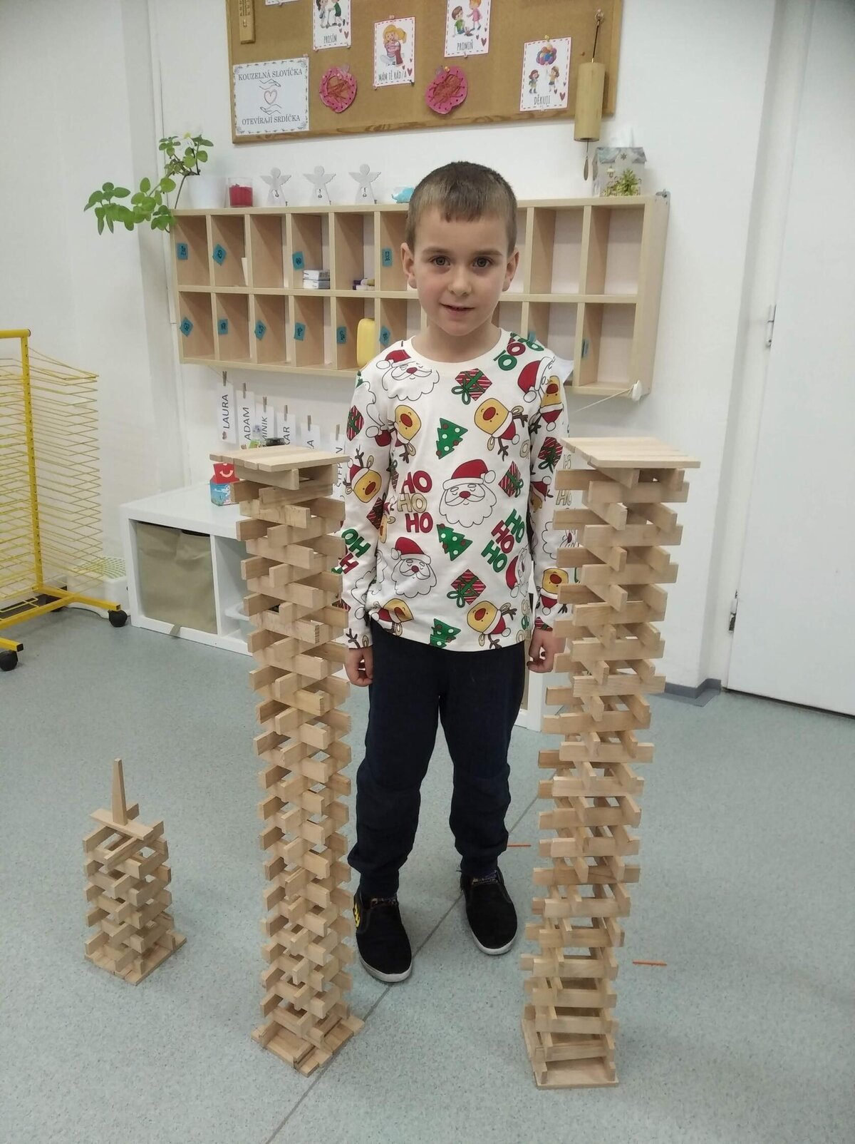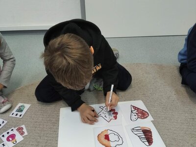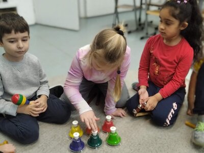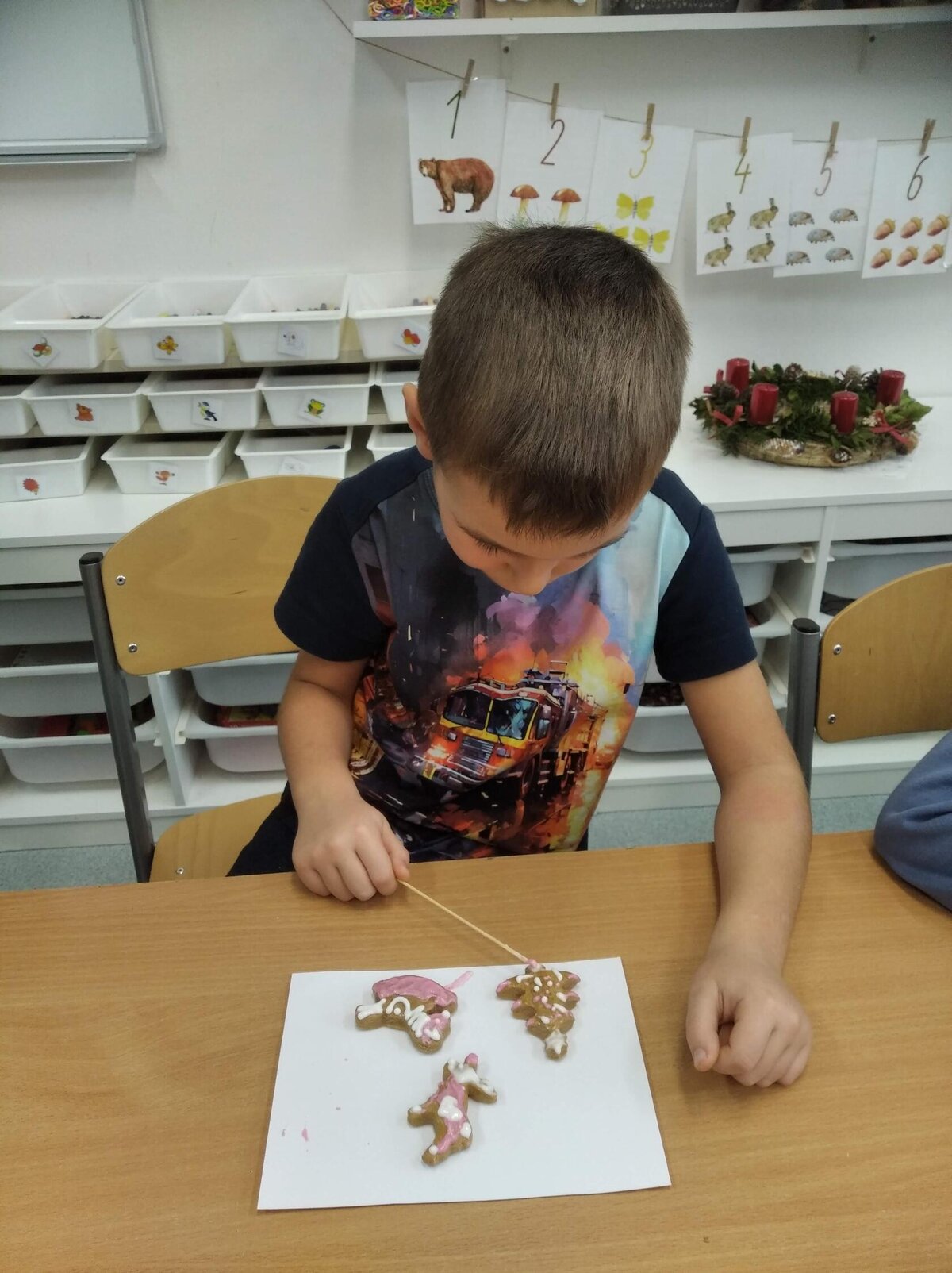 Nezaháleli jsme ani s učením. Ve zrakovém vnímání jsme trénovali barevné řady, hráli Kimovu hru, překreslovali čárky mezi body a dokreslovali chybějící části na obrázcích. Grafomotorické prvky jsme procvičovali na velké tabuli, na stíratelných tabulkách i na papíře. Zaměřili jsme se na čerty a anděly, jednotažky a horní oblouky. V oblasti matematického vnímání jsme počítali rozinky na cukroví, přiřazovali správně počty k puntíkům a počítali pomocí ořechů. Řečové dovednosti jsme rozvíjeli při práci s knížkou a průběžně procvičovali slabiky i počáteční hlásky. Vyzkoušeli si Orffovy hudební nástroje a poznali kouzlo zvonečků, kterému patří vždy jeden tón.