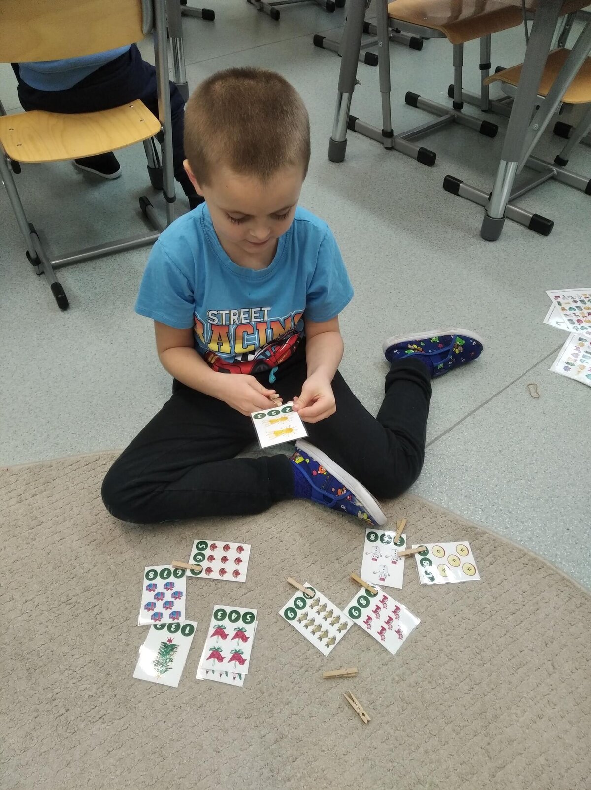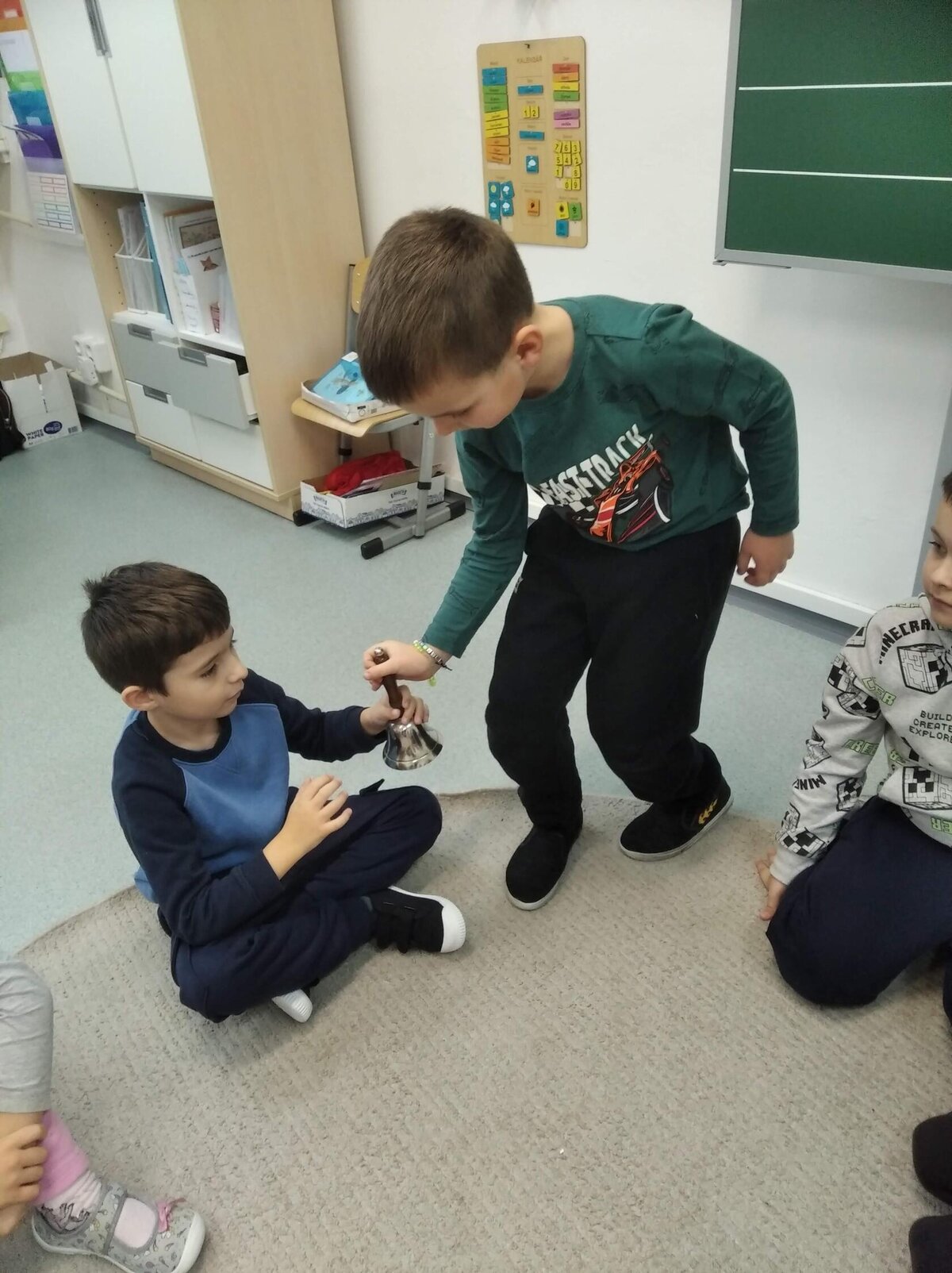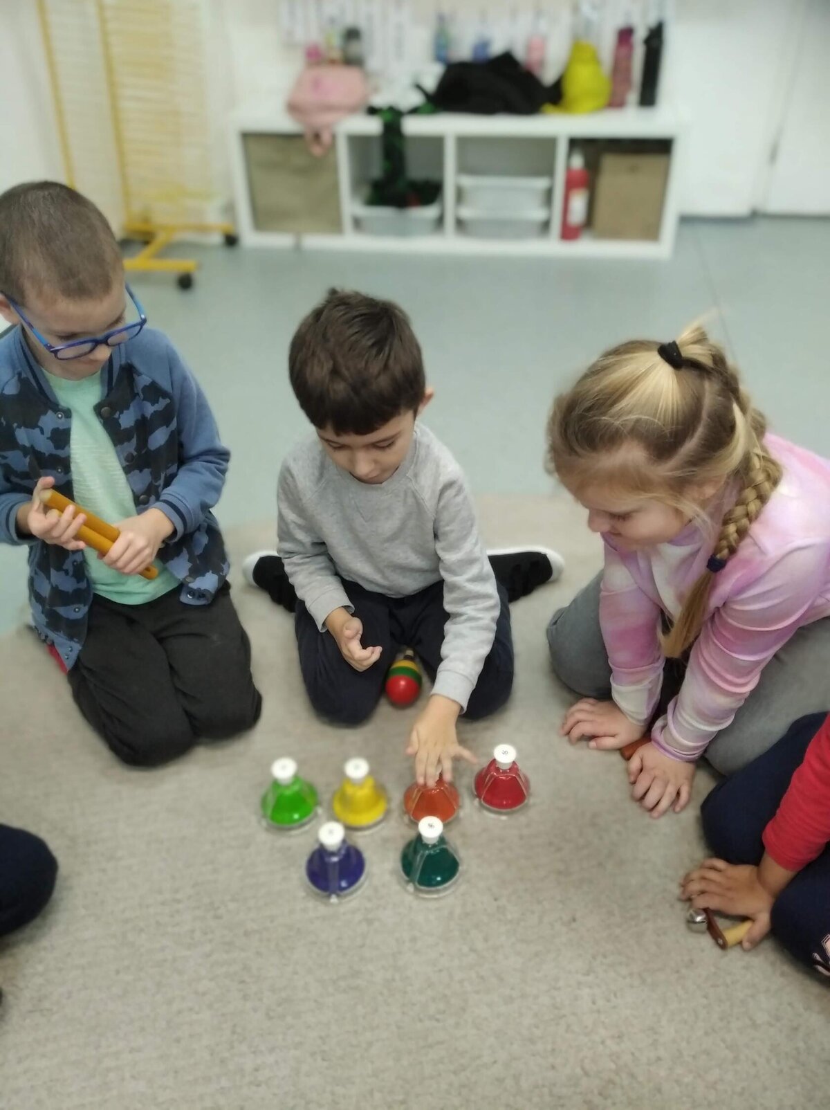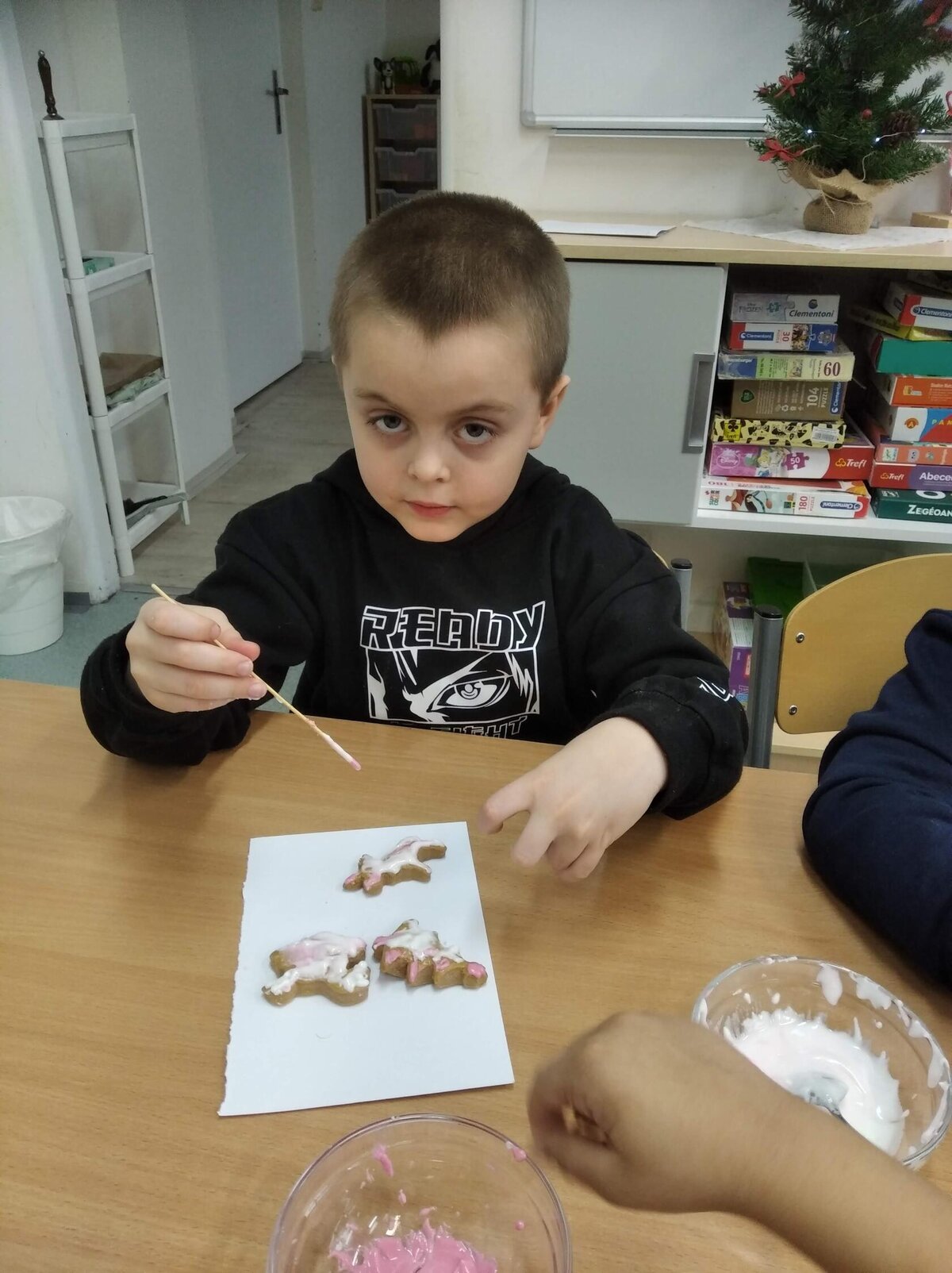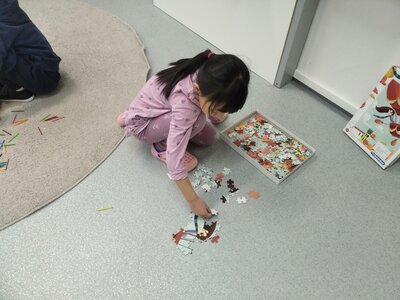 Nezaháleli jsme ani s učením. Ve zrakovém vnímání jsme trénovali barevné řady, hráli Kimovu hru, překreslovali čárky mezi body a dokreslovali chybějící části na obrázcích. Grafomotorické prvky jsme procvičovali na velké tabuli, na stíratelných tabulkách i na papíře. Zaměřili jsme se na čerty a anděly, jednotažky a horní oblouky. V oblasti matematického vnímání jsme počítali rozinky na cukroví, přiřazovali správně počty k puntíkům a počítali pomocí ořechů. Řečové dovednosti jsme rozvíjeli při práci s knížkou a průběžně procvičovali slabiky i počáteční hlásky. Vyzkoušeli si Orffovy hudební nástroje a poznali kouzlo zvonečků, kterému patří vždy jeden tón.