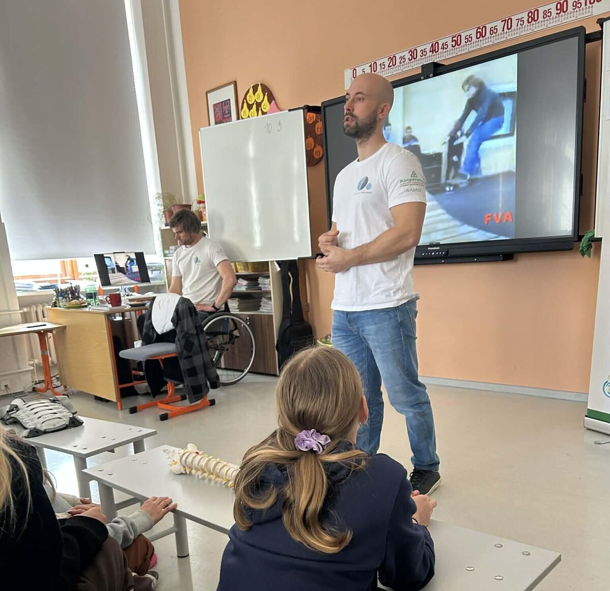 Ve škole jsme přivítali Martina, který žákům otevřeně sdílel svůj osobní příběh. Jeho vyprávění dětem přiblížilo, že život na vozíku není jen o omezené mobilitě, ale také o celé řadě dalších výzev, které si zdravý člověk často neuvědomuje.