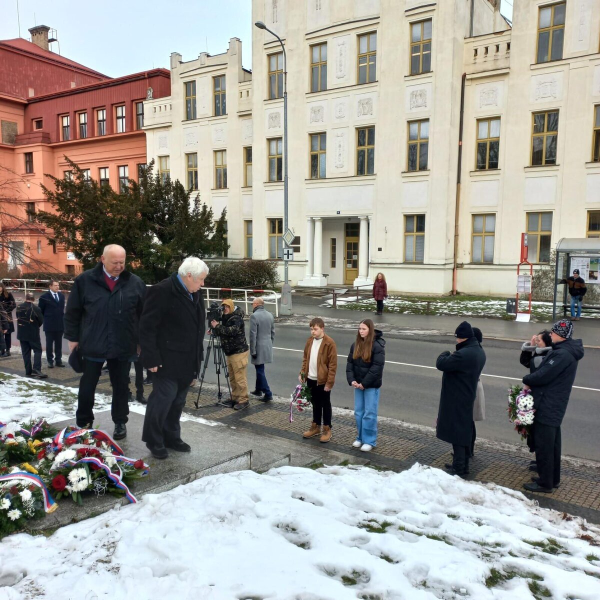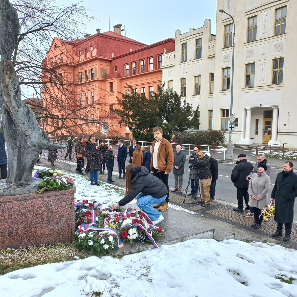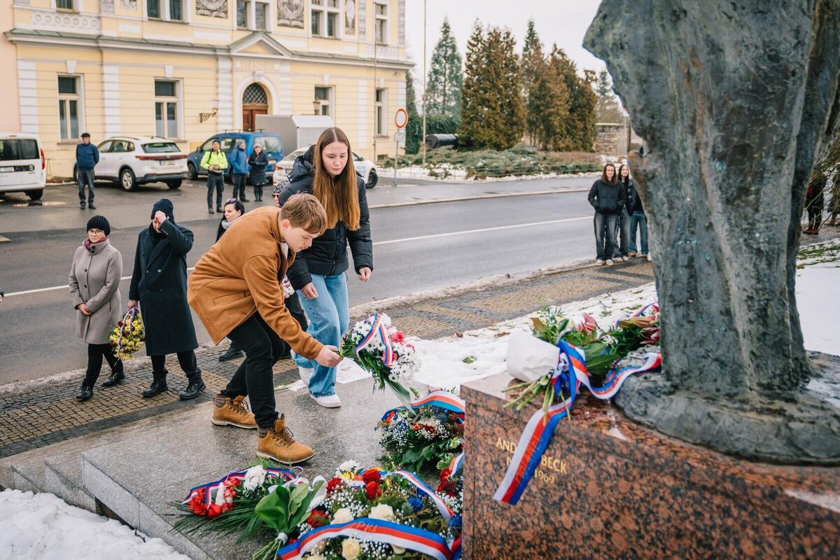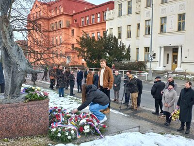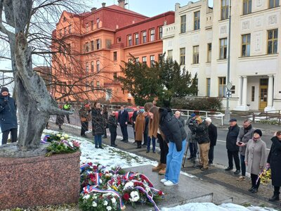 Po vzpomínkových projevech následovalo položení květin u památníku od sochaře Andráse Becka, který stojí před původní budovou mělnického gymnázia. Pokládání květin se zúčastnili také zástupci naší školy – žáci 9. tříd, kteří důstojně vzdali hold památce za všechny přítomné studenty a žáky.