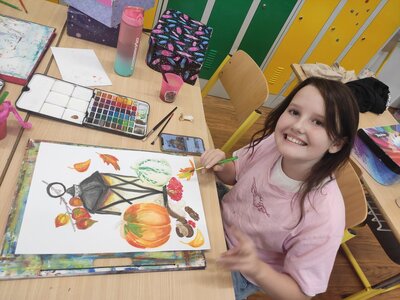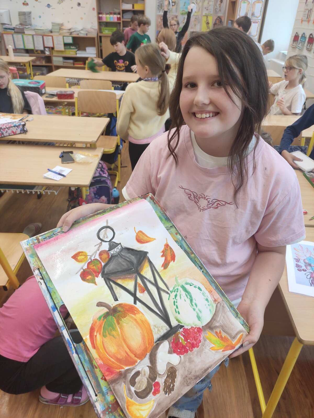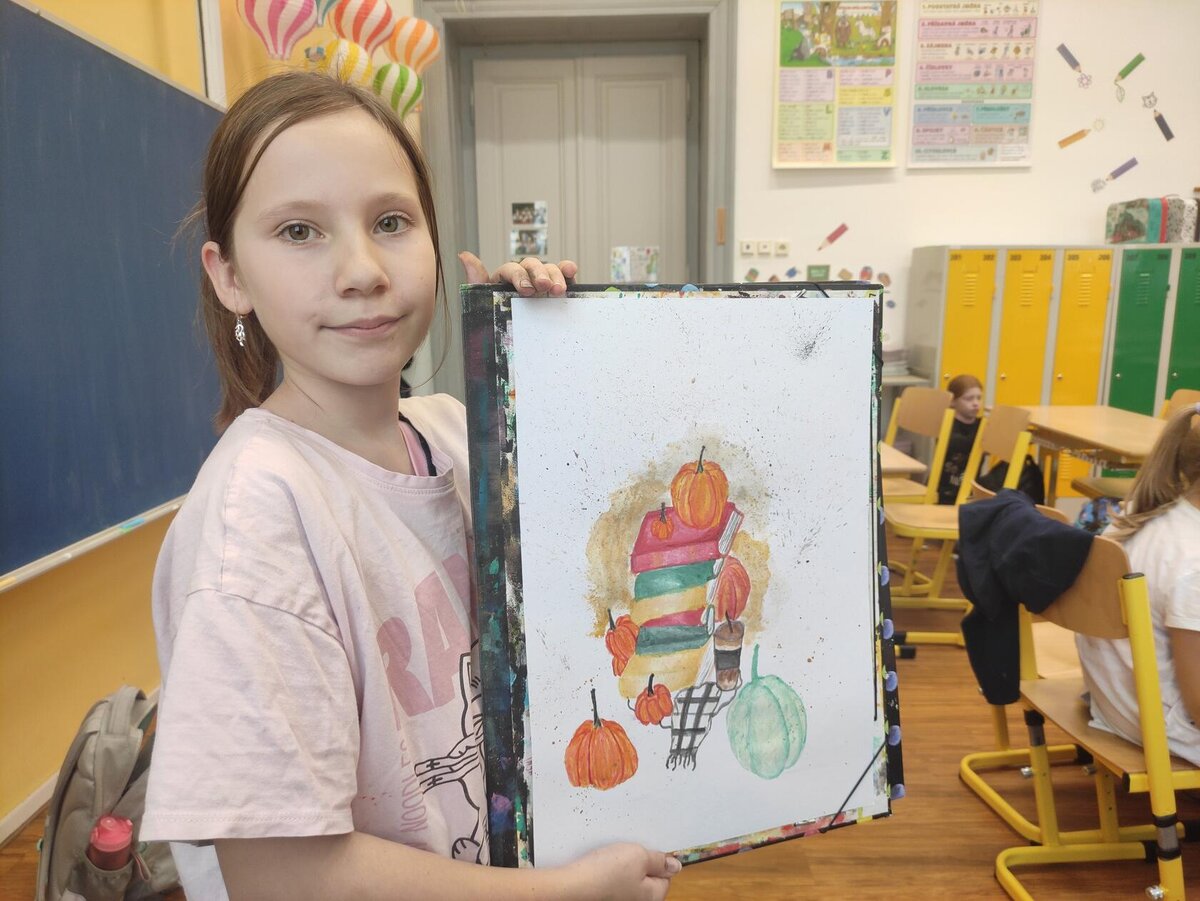 V listopadu žáci naší třídy tvořili krásná zátiší s dýněmi pomocí suchého pastelu. Volili převážně teplé odstíny oranžové a hnědé. Symbolicky tak oslavili Halloween.