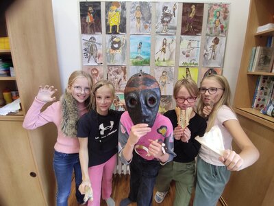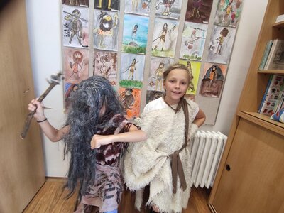 Po vstupu bránou času se chodby školy rozezněly halekáním divokých tlup, tajemnou hudbou a smíchem dětí. Mladší žáci se s úžasem dozvídali, jak pravěcí lidé žili, čím se živili, jak se dorozumívali i jak si vyráběli nástroje a oděvy.