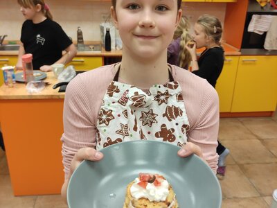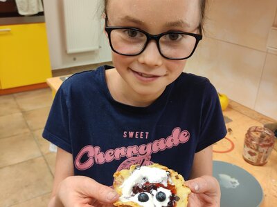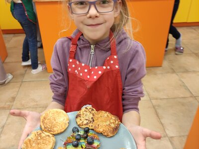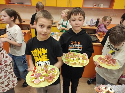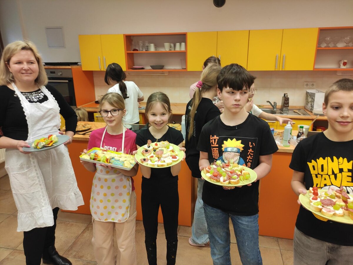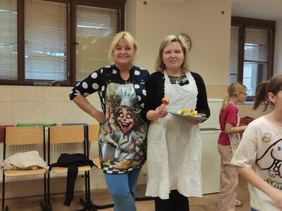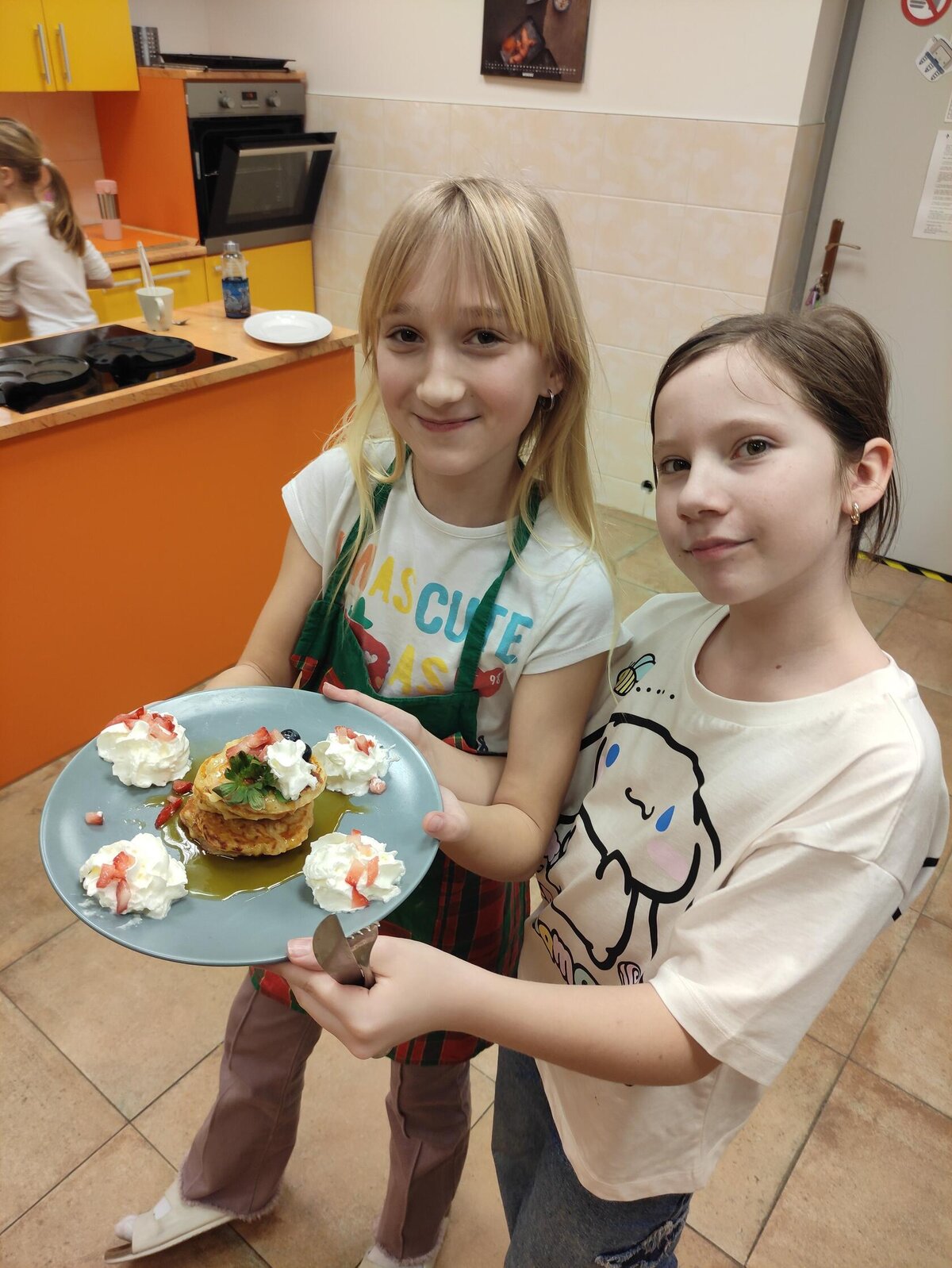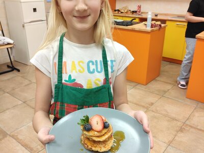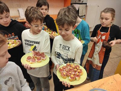 I v únoru se věnujeme vaření ve školní kuchyňce. Skupina dívek smaží jablkové lívance a kluci nám chystají ovocné špízy a zeleninové jednohubky.