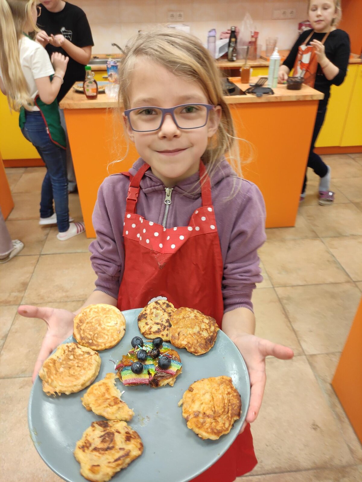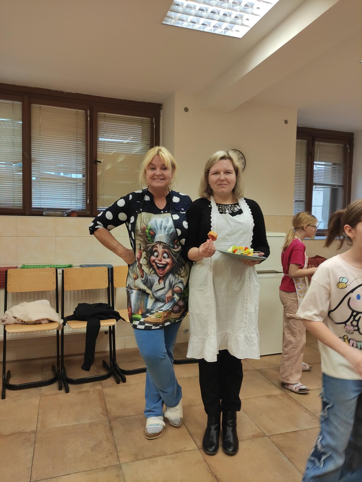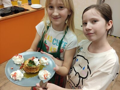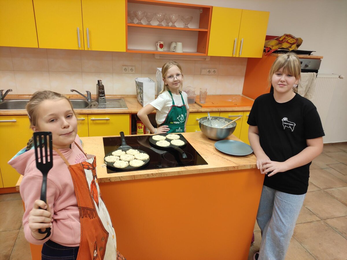 I v únoru se věnujeme vaření ve školní kuchyňce. Skupina dívek smaží jablkové lívance a kluci nám chystají ovocné špízy a zeleninové jednohubky.